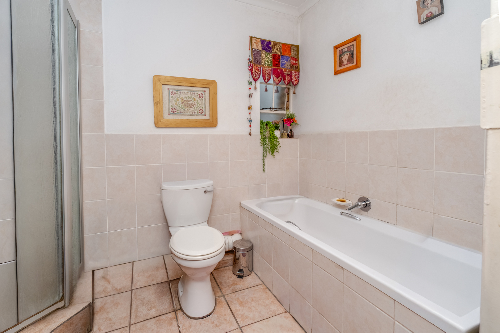 Main Ensuite Bathroom: Tiled floors, corner shower, bath, basin, and WC