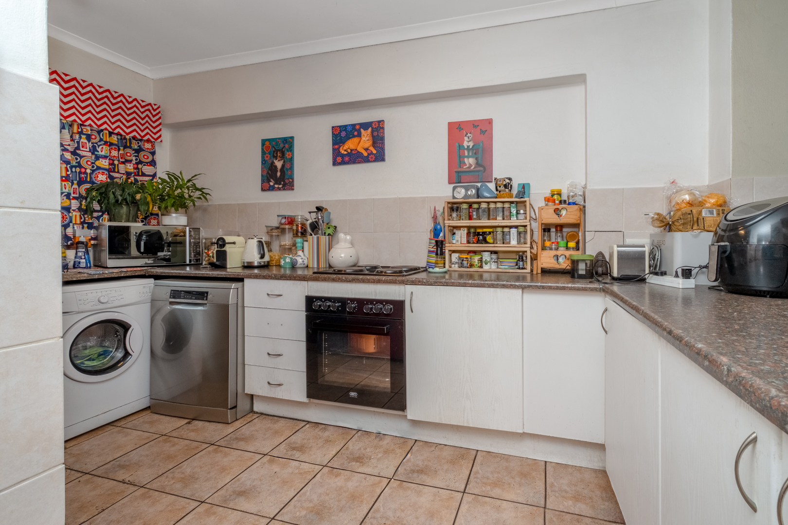 Kitchen features melamine countertops, plenty of built-in cupboard space, an electric stove and electric oven