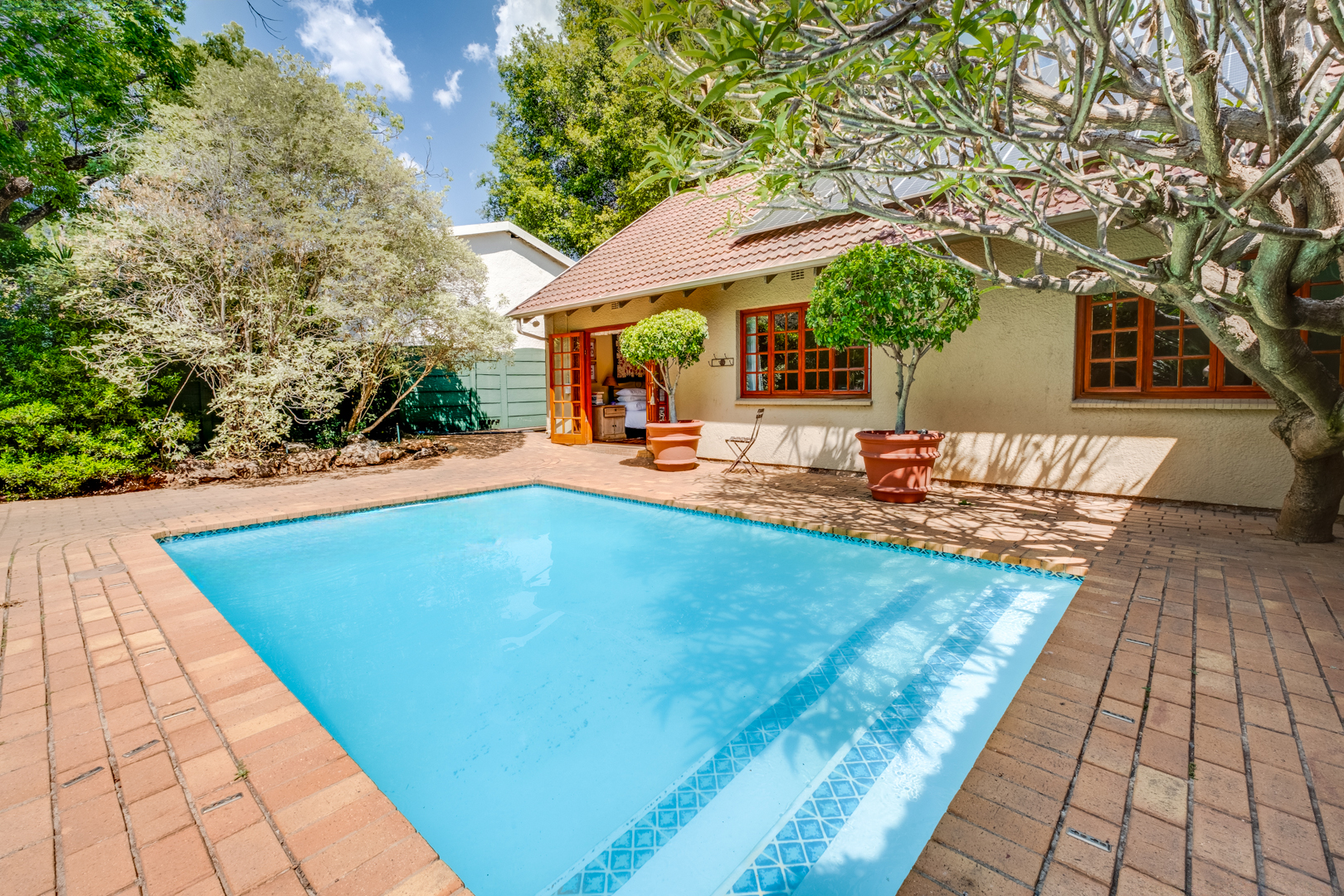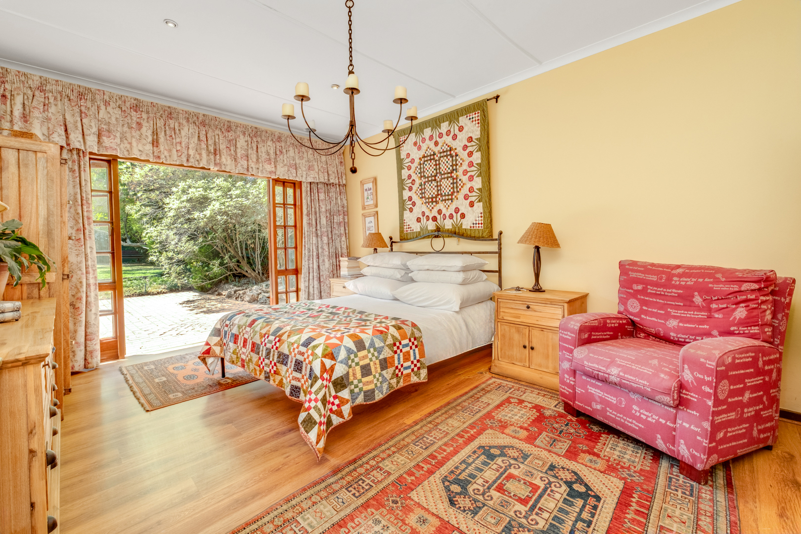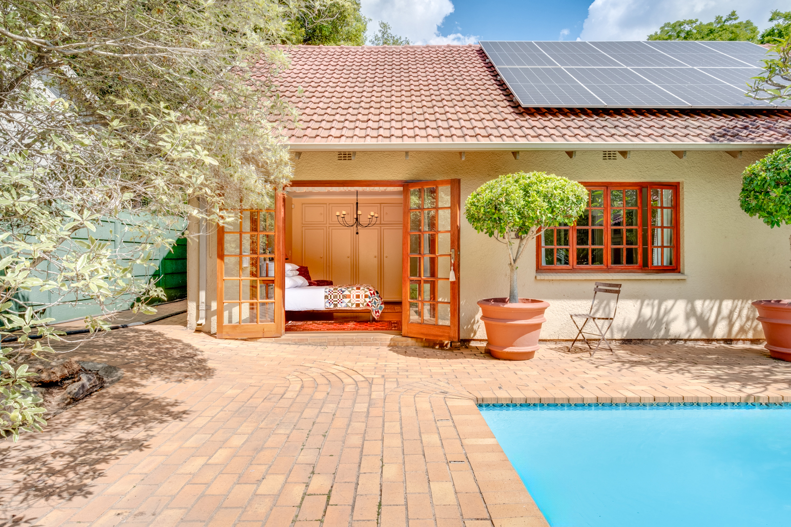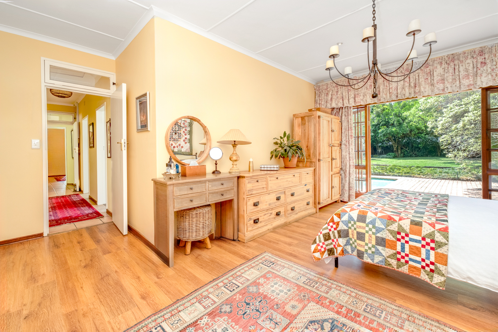 Main bedroom with laminated flooring, extensive built-in cupboards including a walk-in section, and French doors leading to the garden and pool area