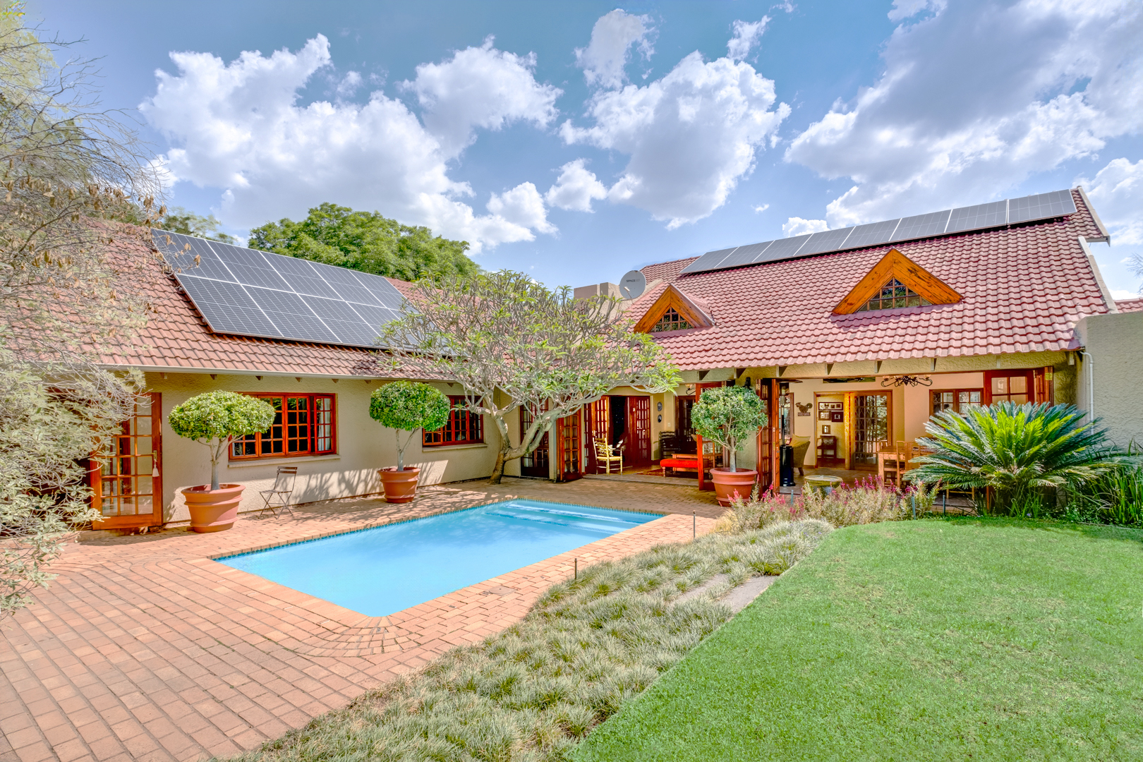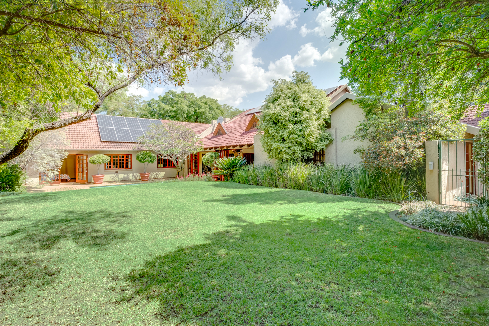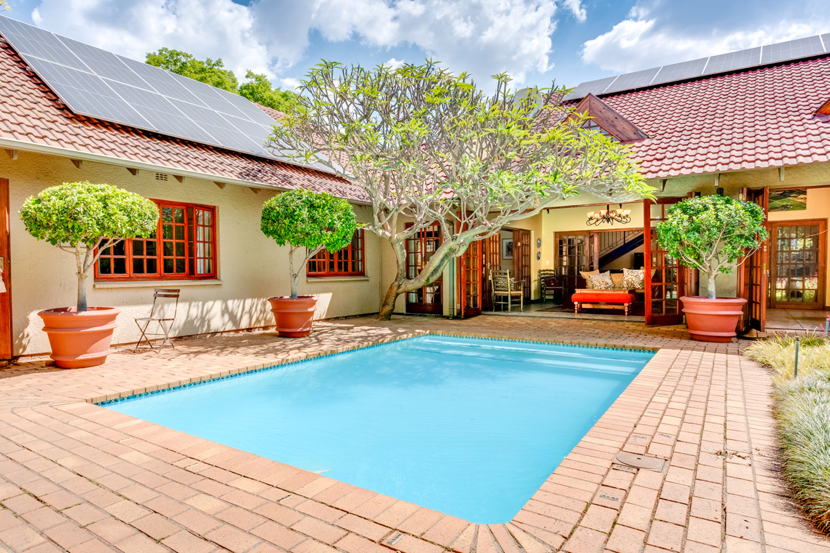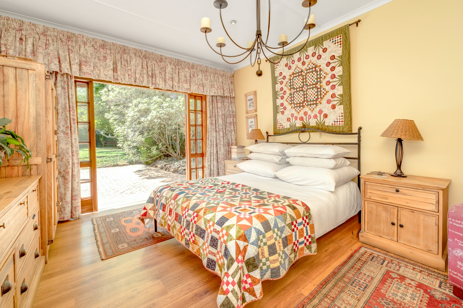 Main bedroom with laminated flooring, extensive built-in cupboards including a walk-in section, and French doors leading to the garden and pool area