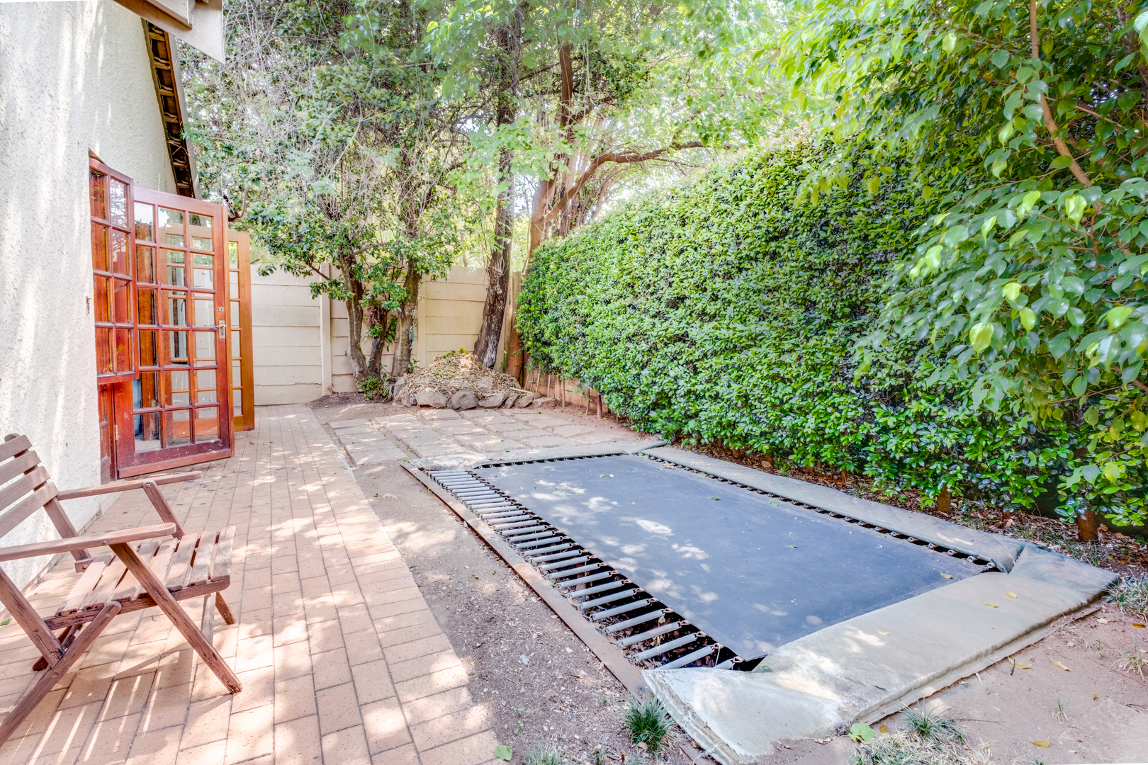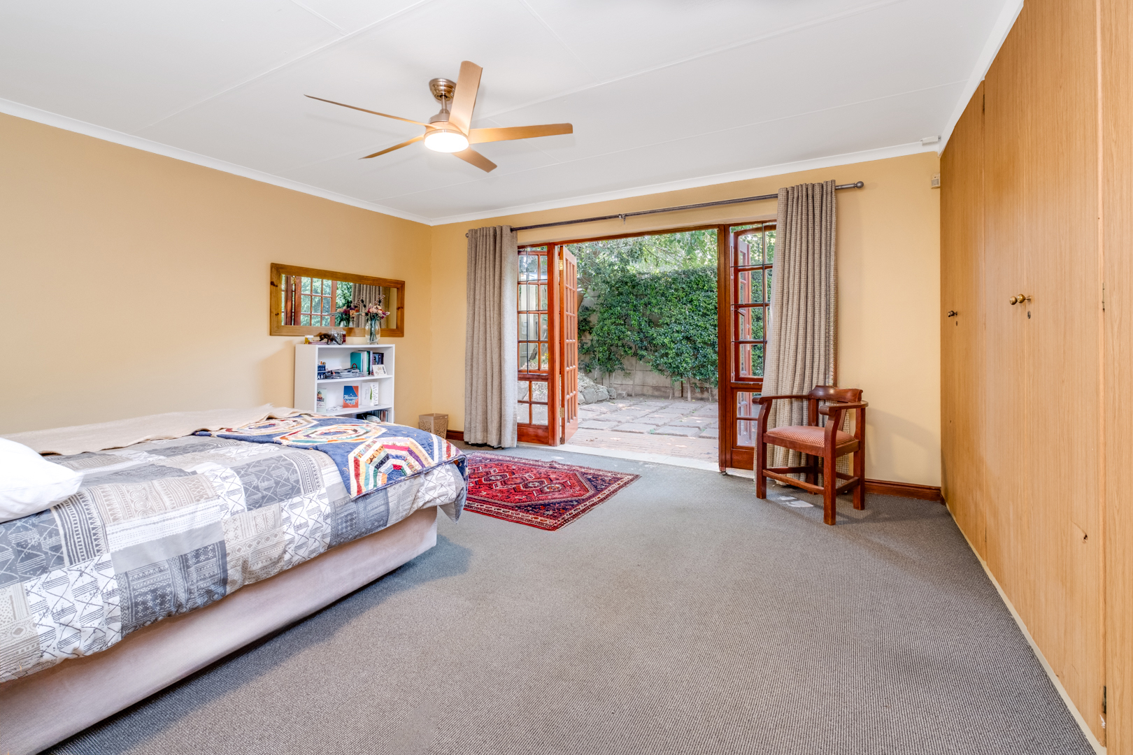 Bedroom with carpeted floors, generous built-in cupboards, and large north-facing cottage-pane French doors opening to the trampoline area
