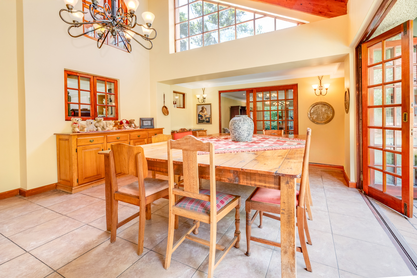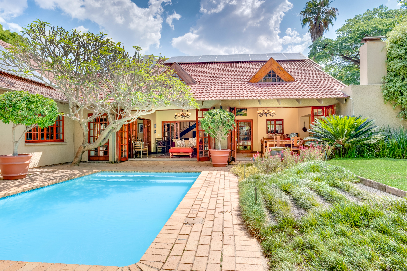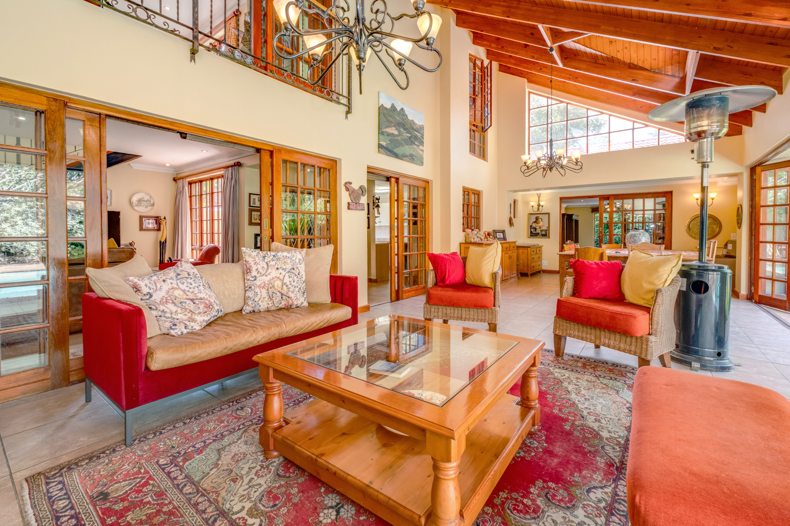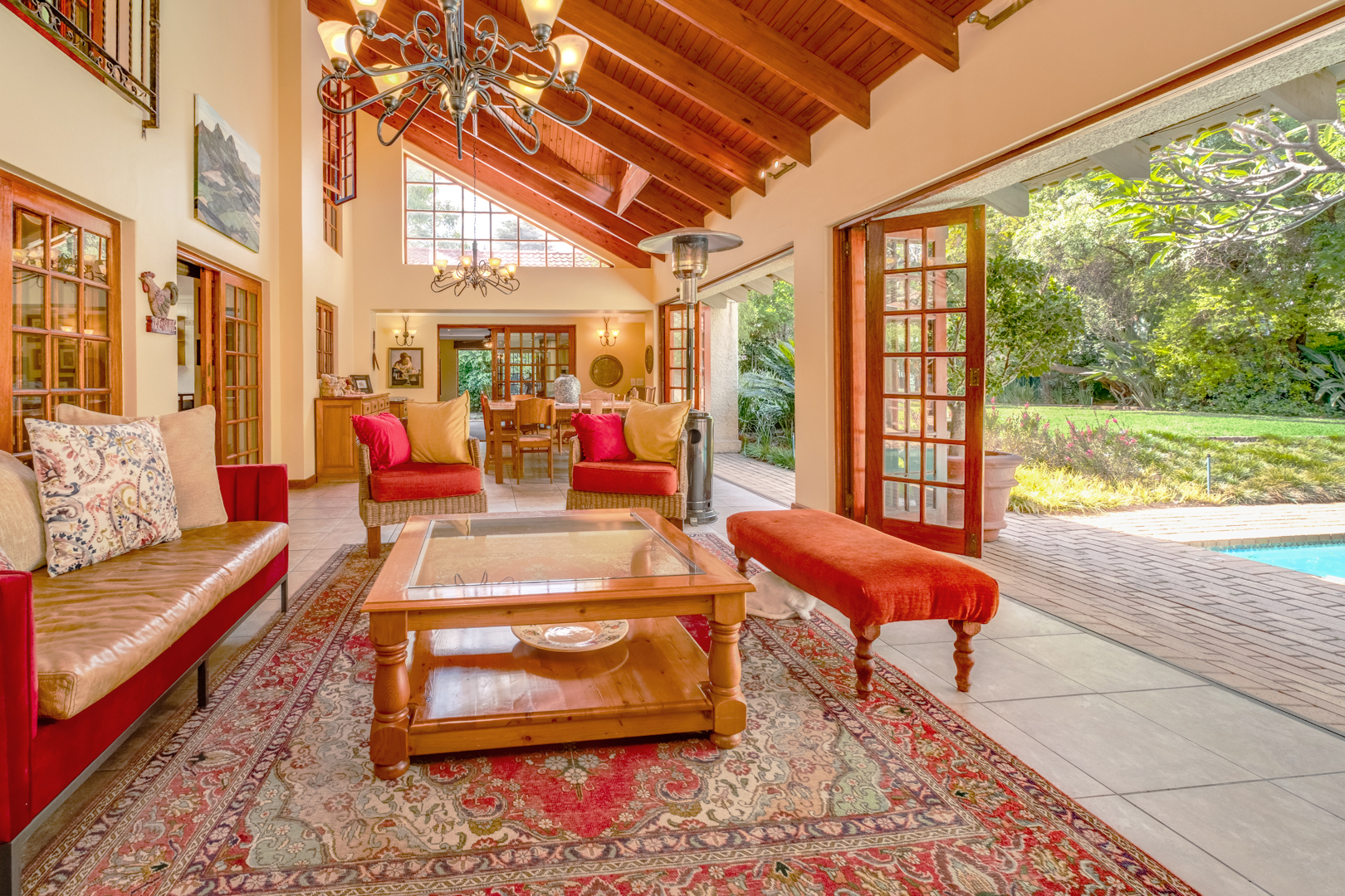 Enclosed patio area with tall exposed-beam ceilings, tiled floors, built-in gas braai, and stacking doors opening to the garden and pool area