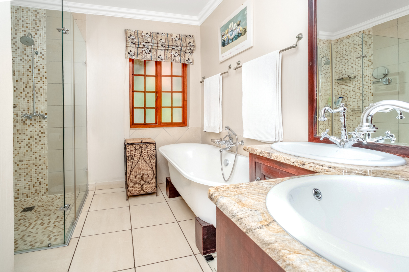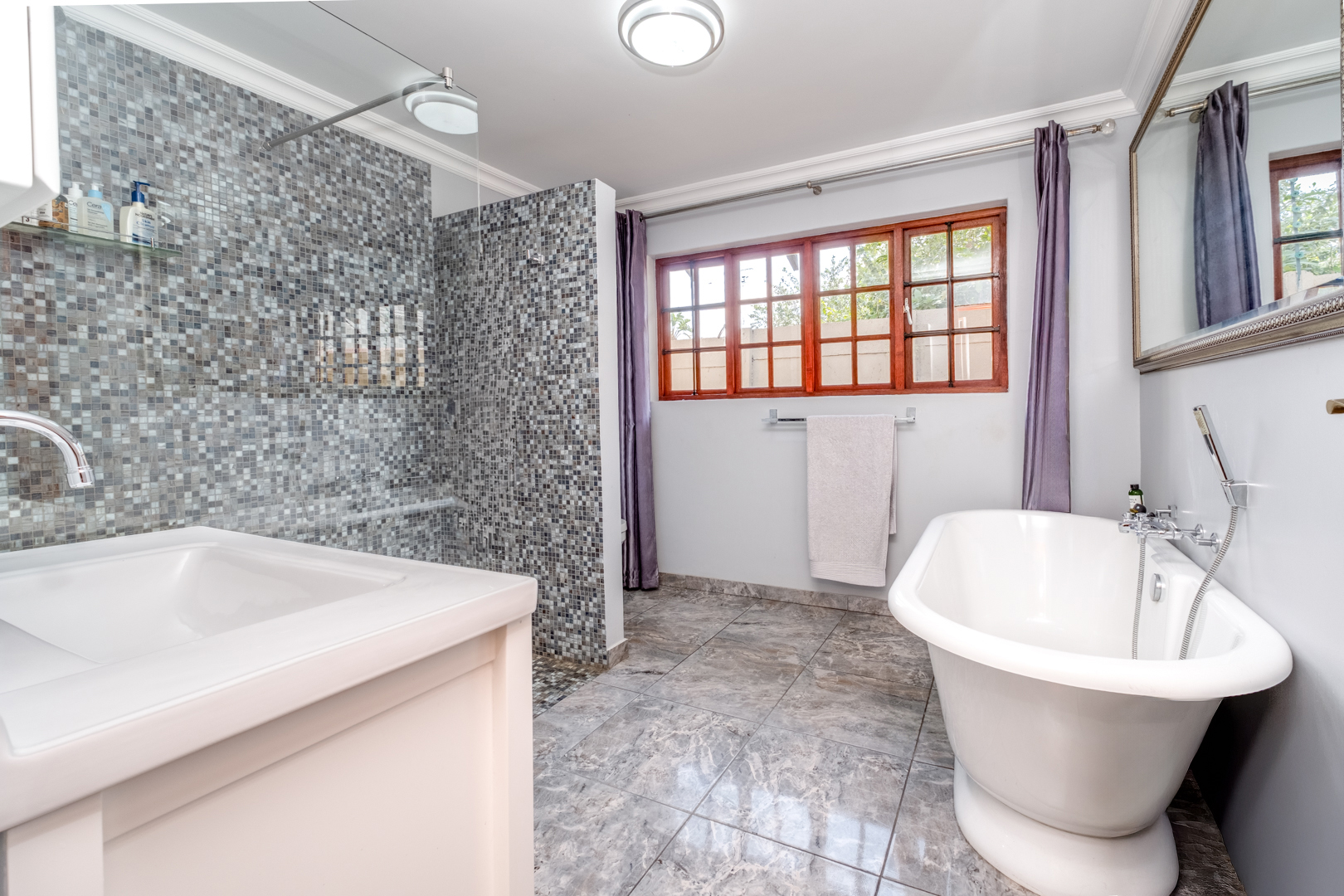 En-suite bathroom with tiled flooring, double basin, WC, east-facing window, and a large freestanding bath with hand shower attachment