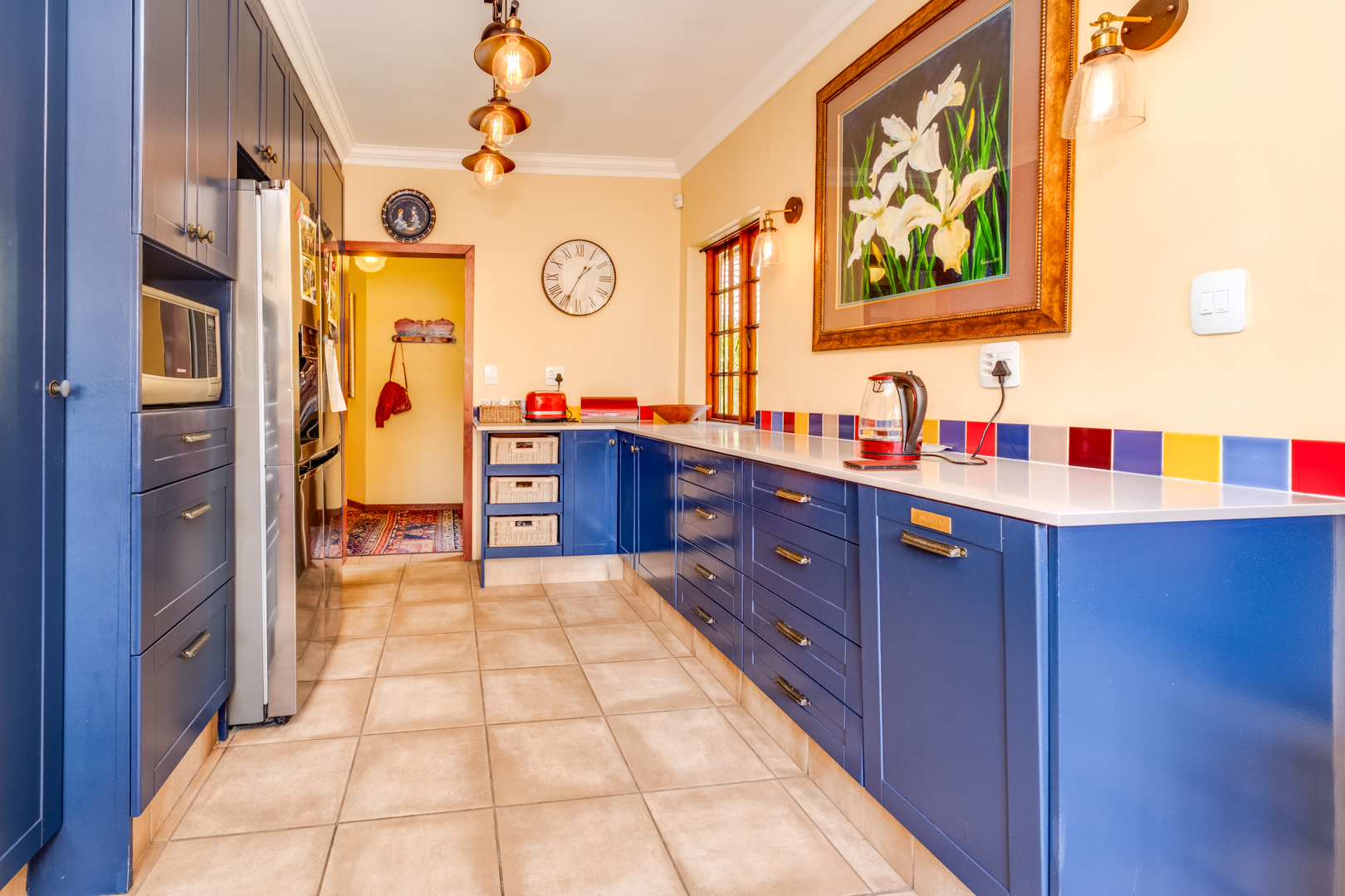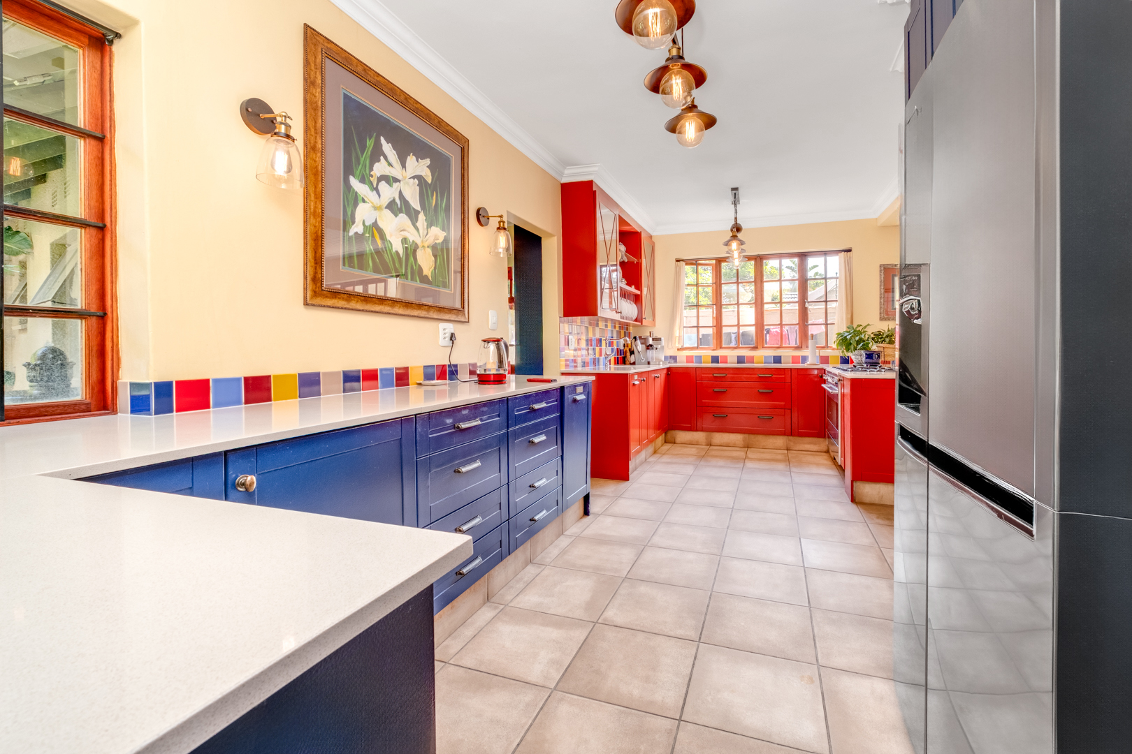 Kitchen features ample built-in cupboards, Caesarstone countertops, space for a double fridge with plumbing points, designated microwave space, and a 5-plate gas stove with an electric oven