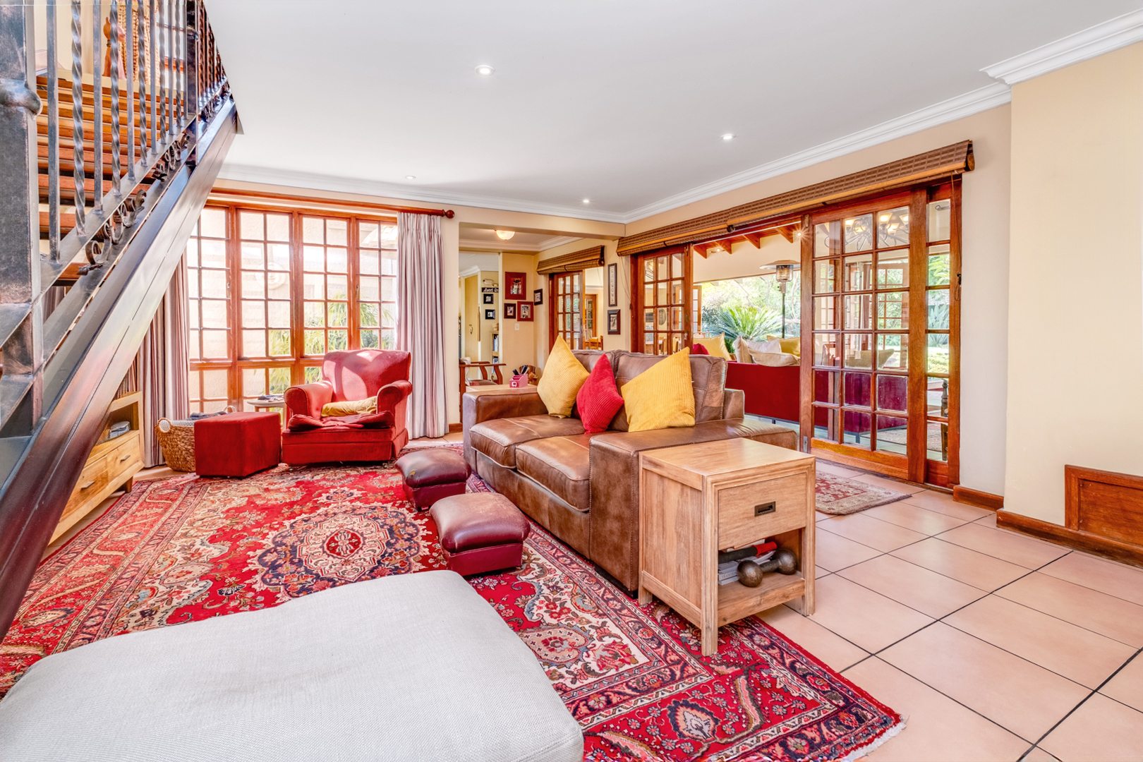 Second-story study with tiled flooring, built-in cupboards and shelving, and a Juliet balcony overlooking the patio area