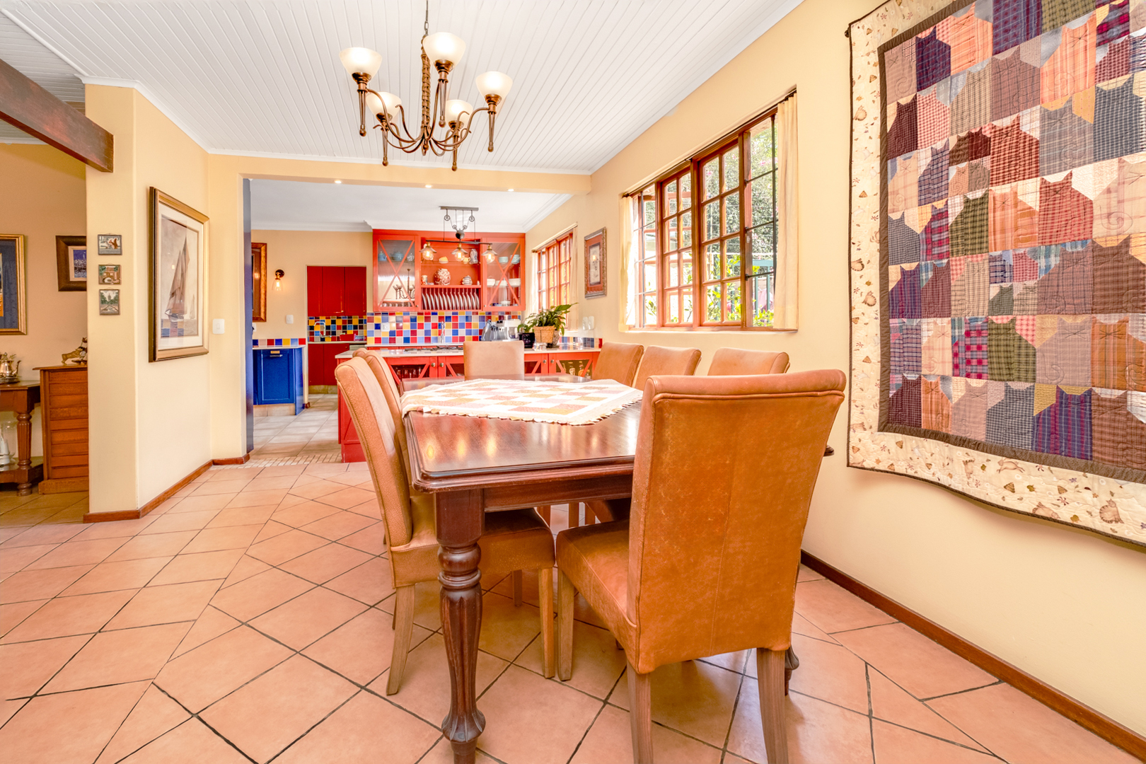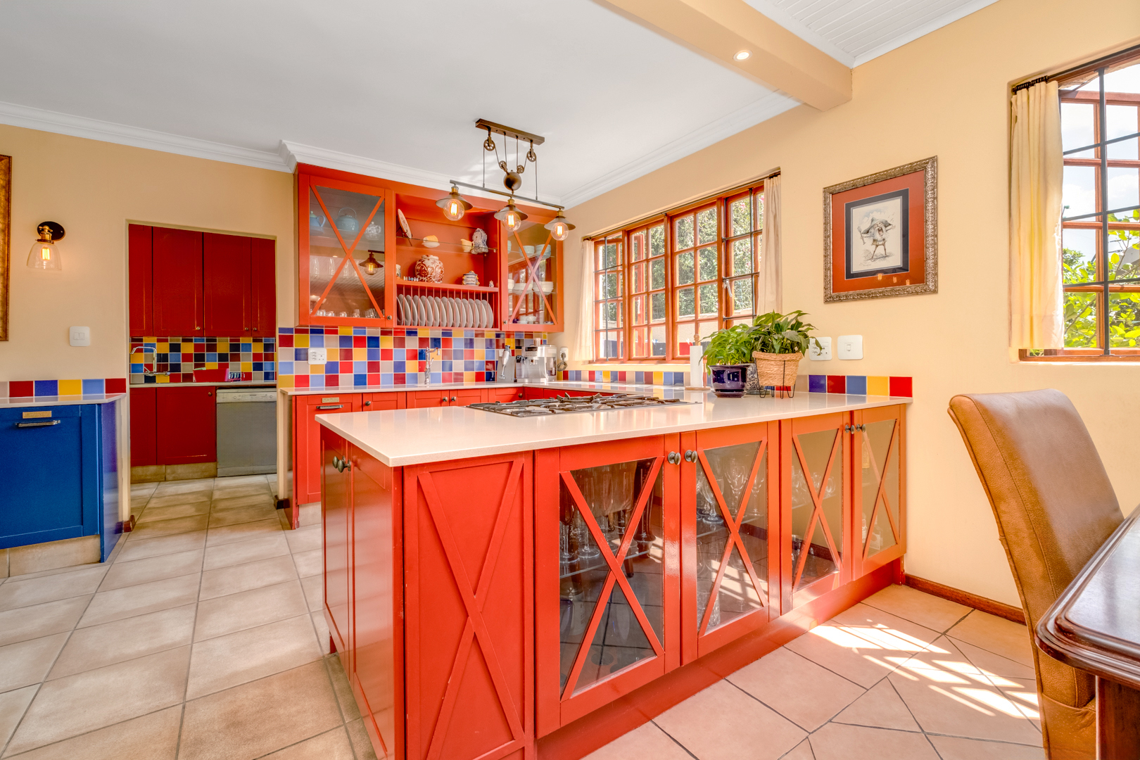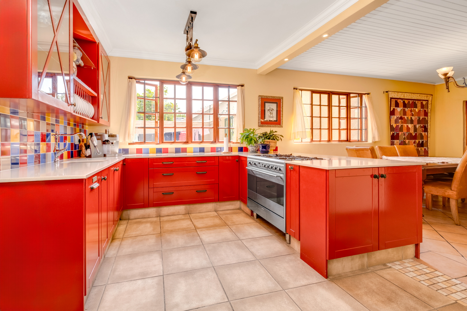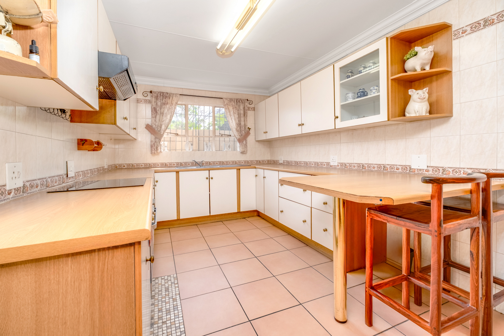 Second kitchen with melamine countertops, built-in cupboards, electric stove, oven, extractor fan, west-facing window with burglar bars, double sink, breakfast nook, and spacious pantry