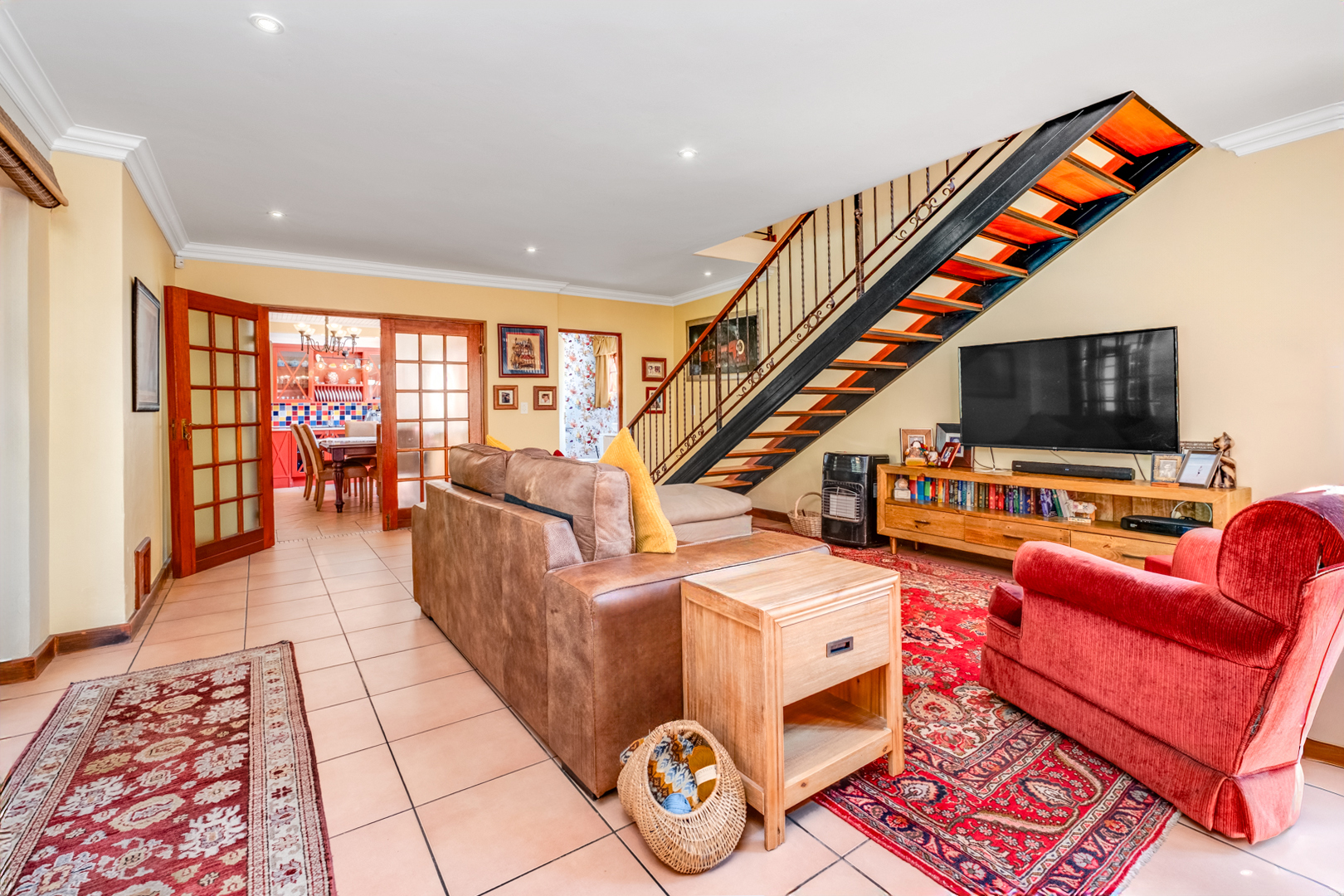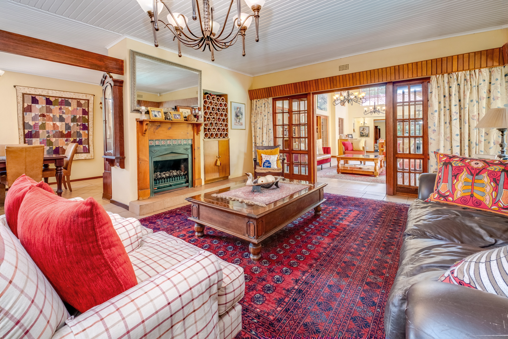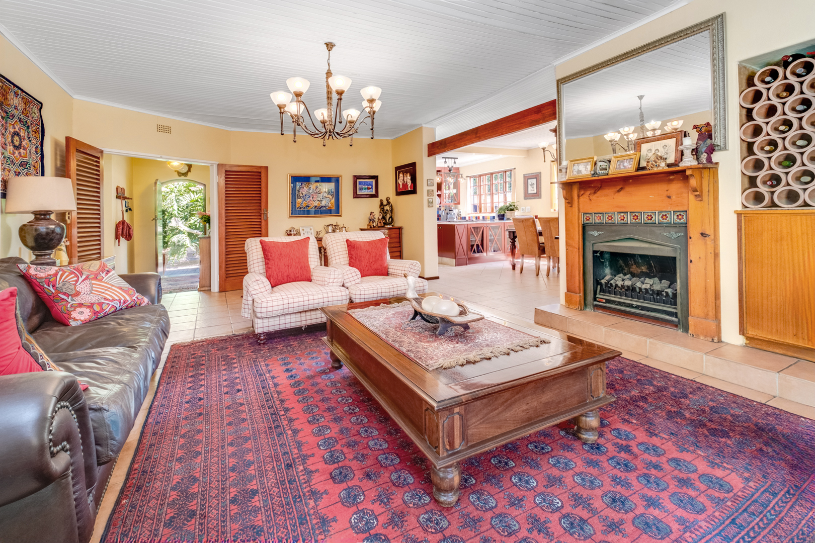 Open-plan dining area with tiled floors leading into the living room featuring a gas fireplace