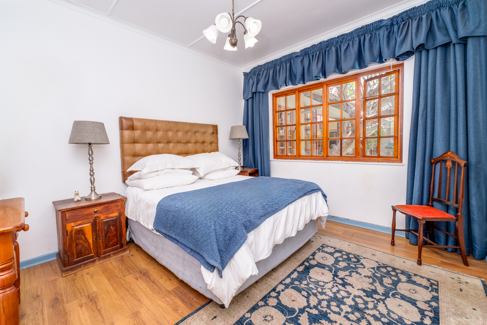 First bedroom with laminated flooring, cottage-pane window frames, and built-in cupboards