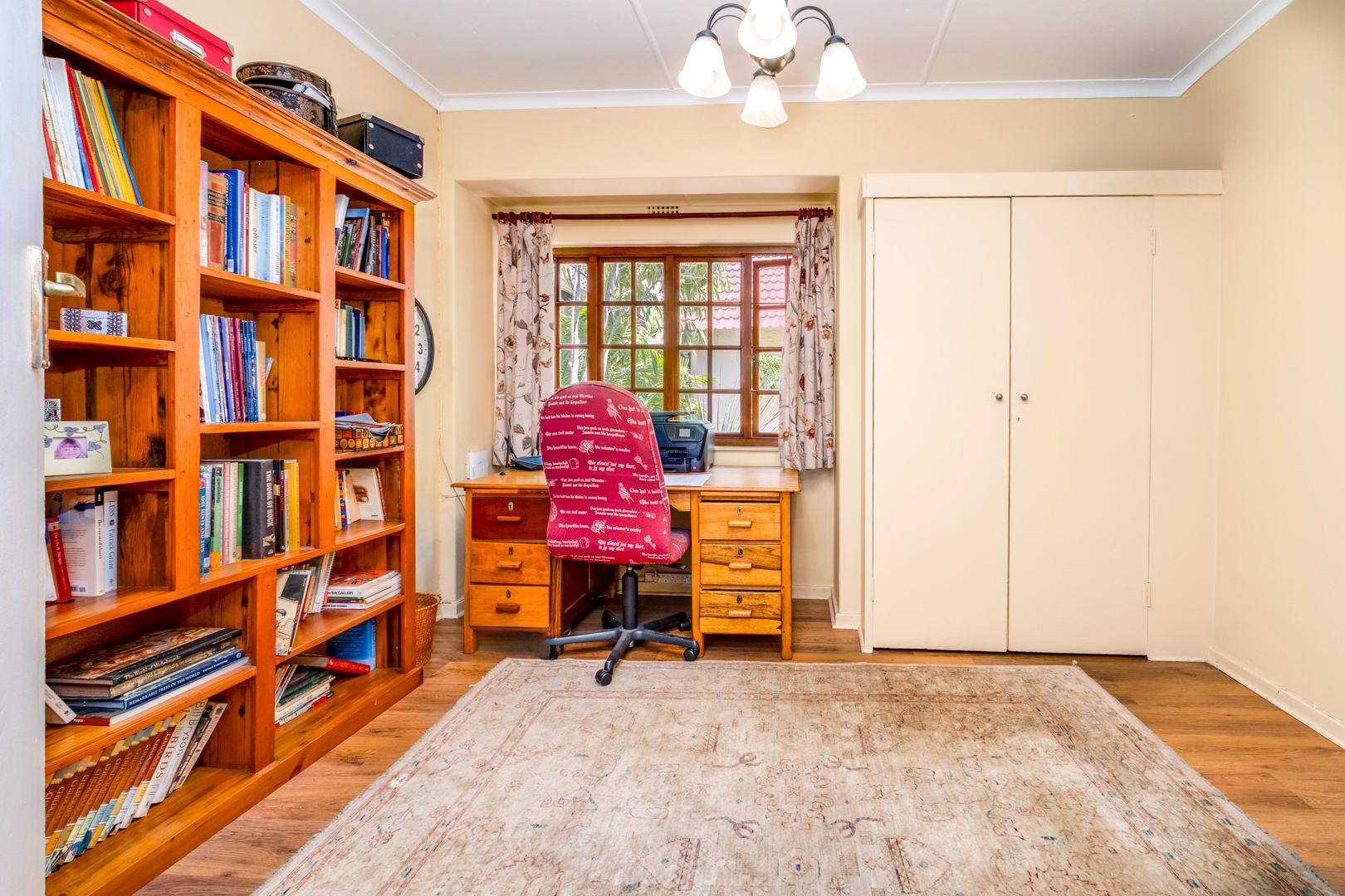 Second bedroom with laminated flooring, north-facing cottage-pane window, and built-in cupboards