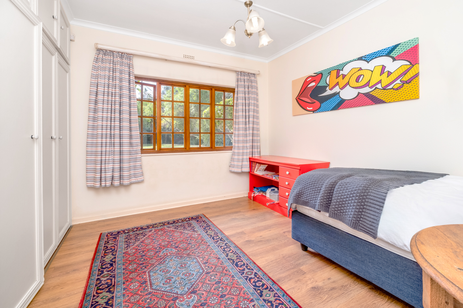 Third bedroom with laminated flooring, bright cottage-pane windows, and built-in cupboards
