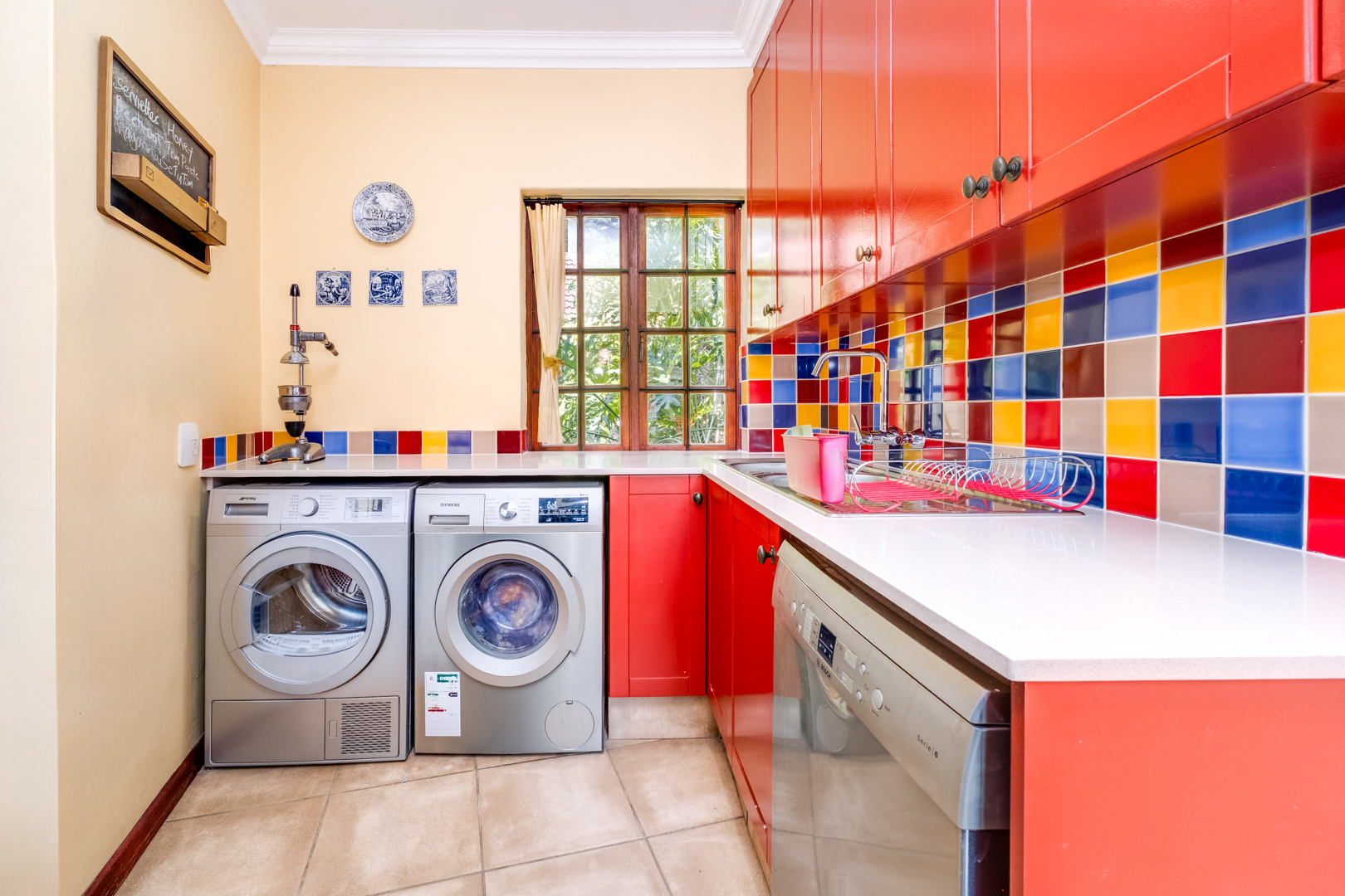 Laundry area with tiled flooring, space for three appliances, double sink, and a large east-facing window