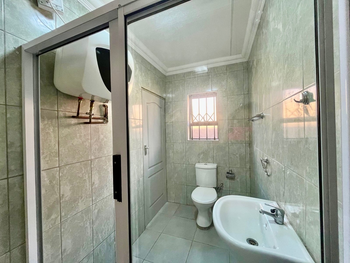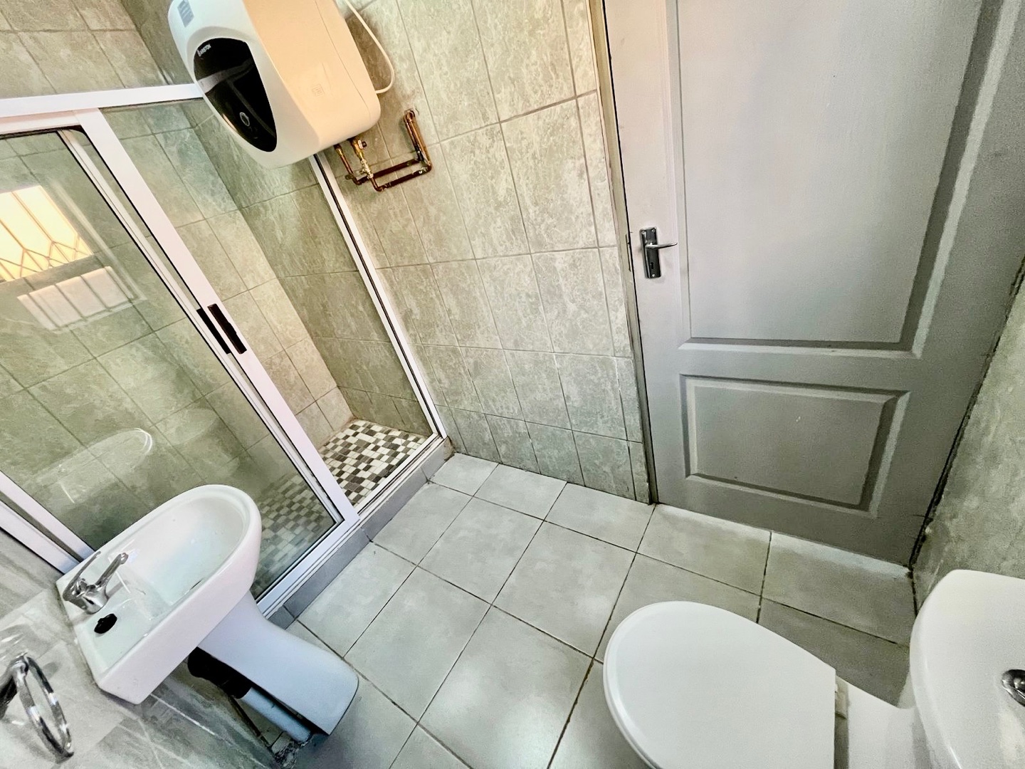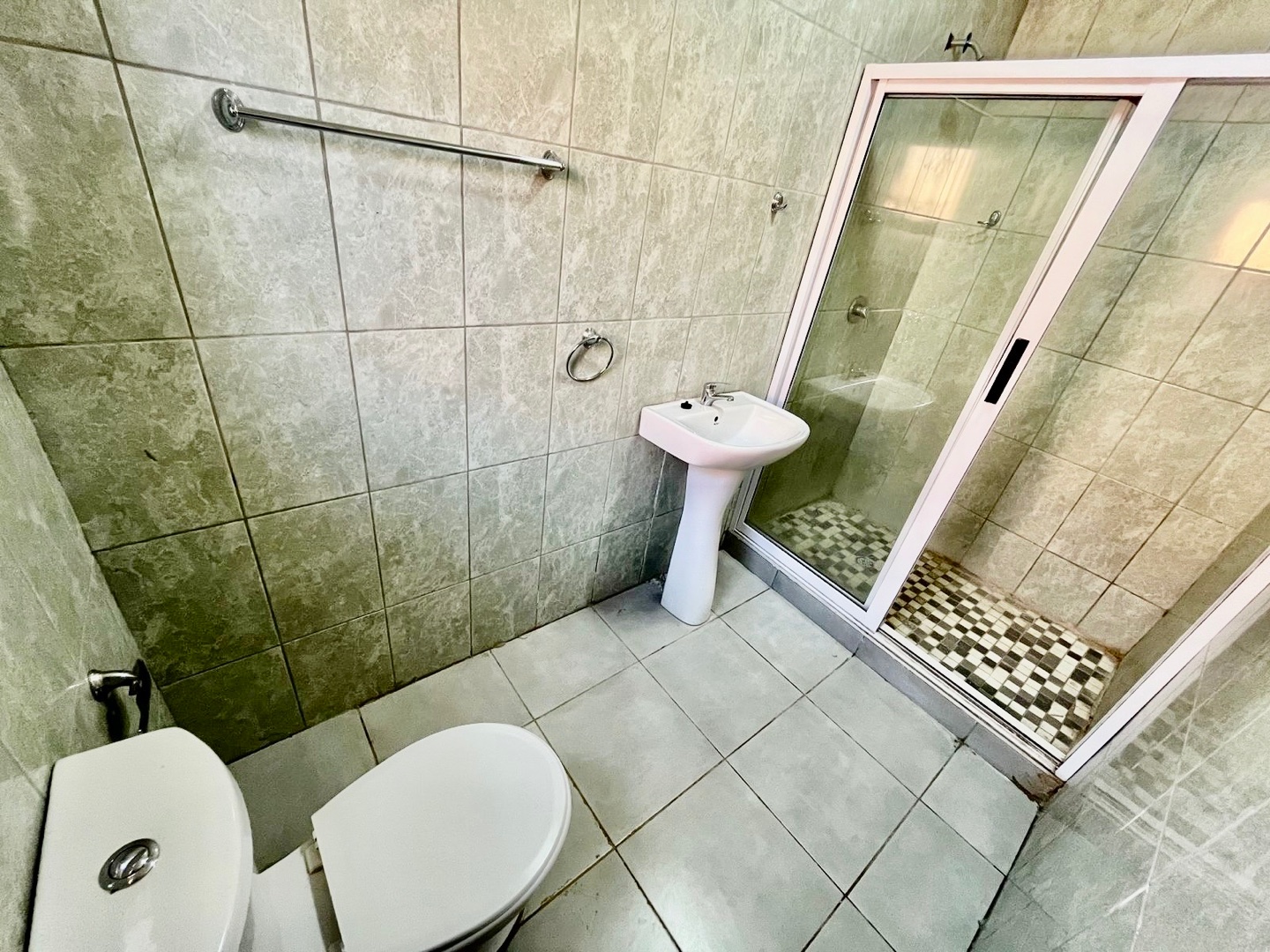 * A bathroom with a shower, basin & a toilet