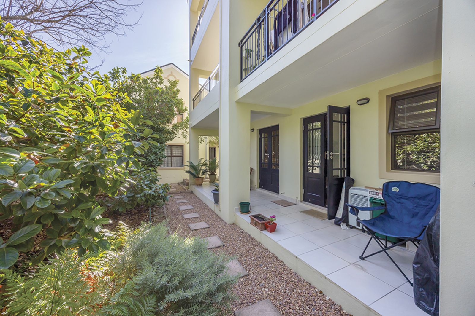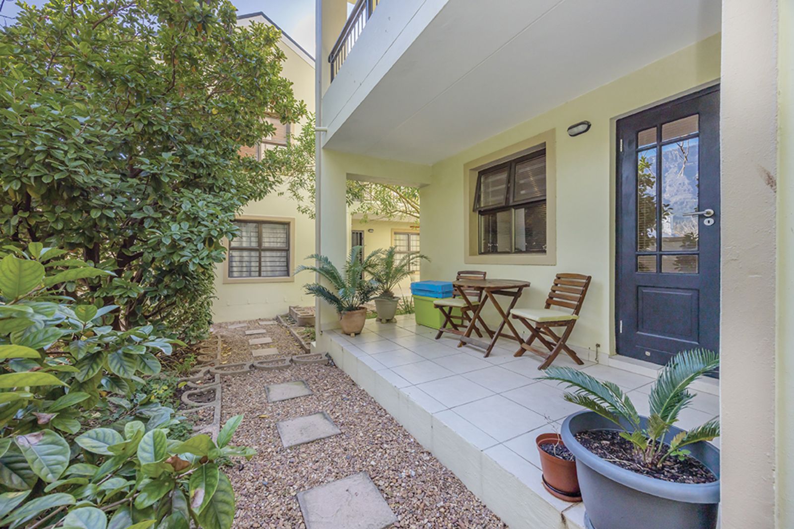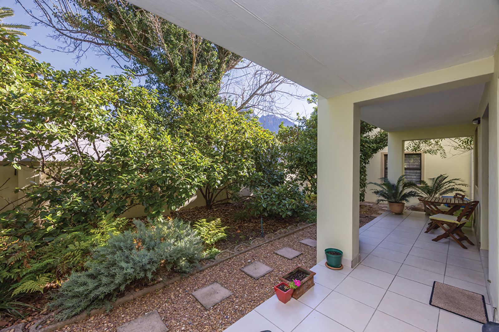 The apartment features a modern, open-plan kitchen flowing seamlessly into a spacious living area, perfect for relaxed everyday living or entertaining guests. French doors open onto a generous tiled patio overlooking lush, landscaped gardens and offering glimpses of the majestic mountain – an ideal space to braai and unwind and enjoy a peaceful evening after a long day.