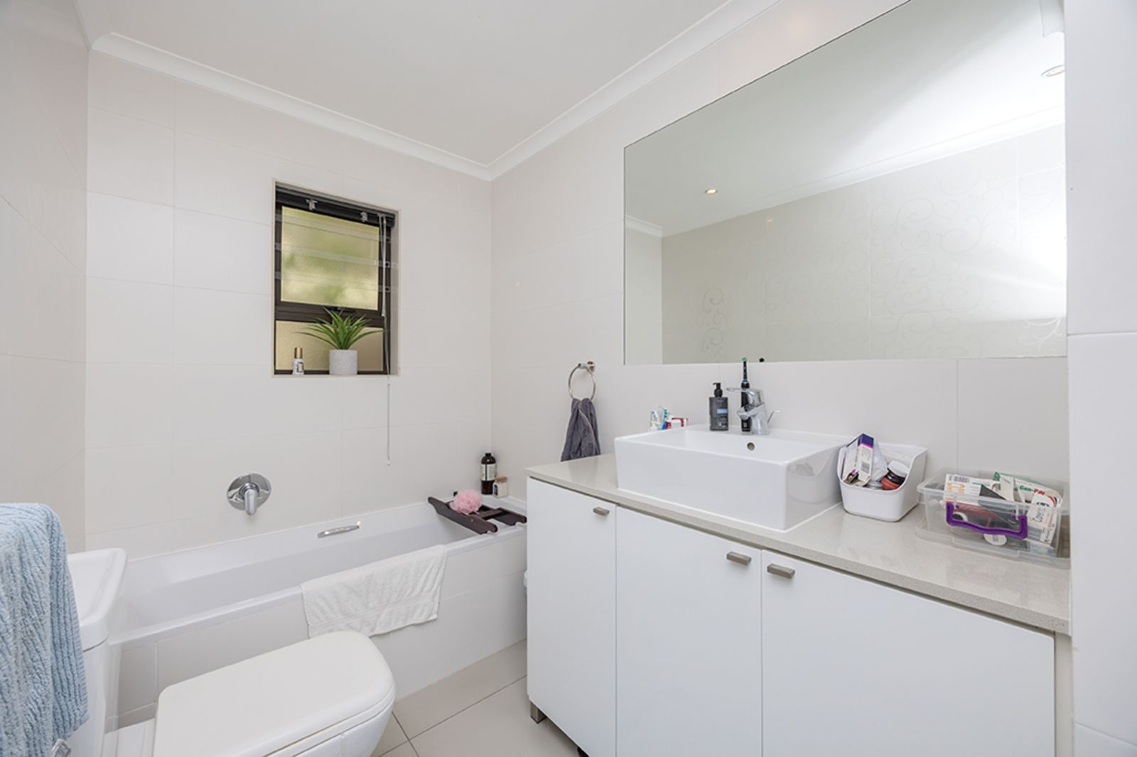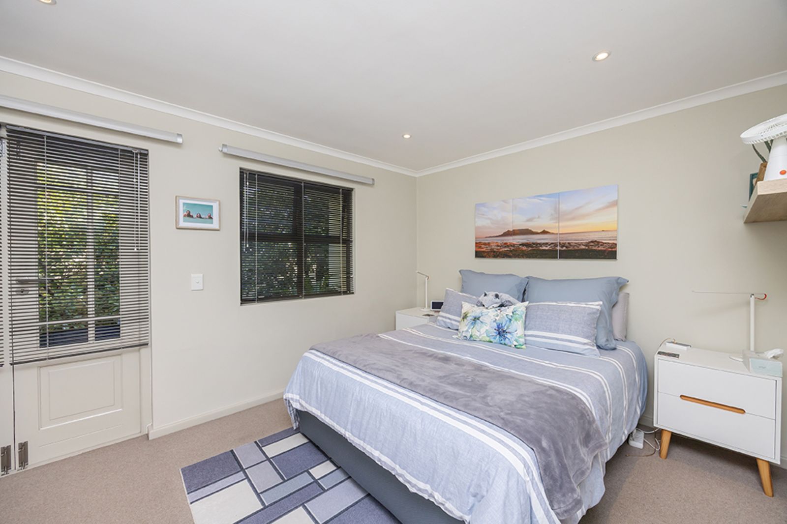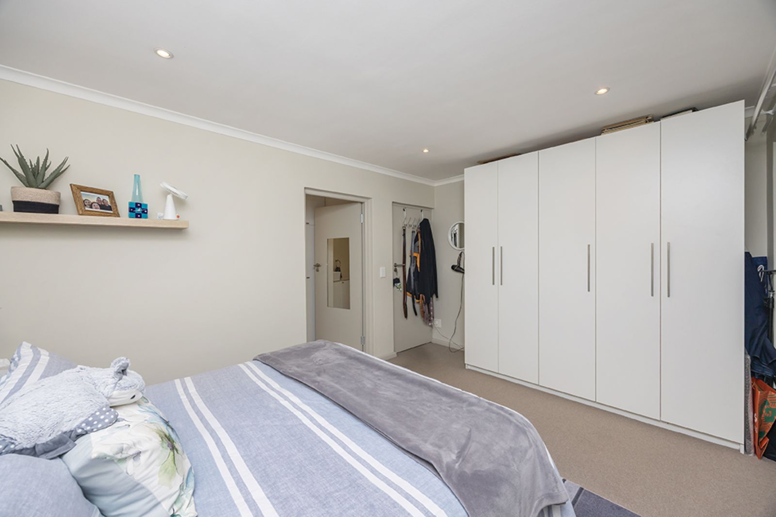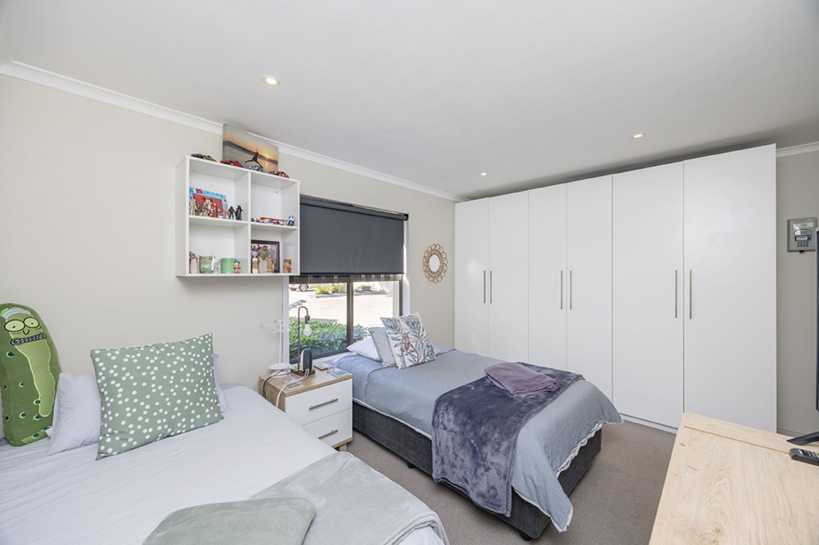 A spacious second bedroom, complete with built-in cupboards and plenty of natural light, is serviced by a family bathroom – perfect for visiting friends or family.