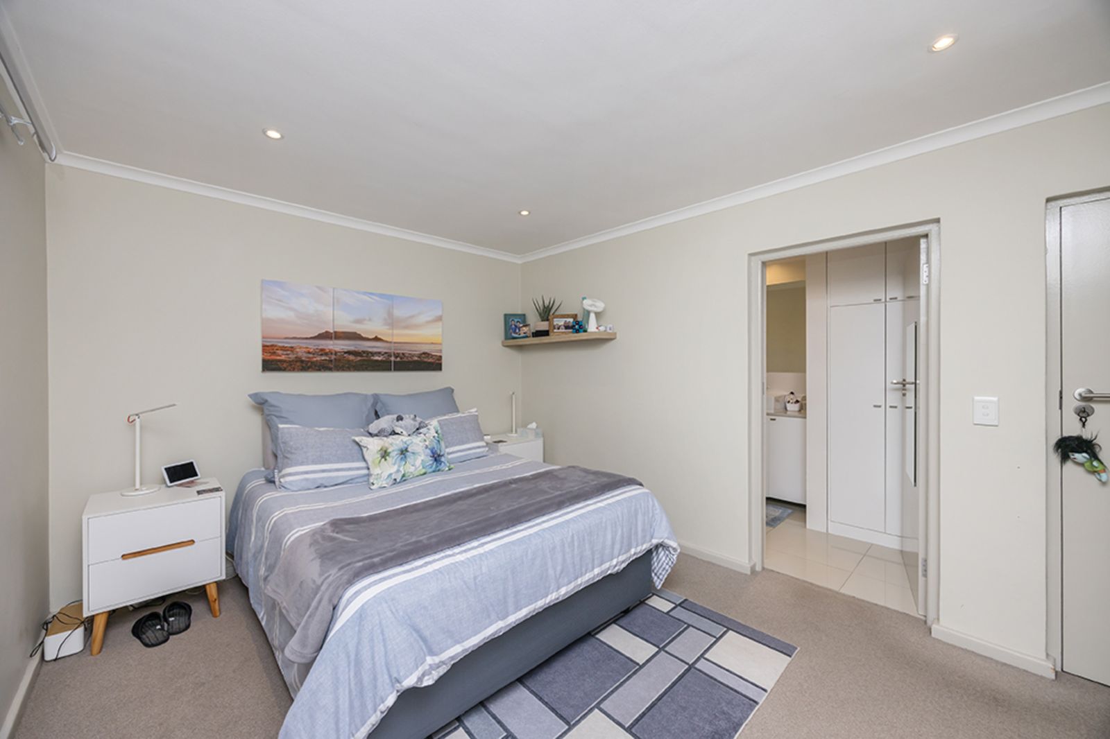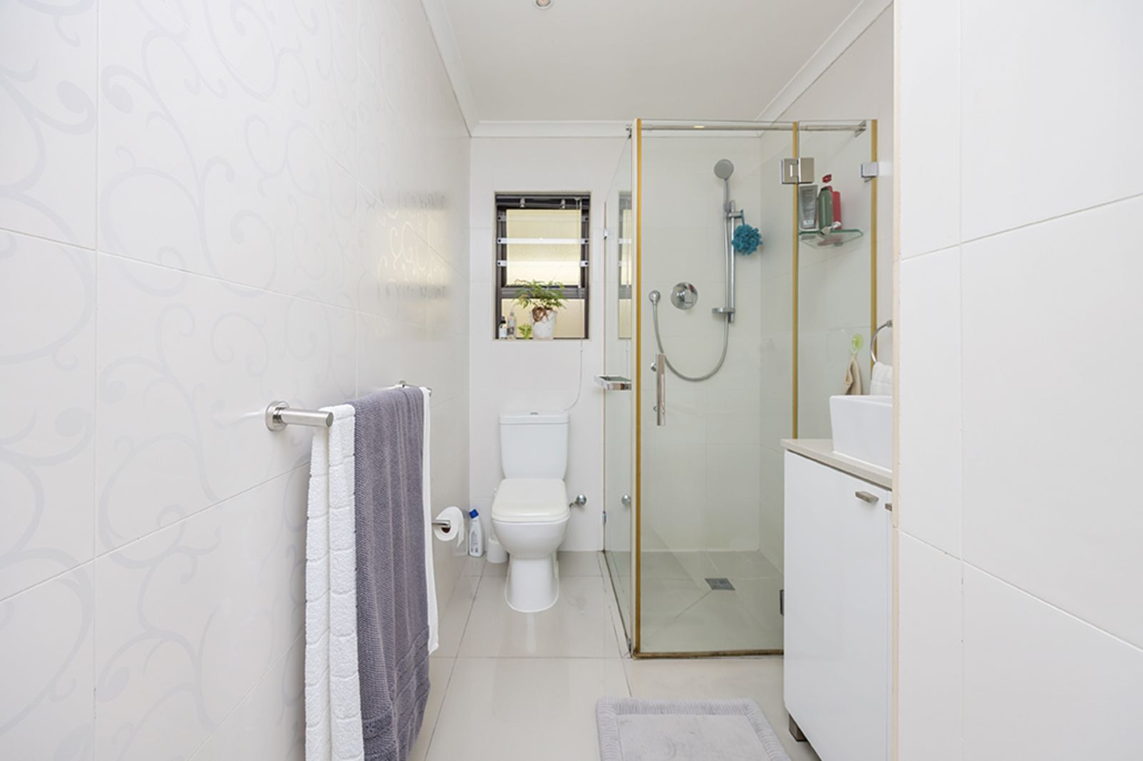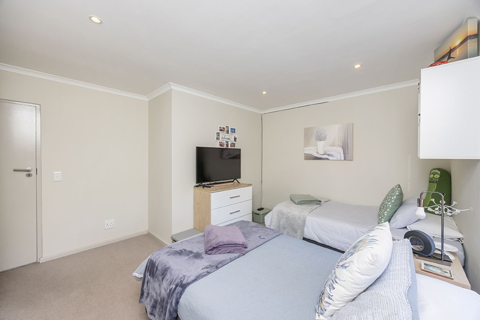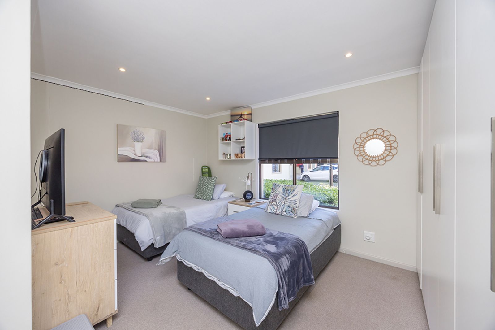 A spacious second bedroom, complete with built-in cupboards and plenty of natural light, is serviced by a family bathroom – perfect for visiting friends or family.