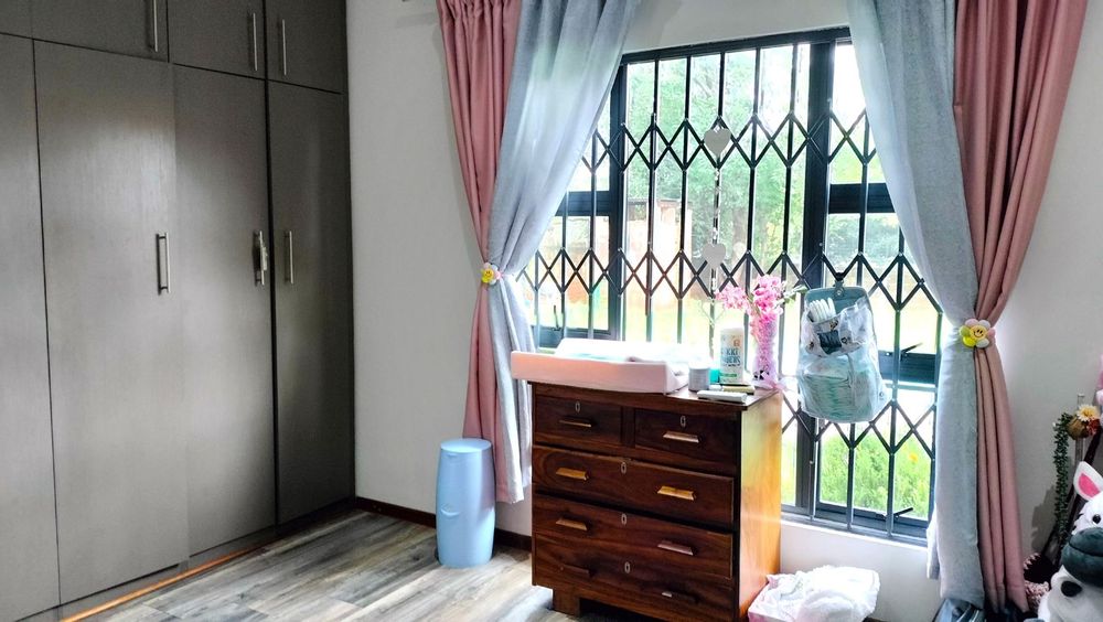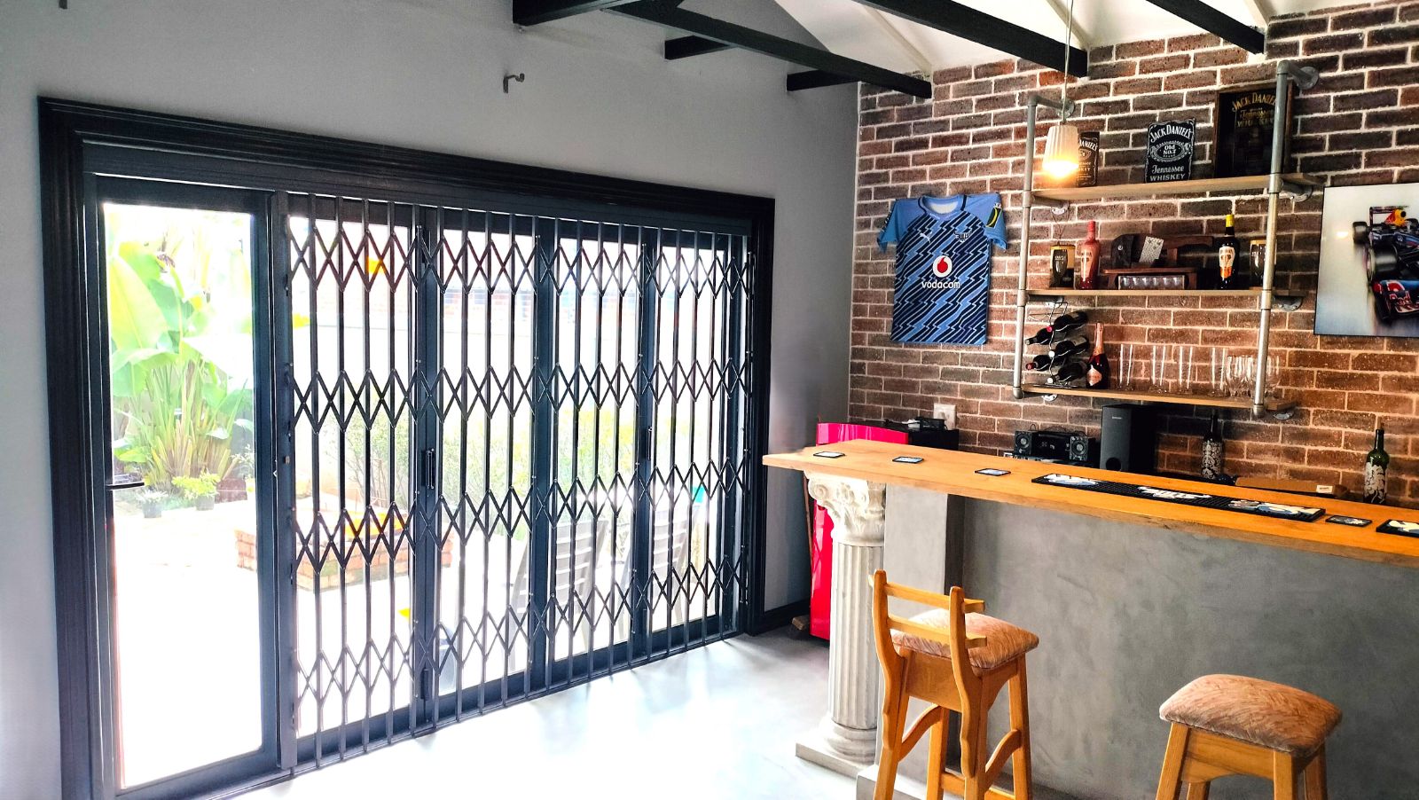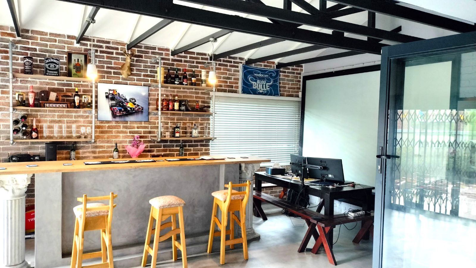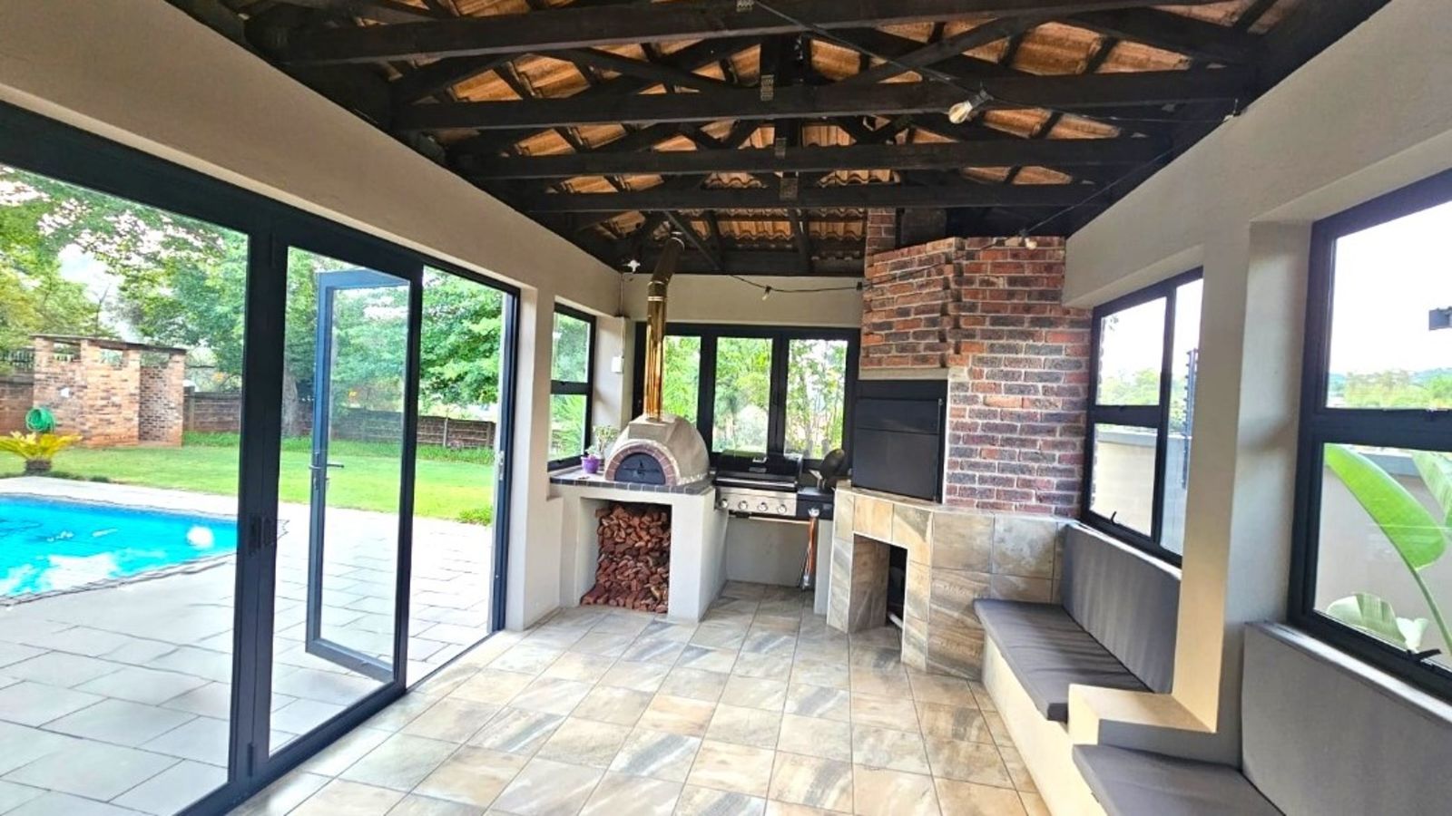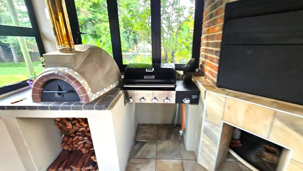 Entertain in style with an impressive indoor entertainment area that flows from the lounge. It features striking cement floors, a custom cement-built bar, and beautiful exposed wooden trusses in the ceiling. Sliding doors lead to a charming courtyard area and onward to the enclosed outdoor entertainment zone, complete with a built-in pizza oven, gas braai, and traditional braai – all overlooking a sparkling pool and a large, lush garden that’s perfect for children and pets.