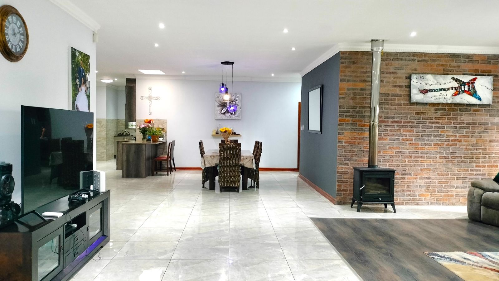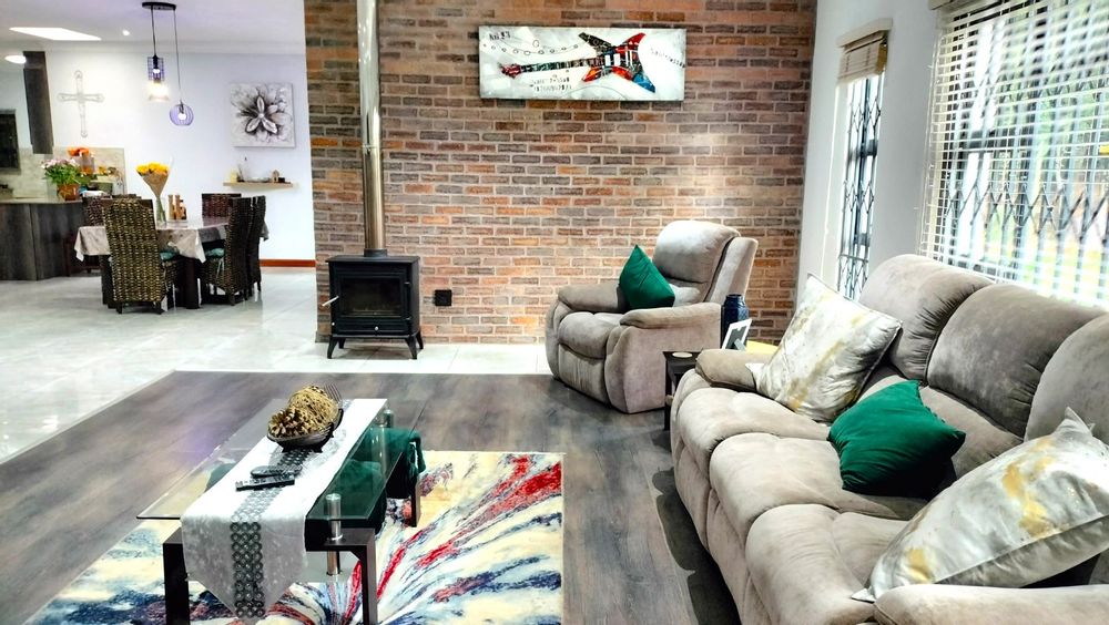 The lounge features a stunning face-brick feature wall and a cozy closed-combustion fireplace, setting the scene for relaxed. Modern tiles flow throughout the living space, creating a fresh, modern ambiance that’s both stylish and easy to maintain. Natural light pours in through a skylight in the dining area, enhancing the airy feel.