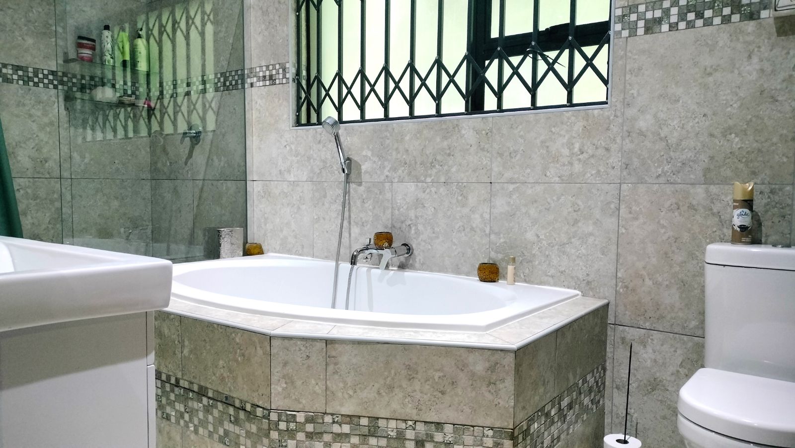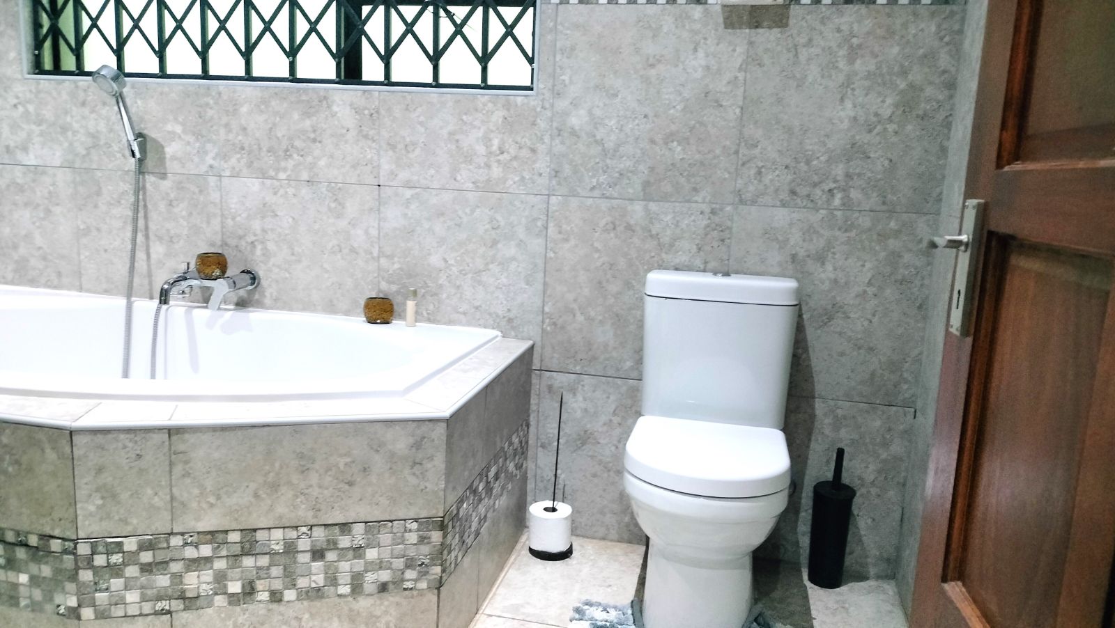 A second full bathroom services the additional bedrooms, also featuring modern finishes including a bath, shower, toilet, and single vanity.