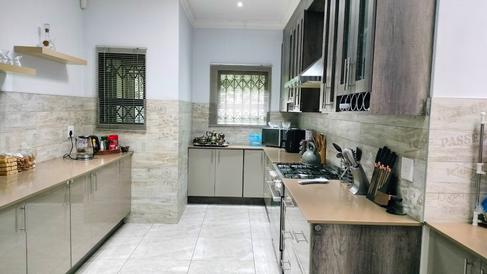 The kitchen is a chef’s dream – sleek and sophisticated, with Ceasarstone countertops, elegant cabinetry including top glass display cupboards, and a freestanding 5-plate gas stove with electric oven. A separate scullery provides ample storage and space for all your laundry needs.