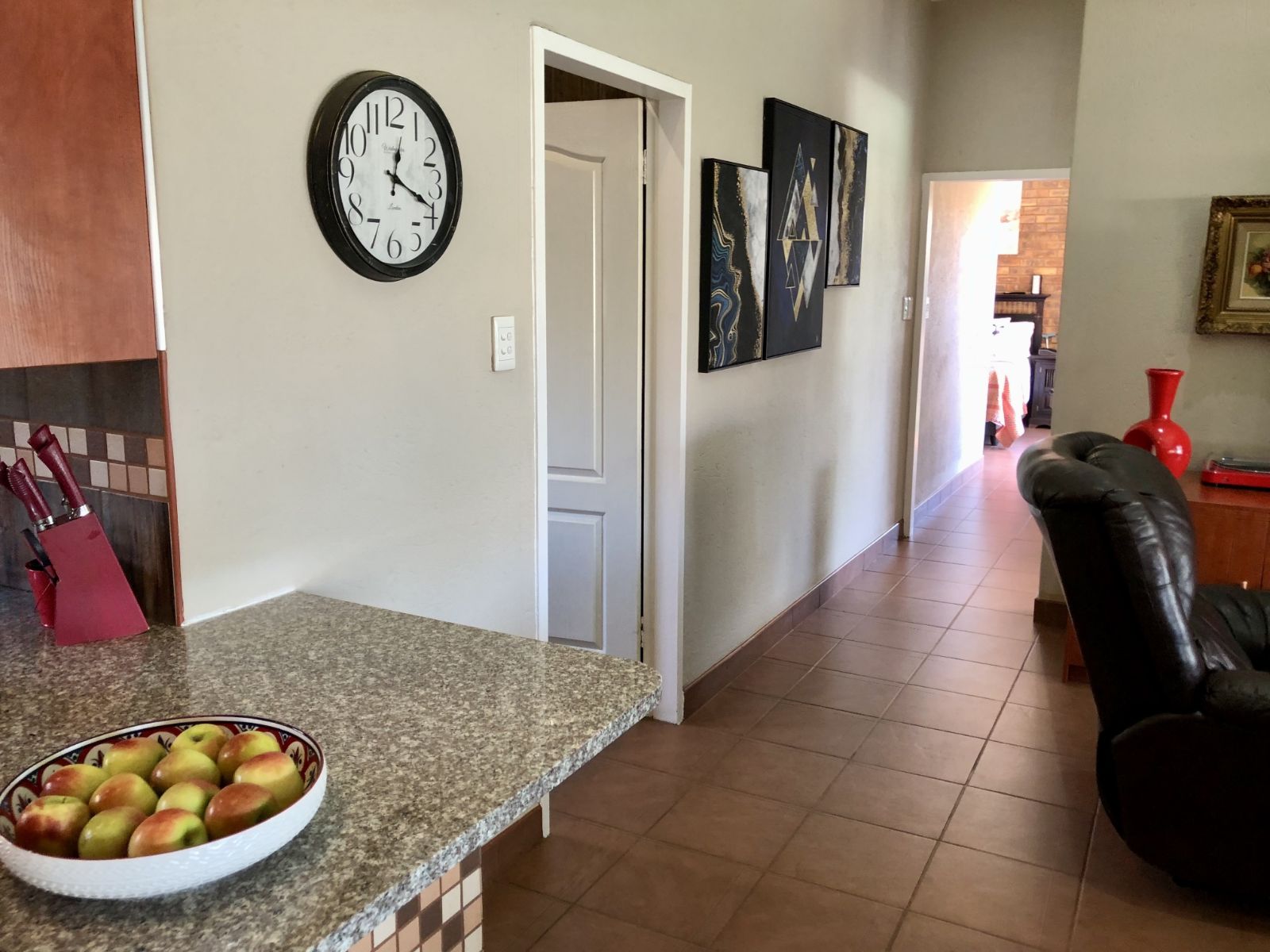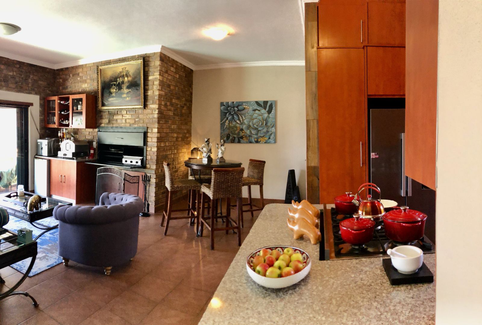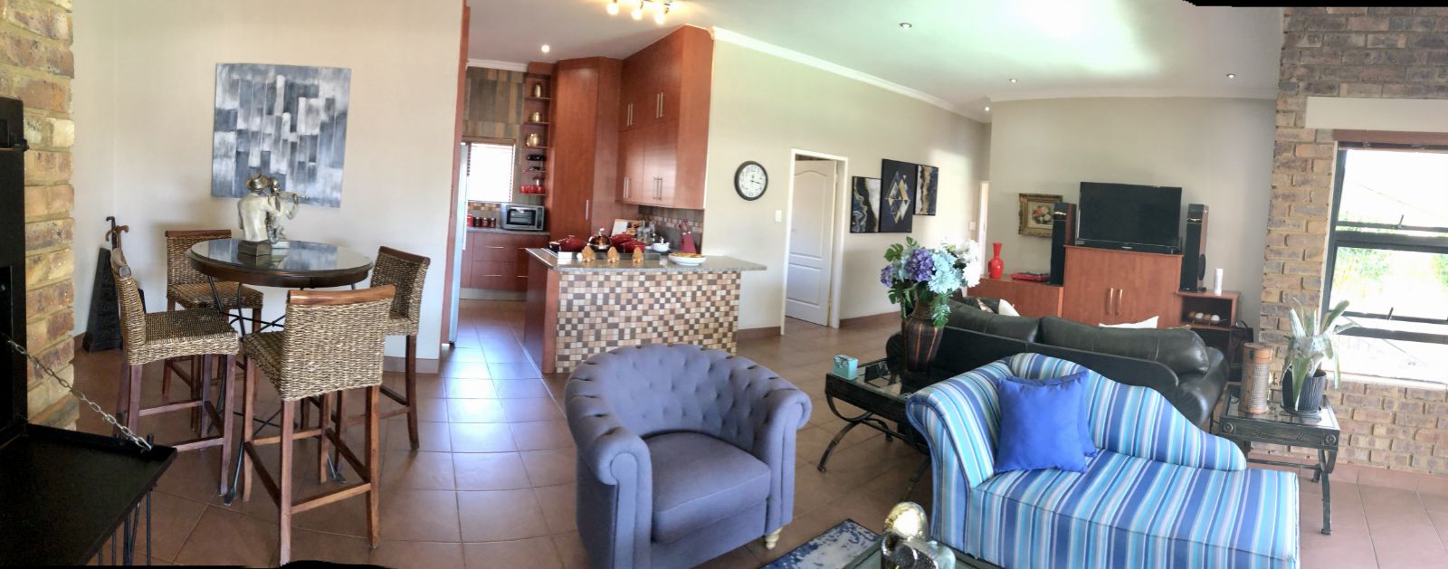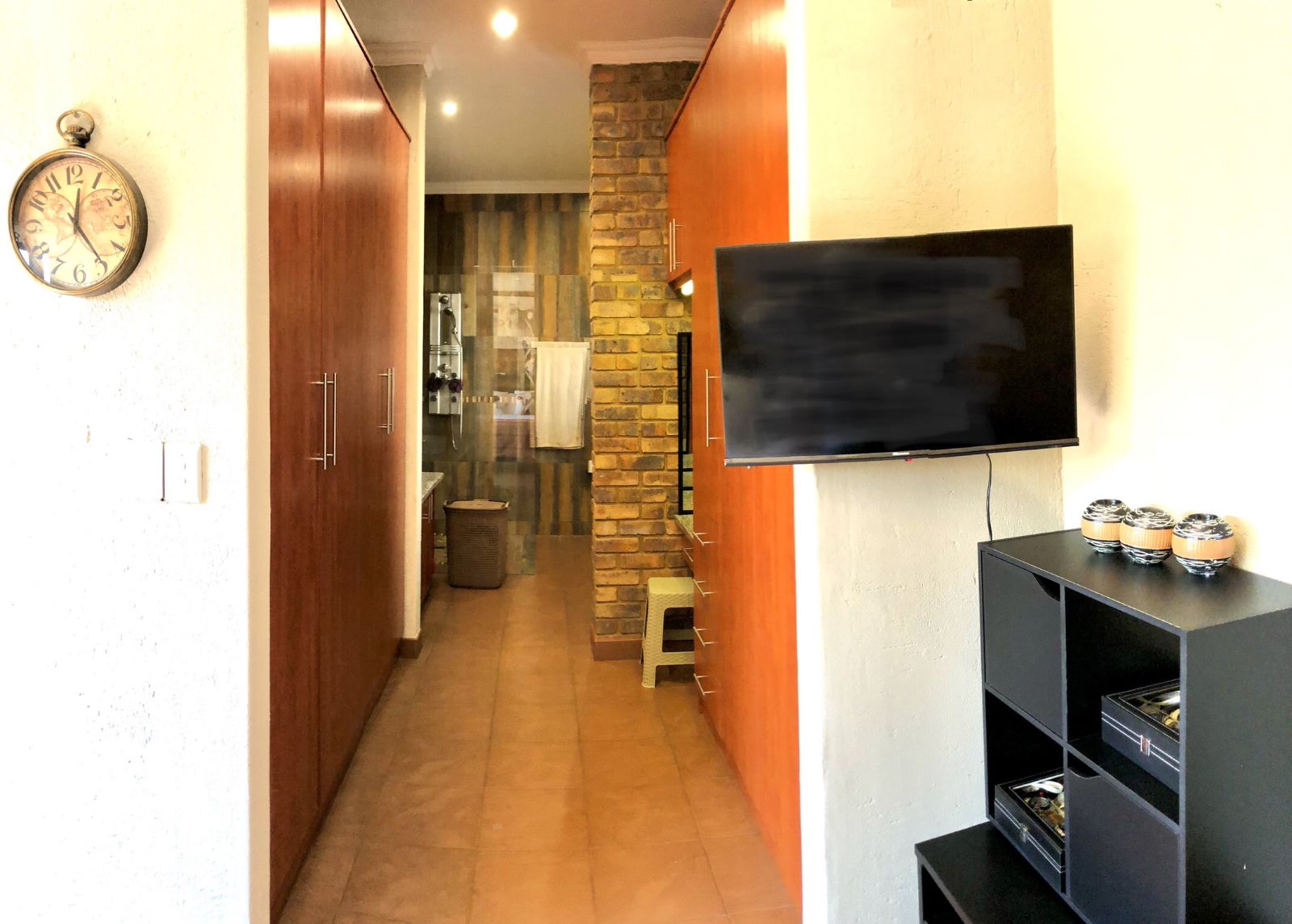 From the moment you enter, the tranquil ambience created by the sound of flowing water welcomes you. The deck overlooking the pool invites you to pause and want to stay. Large sliding doors connects the deck seamlessly with the open plan lounge-dining-indoor braai area, which further leads into the kitchen. To the side, where the 3rd bedroom would have been (and can easily be re-created), is the TV room which forms part of the greater open plan area. By optimising the space, a perfect environment has been created for entertaining guests and watching sports together.