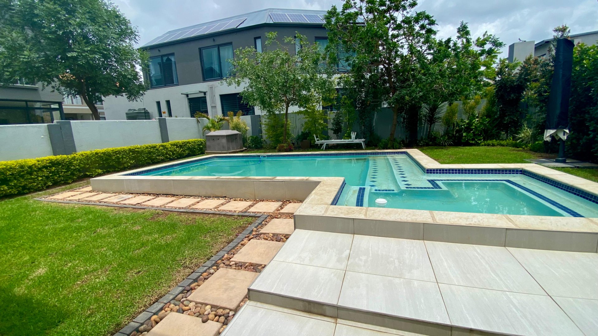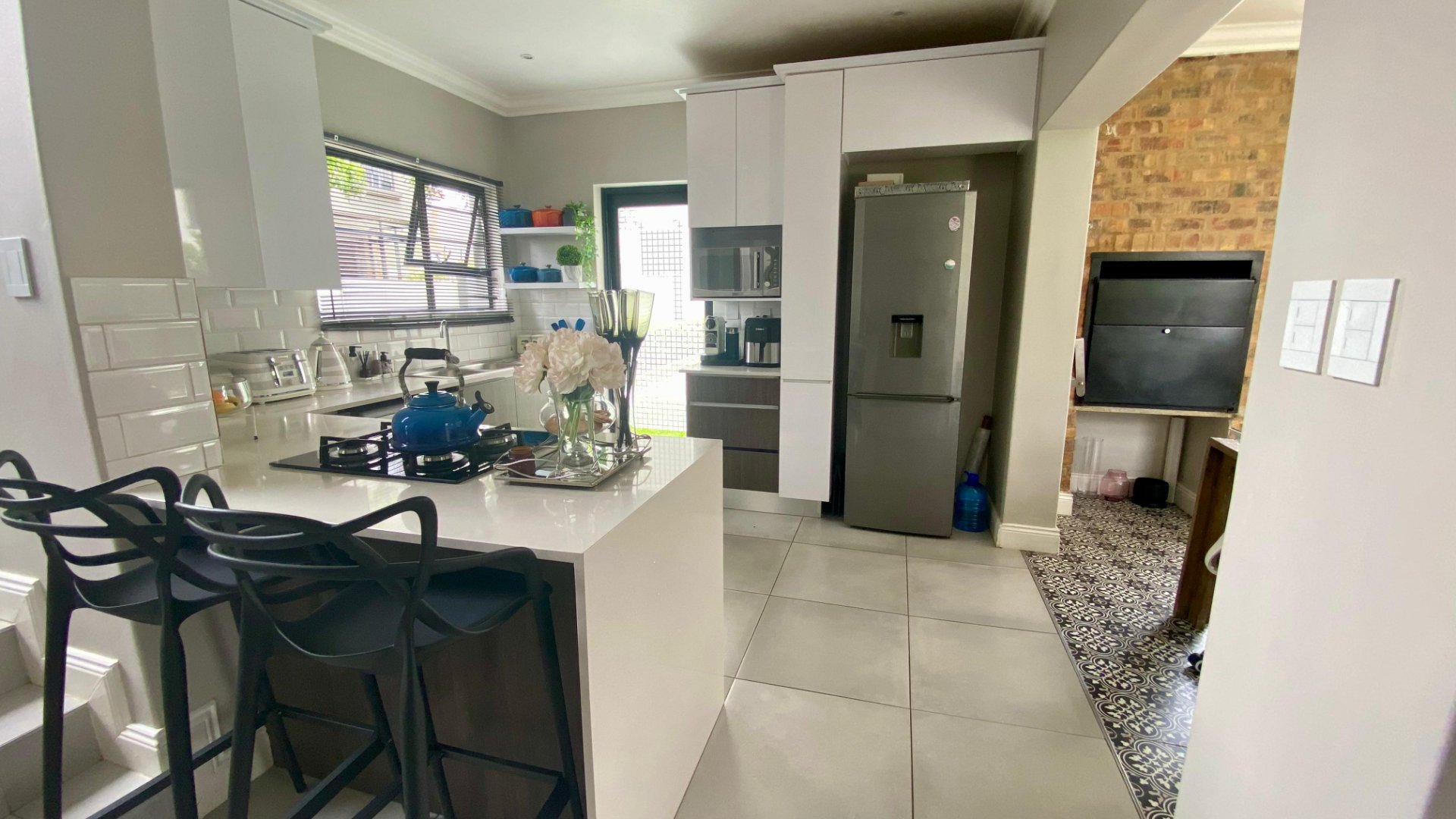 The open-plan living and dining area flows effortlessly into a contemporary kitchen with premium finishes, ample storage, and sleek countertops. Enjoy easy indoor-outdoor living with a covered patio featuring a built-in braai, overlooking a private garden and sparkling swimming pool — perfect for entertaining or relaxing with loved ones.