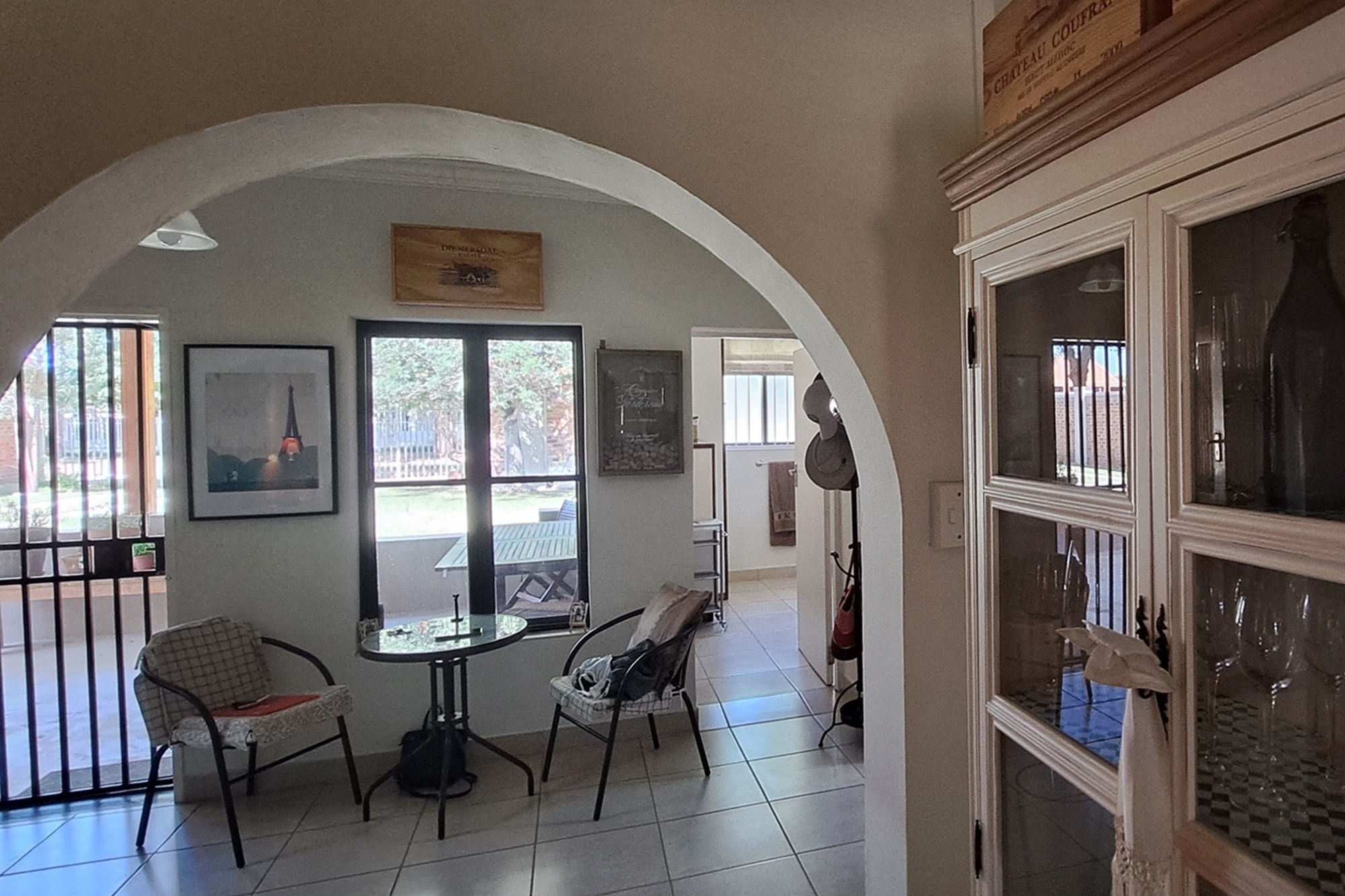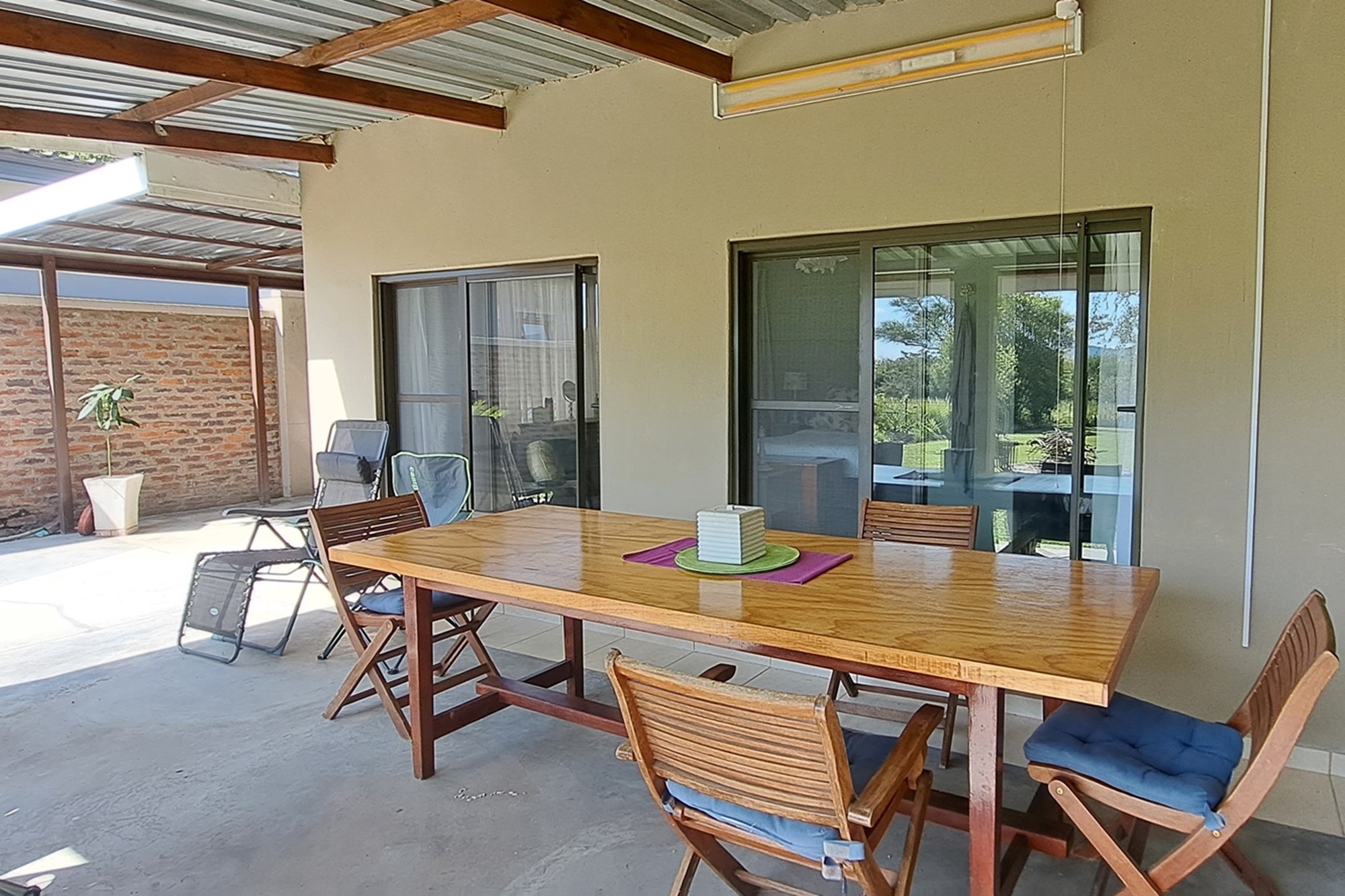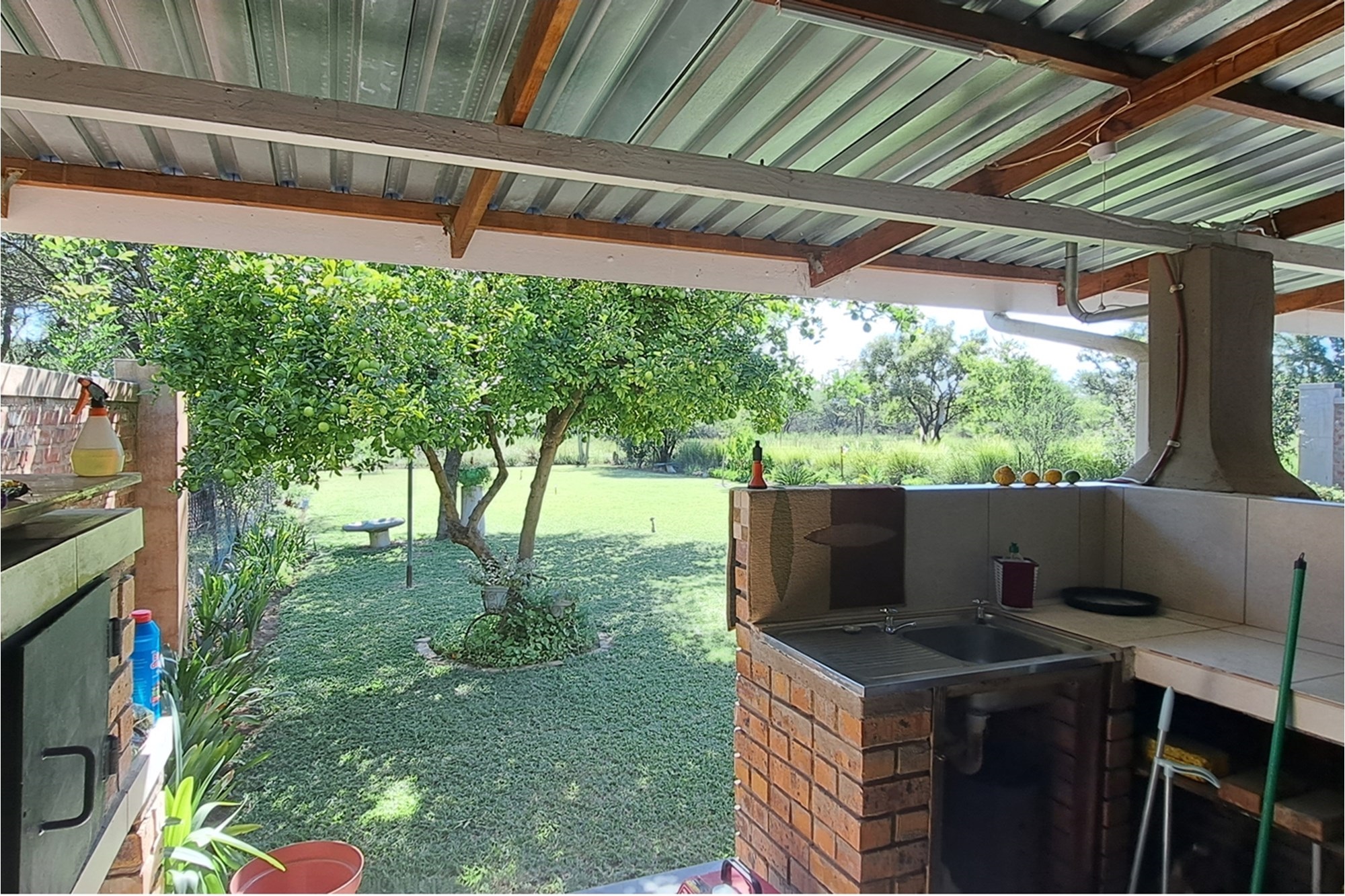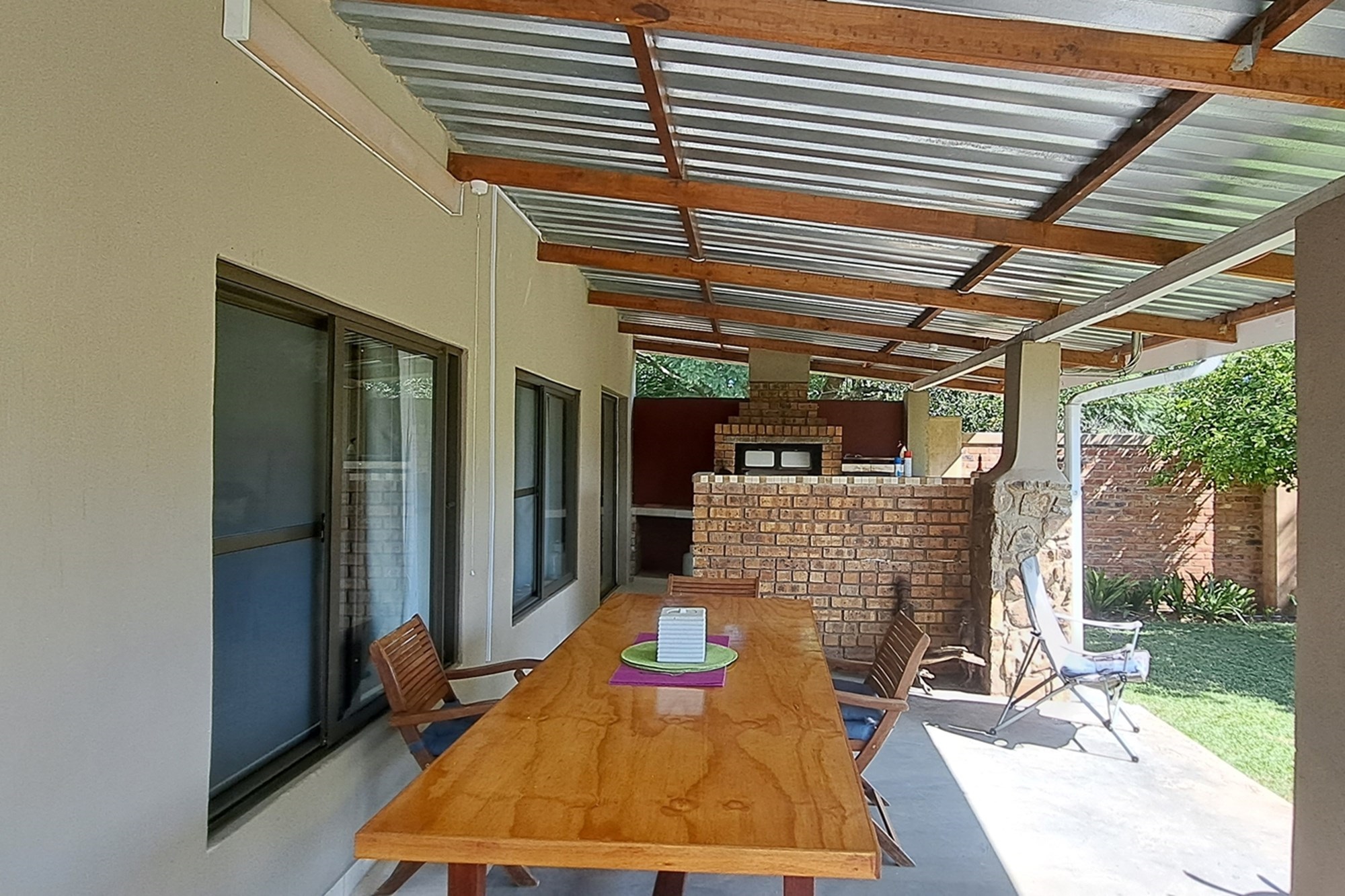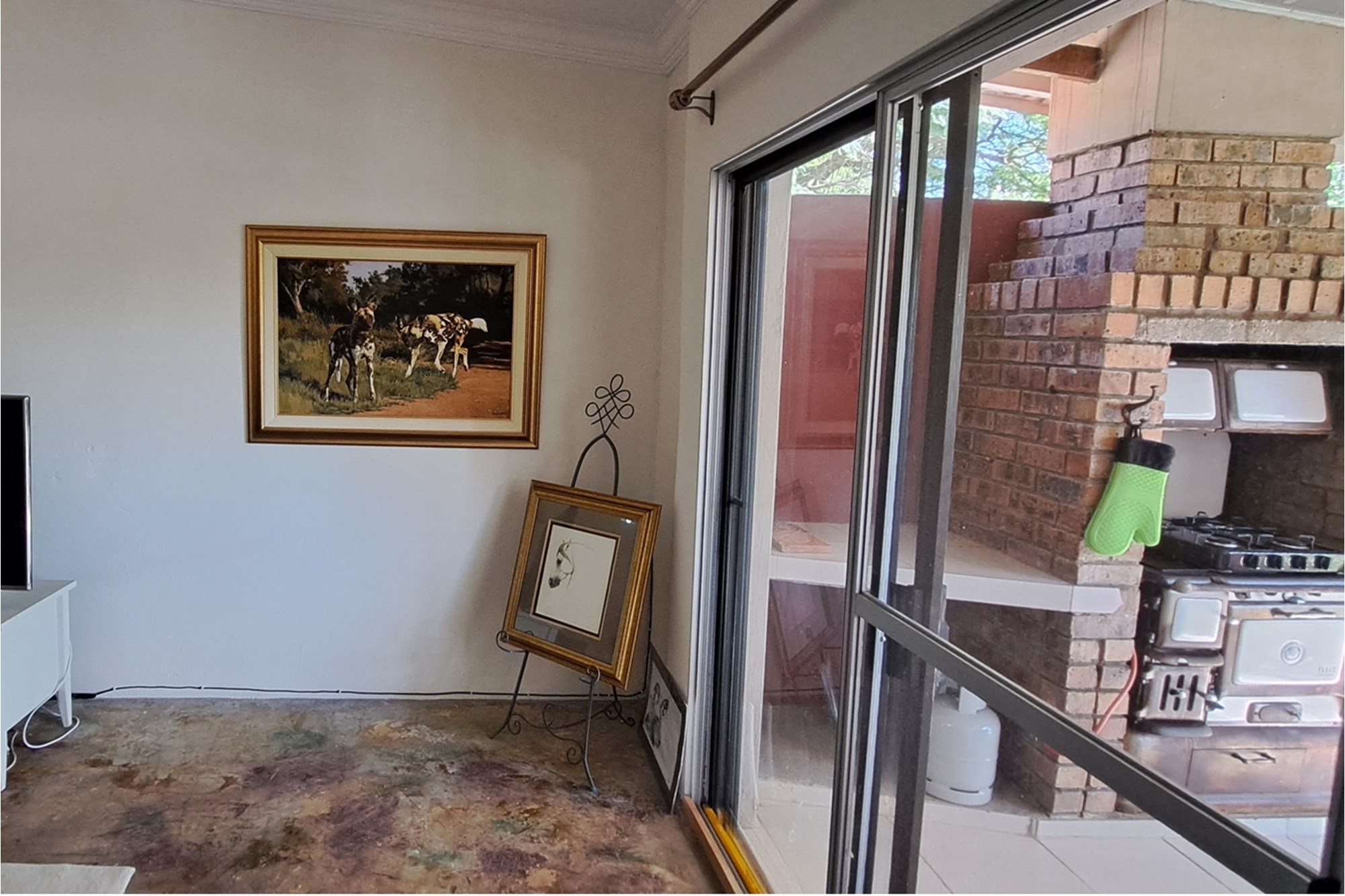 Sitting majestically on a generous 985-square-meter stand, this home boasts ample outdoor underroof entertainment space with a built-in braai and gas stove and offers unparalleled views of the neighboring game farm.