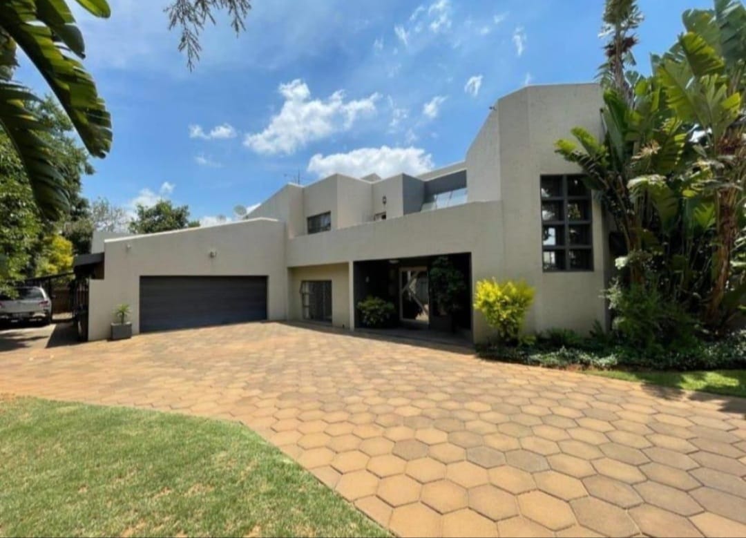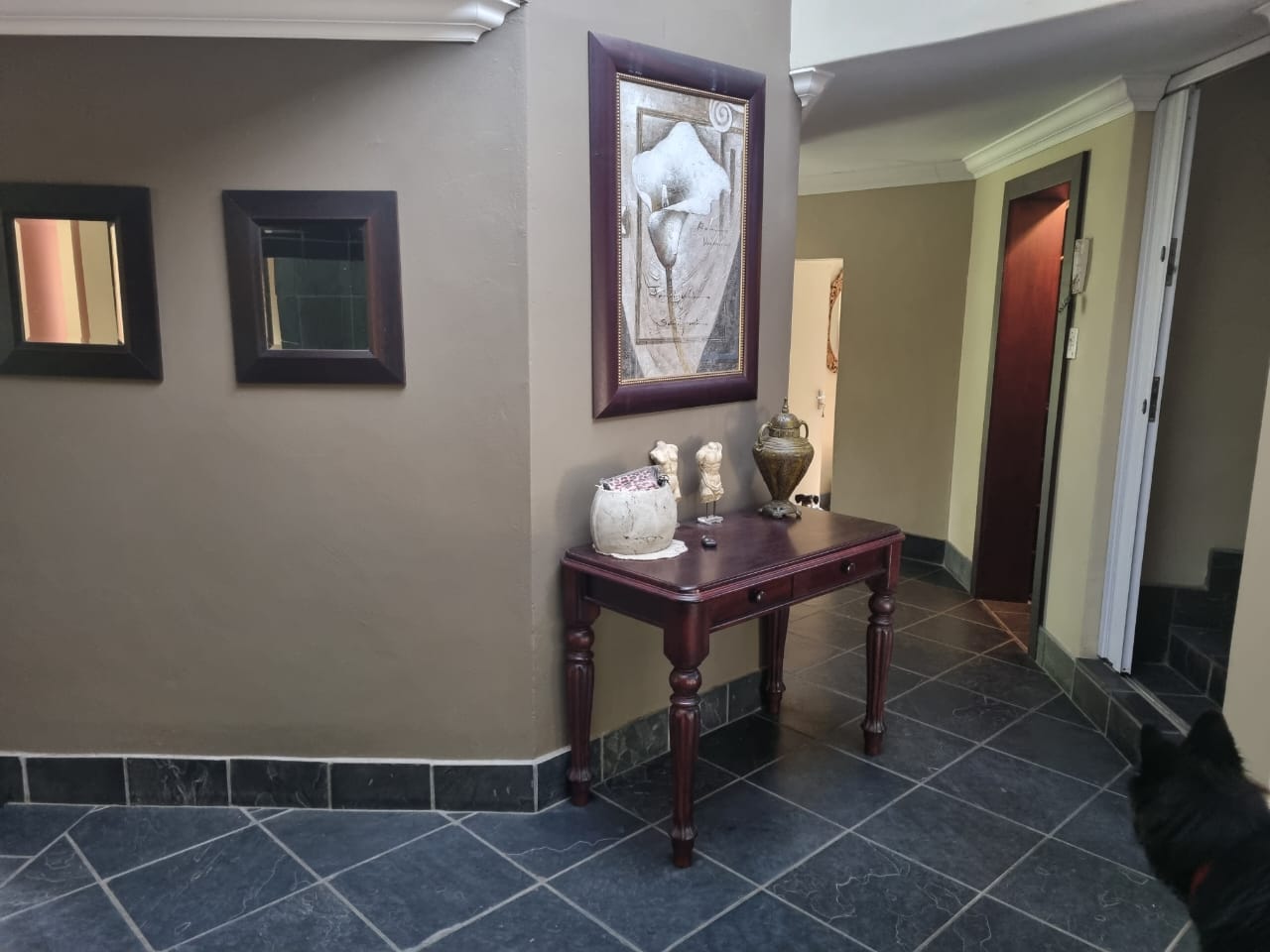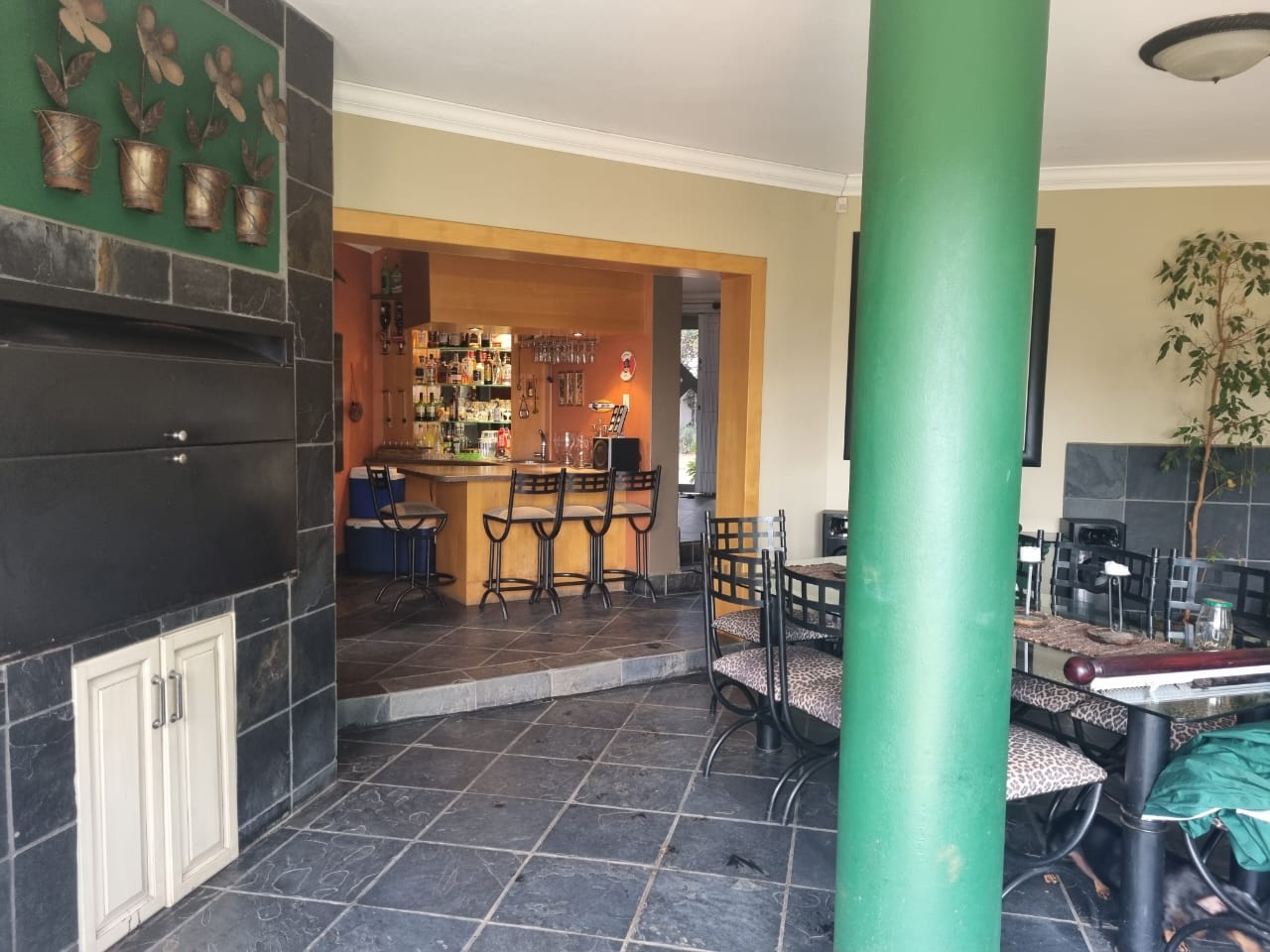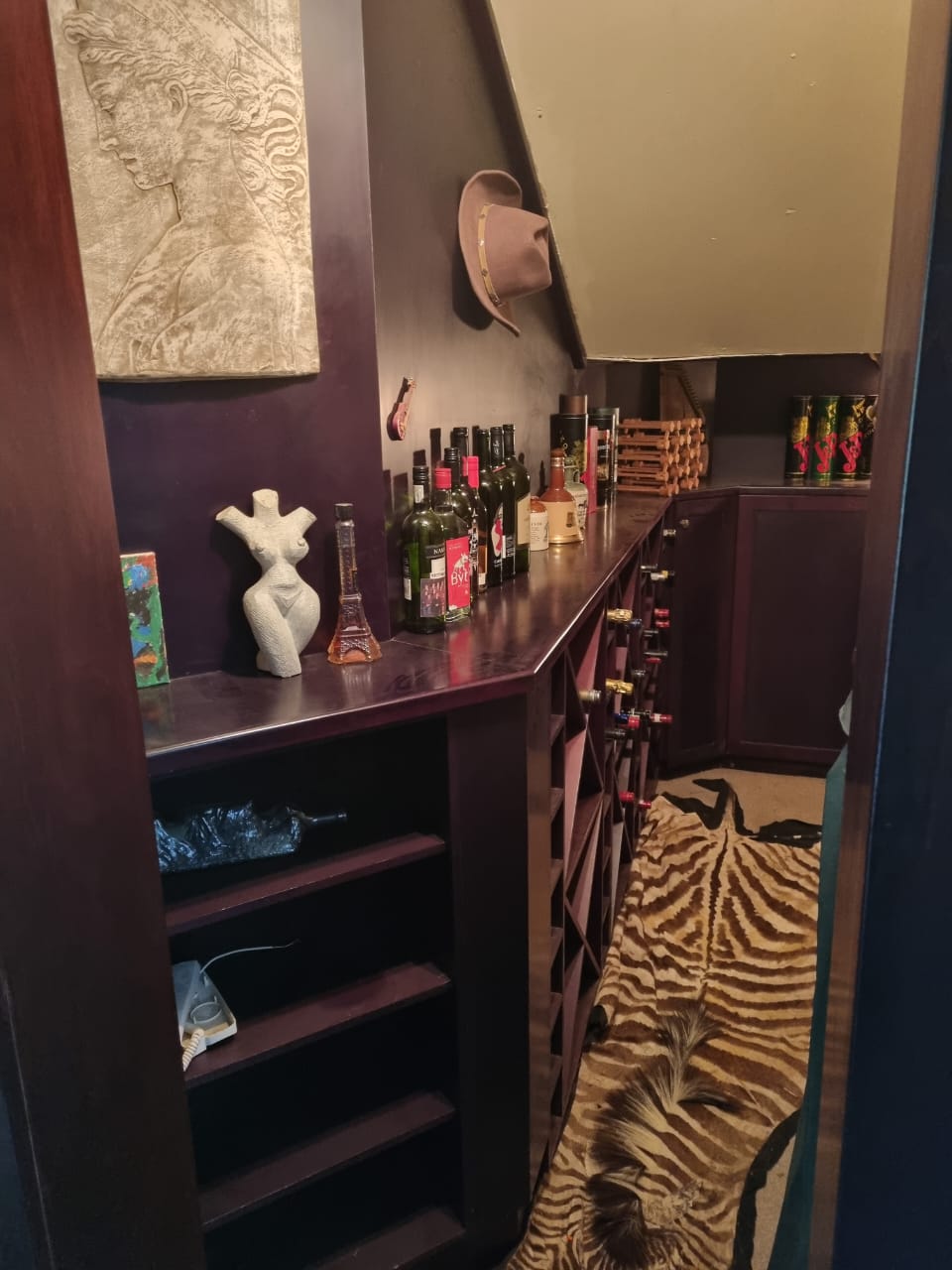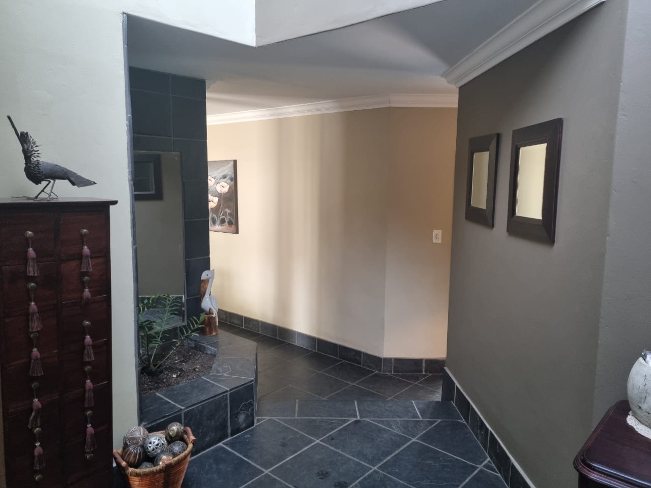 Luxurious 5-Bedroom Double Storey Mansion Experience opulence and grandeur in this stunning 5- bedroom double storey mansion. Perfect for those seeking luxurious lifestyle. Boasting top class quality finishes. The generous reception area with glass pivot door gives you access to this entertainers dream, ideal for a large family. When entering the property you are met by a guest toilet to your left and slate tiled floors throughout the house. Downstairs: Downstairs to your right you will find the prestigious wine cellar with its expert design and construction of custom built mahogany wine racks to solve your wine storage and display needs. There is a private large study that can be used for Home office, neatly carpeted with three perfectly fitted workstations made from Mahogany wood- ideal for the work from home family. There are two formal lounges with luxurious tiling rails. There is an entertainment area equipped with a built in braai, granite tops, slate tiles, jacuzzi and glass sliding doors opening up onto the beautiful, well designed back yard with a covered patio overlooking the well designed koi pond with its natural stone water feature. There is a bar area with solid beech wood finishes. There is a large dinning area adjacent to the kitchen for convenience in serving guests. There is a modern kitchen consisting of a semi-gas and electrical hob and oven, space for double door fridge, modern cupboards, ivory fantasy granite tops, soft closing cupboard doors and drawers, space for a microwave and blinds. The kitchen further offers a scullery with a walk in Pantry, double basin and space for 3 undercounter appliances. Upstairs: There are 5 large bedrooms upstairs, two full bathrooms, Master bedroom is en-suite. Two of the five bedrooms have their own balcony, the master bedroom has an air condition. Four of the bedrooms are carpeted with 100% wool carpets and all bedroom have ample built in cupboards. There is a one bedroom Flatlet, with its own entrance and Carport. The flat consists of one spacious bedroom with en-suite bathroom and ample built in cupboards, a lovely living area and a neat little kitchen. Security features at the house includes an alarm system, motorized security gate, burglar bars, beams, CCTV treli-doors in front of all outside doors. Other features include TV ports in all the rooms and an irrigation system with rain detector. Discover the cosmopolitan convenience and friendly atmosphere of this leafy home.. Extra Features Jacuzzi Gym, koi pond Scenic views from upper floors Ample Parking Ideal for: Large families High end Executives Those seeking luxury and exclusivity Schedule a viewing today and indulge in the finer things in life! This magnificent property has lots to offer seeing is believing, Please book sometime to view this property before its too late.