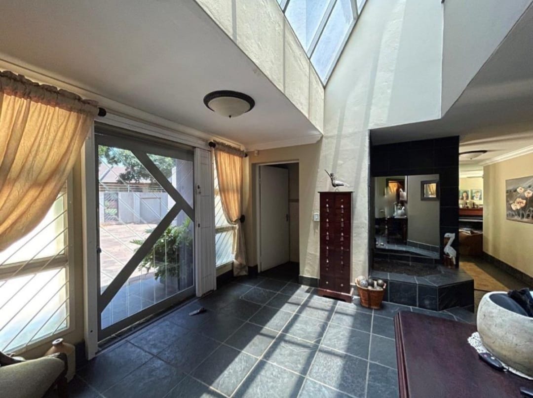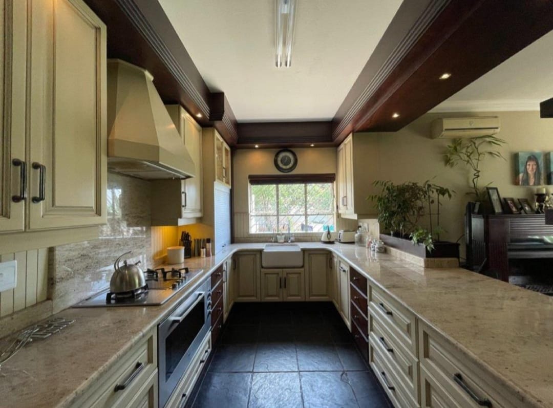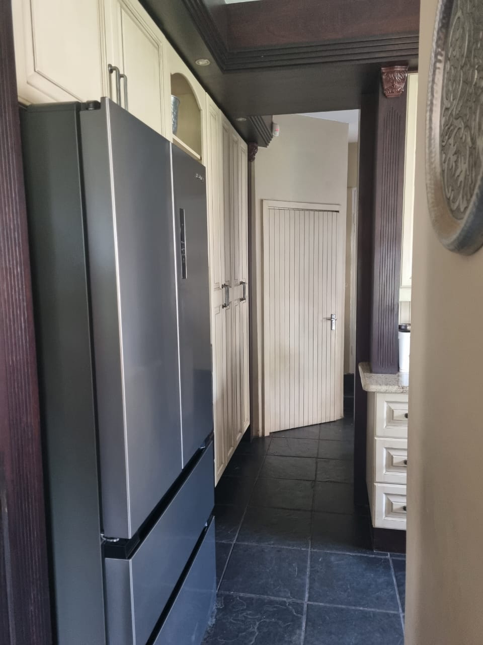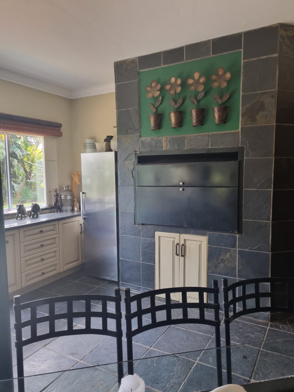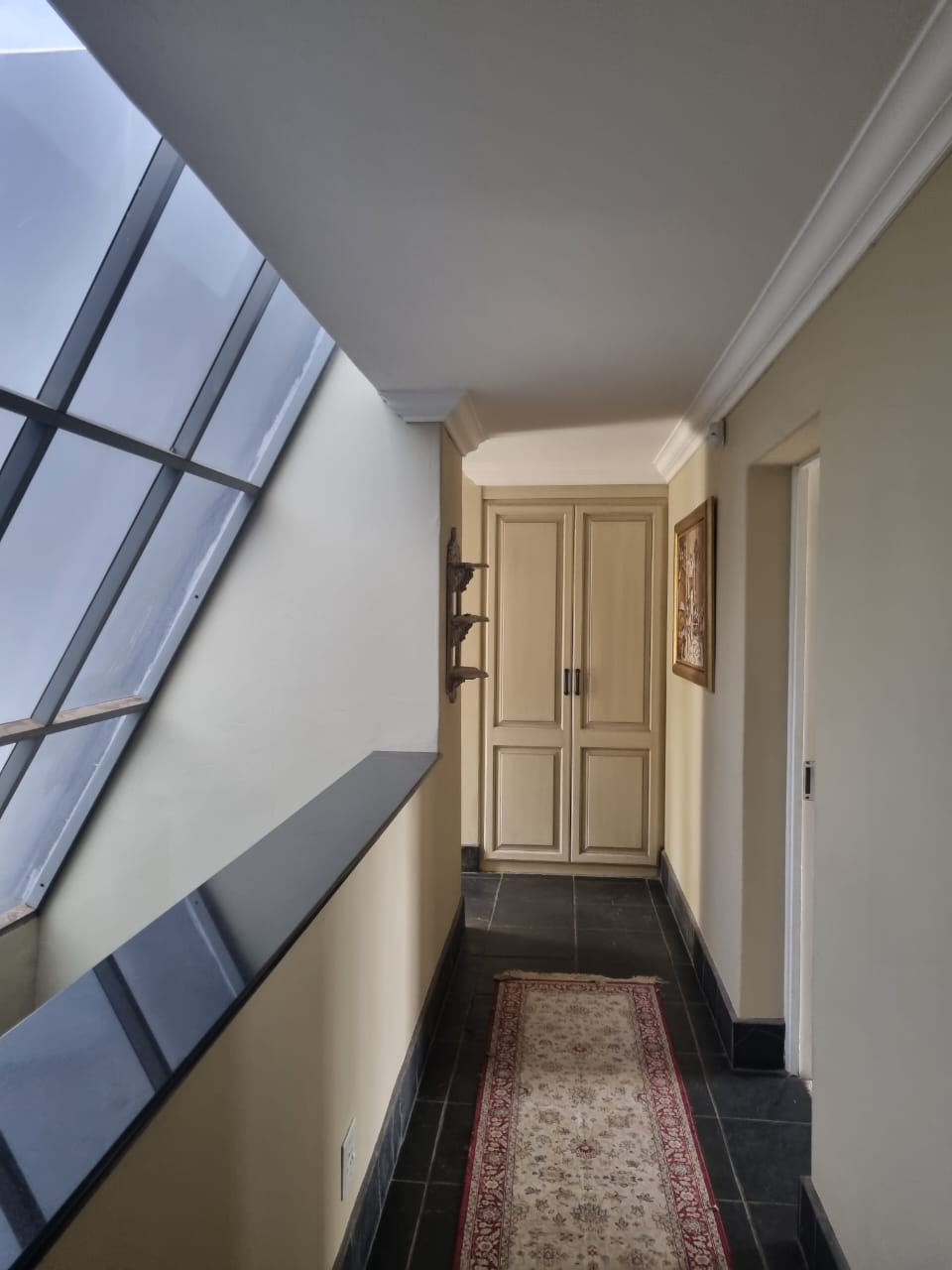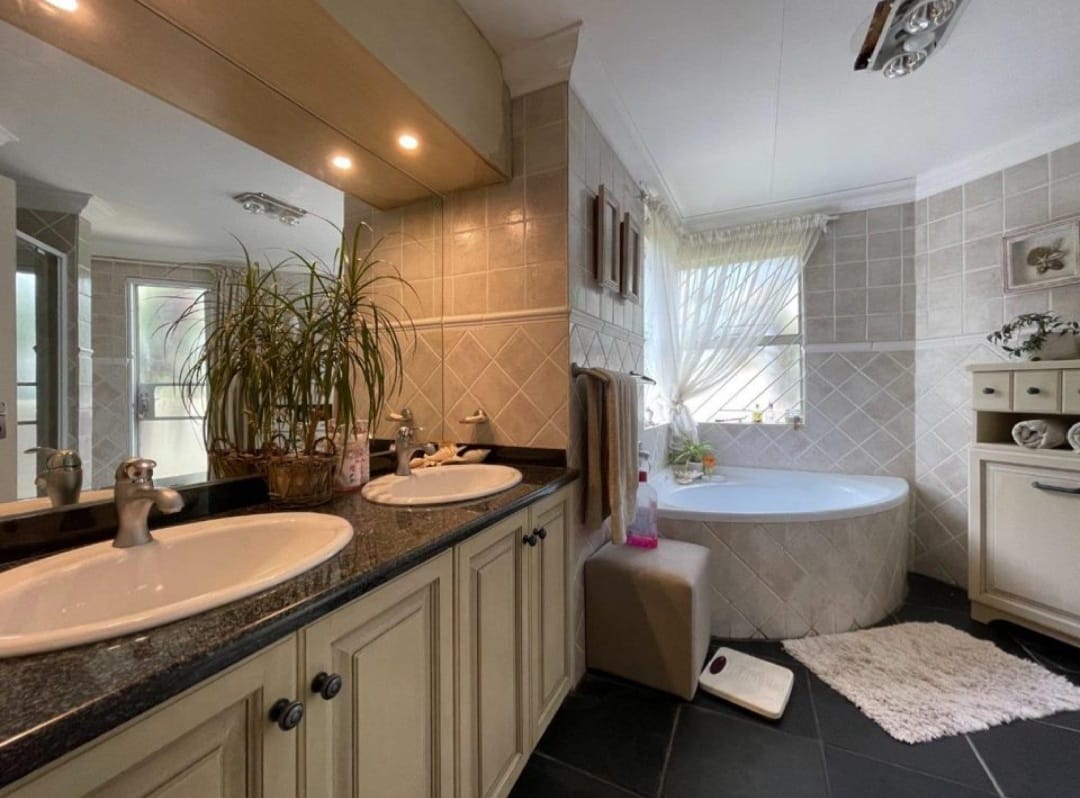 Luxurious 5-Bedroom Double Storey Mansion Experience opulence and grandeur in this stunning 5- bedroom double storey mansion. Perfect for those seeking luxurious lifestyle. Boasting top class quality finishes. The generous reception area with glass pivot door gives you access to this entertainers dream, ideal for a large family. When entering the property you are met by a guest toilet to your left and slate tiled floors throughout the house. Downstairs: Downstairs to your right you will find the prestigious wine cellar with its expert design and construction of custom built mahogany wine racks to solve your wine storage and display needs. There is a private large study that can be used for Home office, neatly carpeted with three perfectly fitted workstations made from Mahogany wood- ideal for the work from home family. There are two formal lounges with luxurious tiling rails. There is an entertainment area equipped with a built in braai, granite tops, slate tiles, jacuzzi and glass sliding doors opening up onto the beautiful, well designed back yard with a covered patio overlooking the well designed koi pond with its natural stone water feature. There is a bar area with solid beech wood finishes. There is a large dinning area adjacent to the kitchen for convenience in serving guests. There is a modern kitchen consisting of a semi-gas and electrical hob and oven, space for double door fridge, modern cupboards, ivory fantasy granite tops, soft closing cupboard doors and drawers, space for a microwave and blinds. The kitchen further offers a scullery with a walk in Pantry, double basin and space for 3 undercounter appliances. Upstairs: There are 5 large bedrooms upstairs, two full bathrooms, Master bedroom is en-suite. Two of the five bedrooms have their own balcony, the master bedroom has an air condition. Four of the bedrooms are carpeted with 100% wool carpets and all bedroom have ample built in cupboards. There is a one bedroom Flatlet, with its own entrance and Carport. The flat consists of one spacious bedroom with en-suite bathroom and ample built in cupboards, a lovely living area and a neat little kitchen. Security features at the house includes an alarm system, motorized security gate, burglar bars, beams, CCTV treli-doors in front of all outside doors. Other features include TV ports in all the rooms and an irrigation system with rain detector. Discover the cosmopolitan convenience and friendly atmosphere of this leafy home.. Extra Features Jacuzzi Gym, koi pond Scenic views from upper floors Ample Parking Ideal for: Large families High end Executives Those seeking luxury and exclusivity Schedule a viewing today and indulge in the finer things in life! This magnificent property has lots to offer seeing is believing, Please book sometime to view this property before its too late.