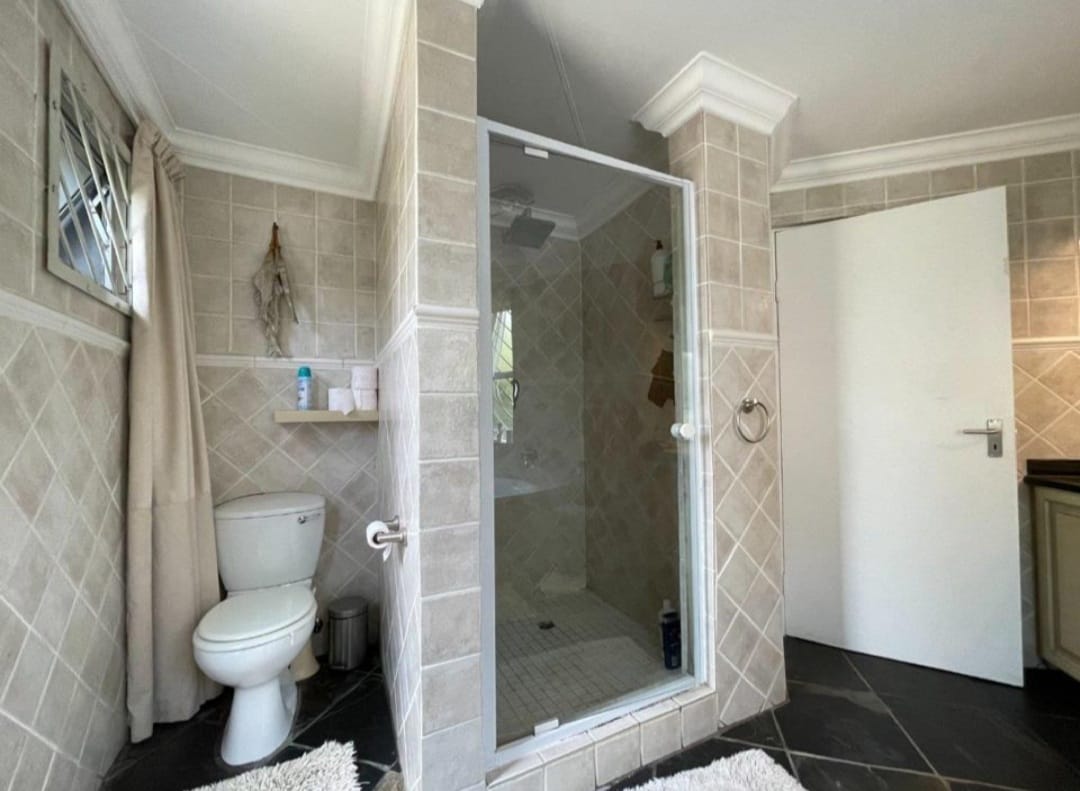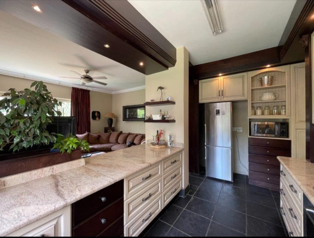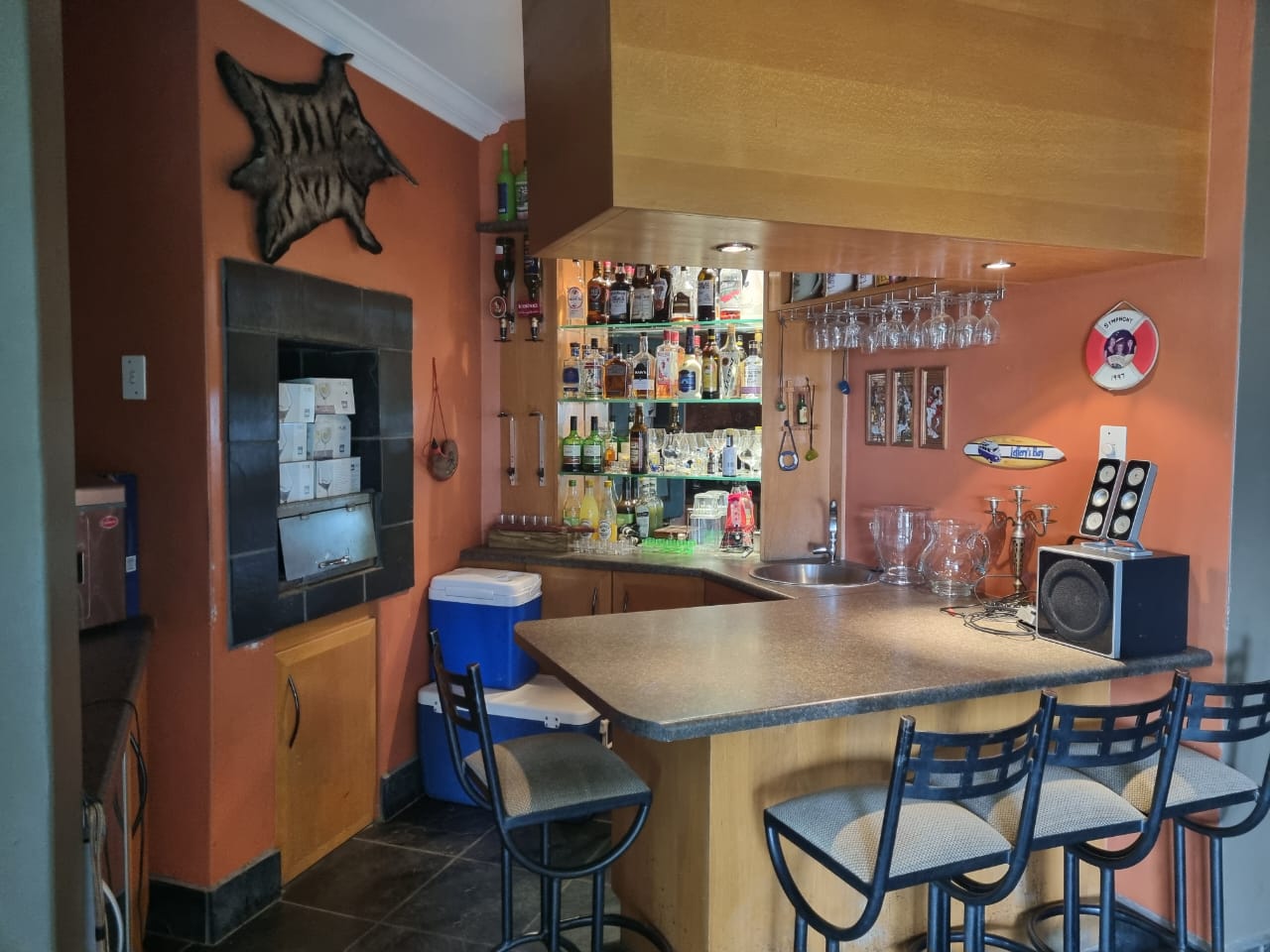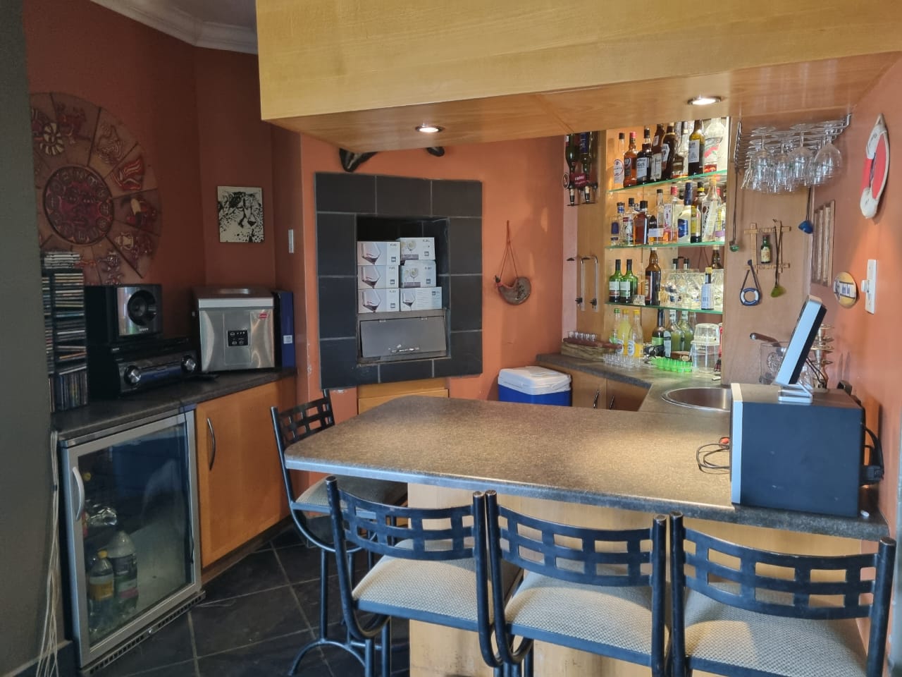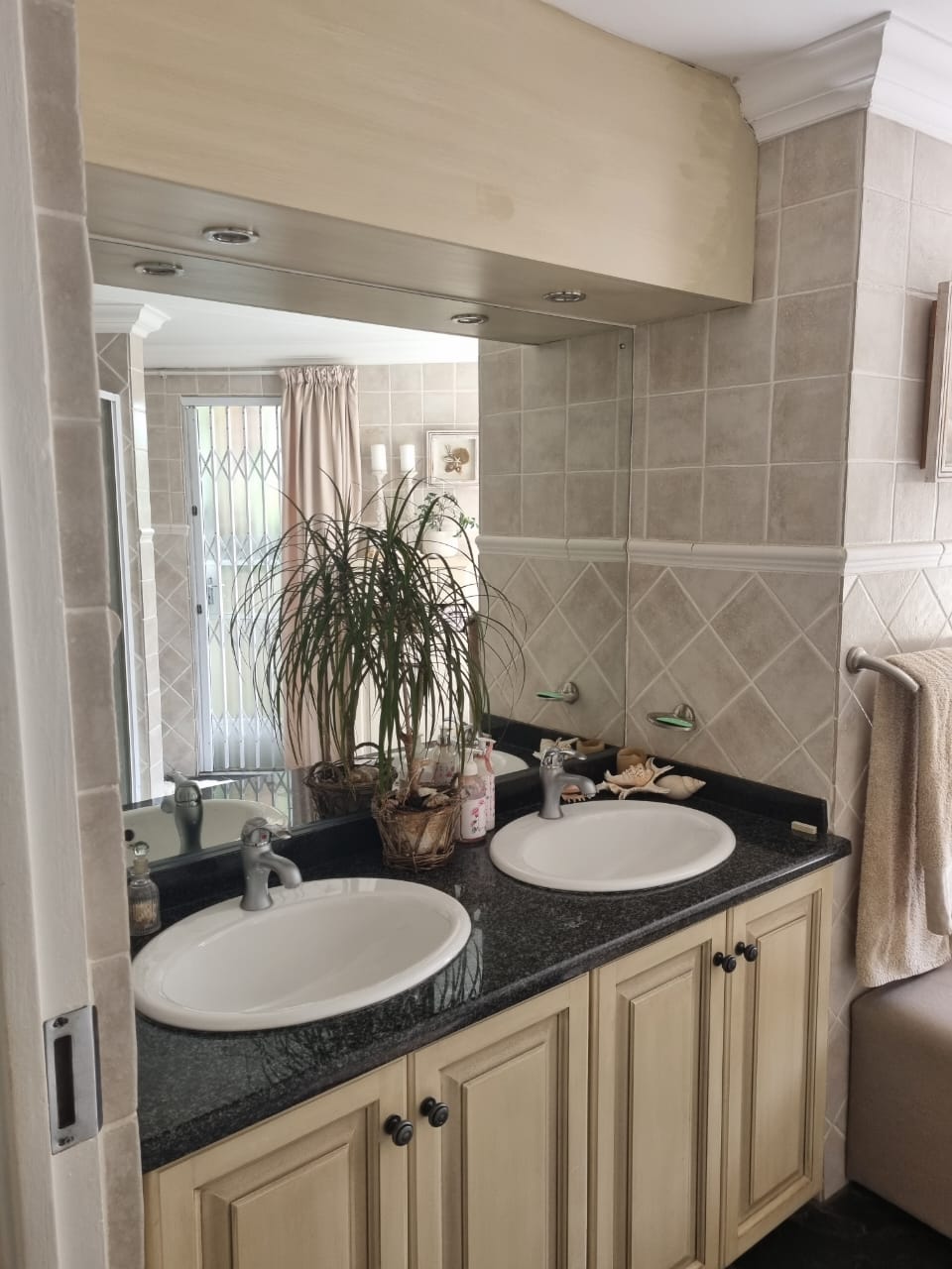 Luxurious 5-Bedroom Double Storey Mansion Experience opulence and grandeur in this stunning 5- bedroom double storey mansion. Perfect for those seeking luxurious lifestyle. Boasting top class quality finishes. The generous reception area with glass pivot door gives you access to this entertainers dream, ideal for a large family. When entering the property you are met by a guest toilet to your left and slate tiled floors throughout the house. Downstairs: Downstairs to your right you will find the prestigious wine cellar with its expert design and construction of custom built mahogany wine racks to solve your wine storage and display needs. There is a private large study that can be used for Home office, neatly carpeted with three perfectly fitted workstations made from Mahogany wood- ideal for the work from home family. There are two formal lounges with luxurious tiling rails. There is an entertainment area equipped with a built in braai, granite tops, slate tiles, jacuzzi and glass sliding doors opening up onto the beautiful, well designed back yard with a covered patio overlooking the well designed koi pond with its natural stone water feature. There is a bar area with solid beech wood finishes. There is a large dinning area adjacent to the kitchen for convenience in serving guests. There is a modern kitchen consisting of a semi-gas and electrical hob and oven, space for double door fridge, modern cupboards, ivory fantasy granite tops, soft closing cupboard doors and drawers, space for a microwave and blinds. The kitchen further offers a scullery with a walk in Pantry, double basin and space for 3 undercounter appliances. Upstairs: There are 5 large bedrooms upstairs, two full bathrooms, Master bedroom is en-suite. Two of the five bedrooms have their own balcony, the master bedroom has an air condition. Four of the bedrooms are carpeted with 100% wool carpets and all bedroom have ample built in cupboards. There is a one bedroom Flatlet, with its own entrance and Carport. The flat consists of one spacious bedroom with en-suite bathroom and ample built in cupboards, a lovely living area and a neat little kitchen. Security features at the house includes an alarm system, motorized security gate, burglar bars, beams, CCTV treli-doors in front of all outside doors. Other features include TV ports in all the rooms and an irrigation system with rain detector. Discover the cosmopolitan convenience and friendly atmosphere of this leafy home.. Extra Features Jacuzzi Gym, koi pond Scenic views from upper floors Ample Parking Ideal for: Large families High end Executives Those seeking luxury and exclusivity Schedule a viewing today and indulge in the finer things in life! This magnificent property has lots to offer seeing is believing, Please book sometime to view this property before its too late.