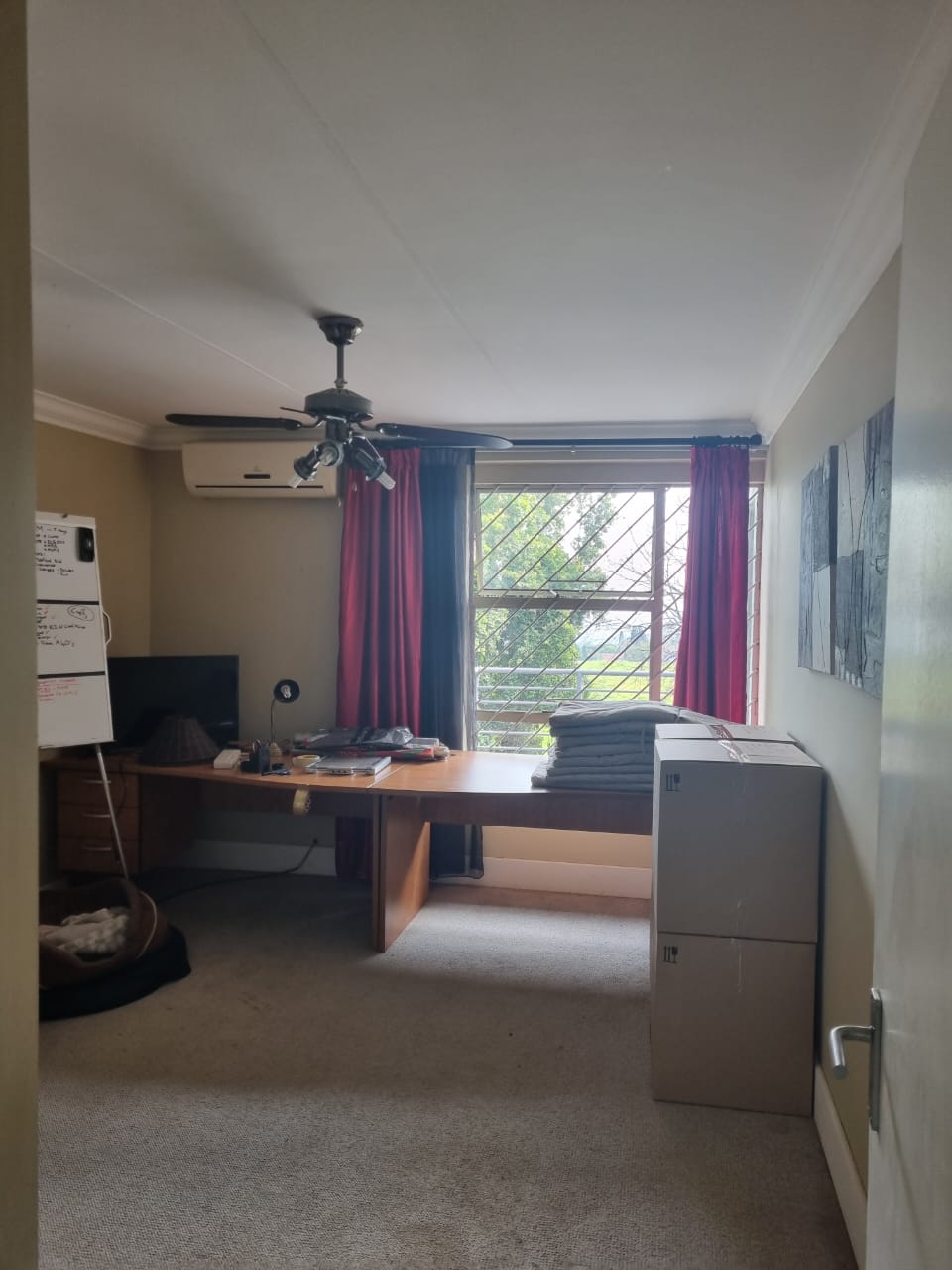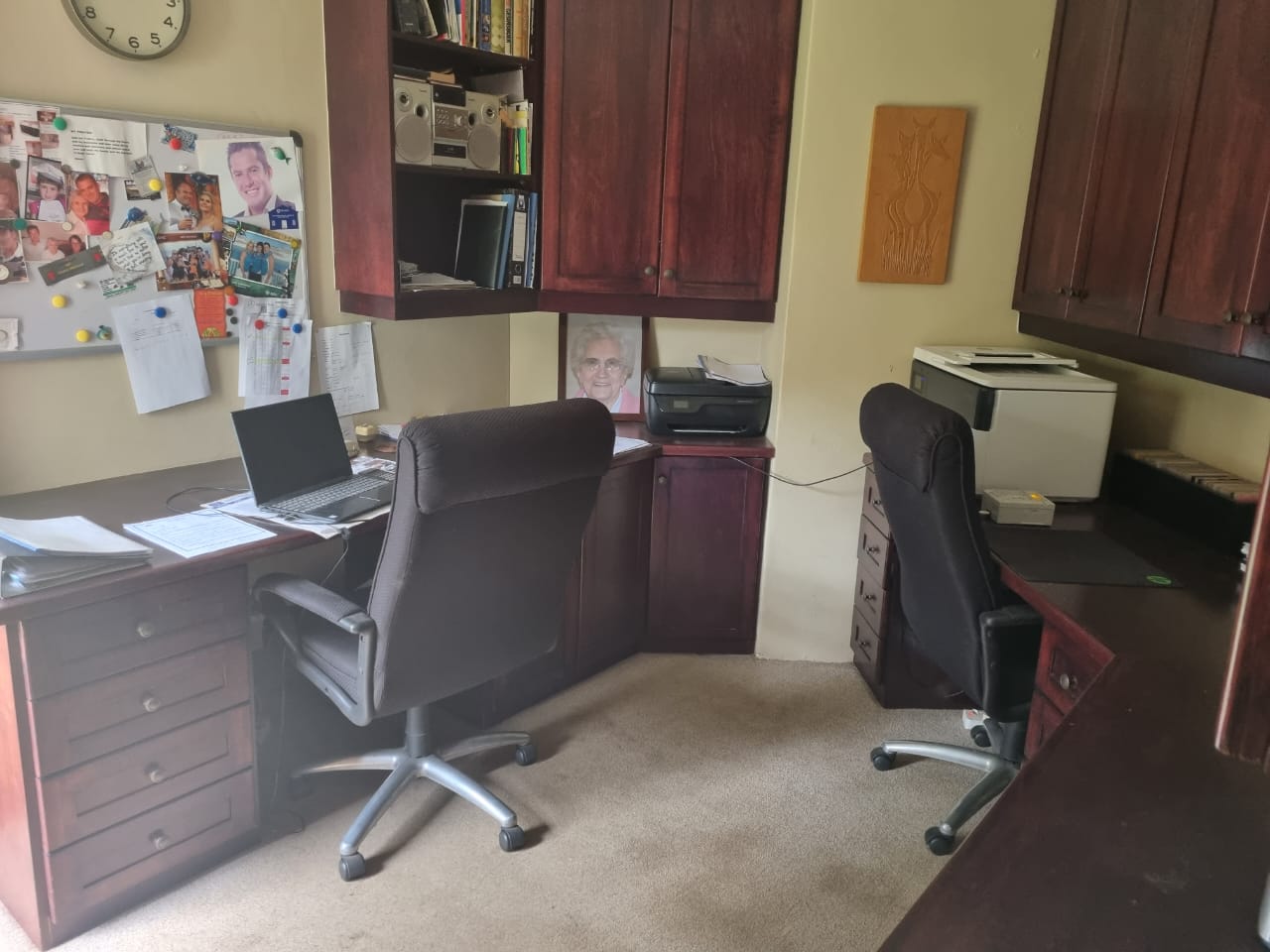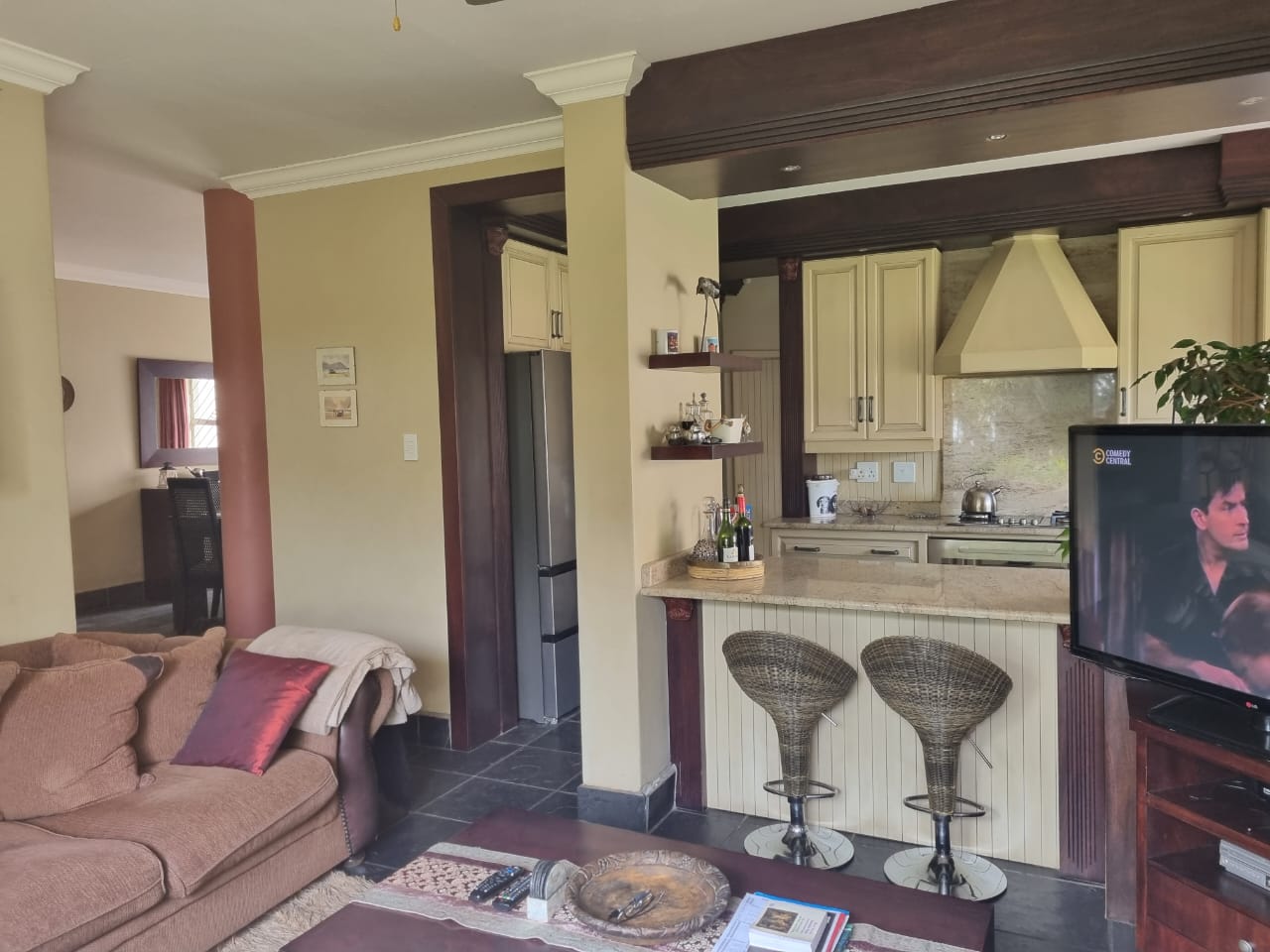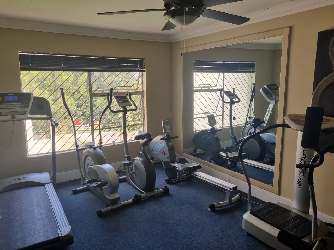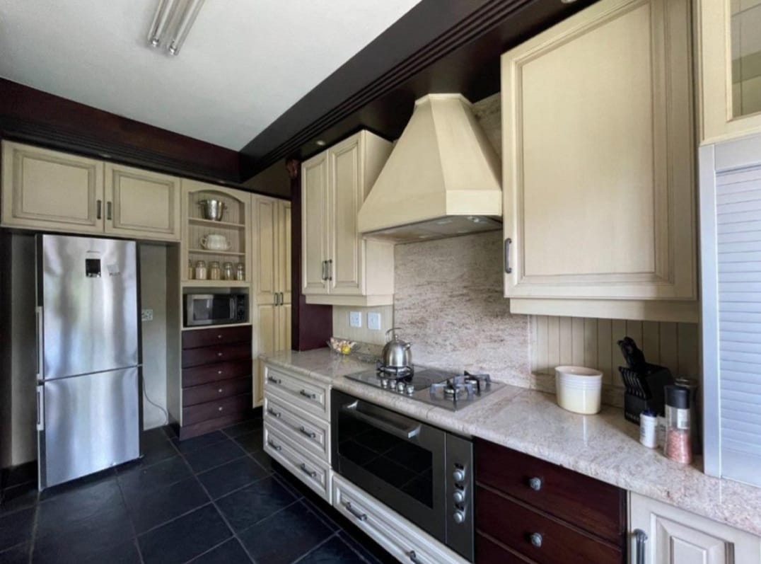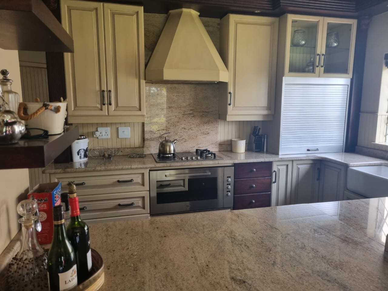 Luxurious 5-Bedroom Double Storey Mansion Experience opulence and grandeur in this stunning 5- bedroom double storey mansion. Perfect for those seeking luxurious lifestyle. Boasting top class quality finishes. The generous reception area with glass pivot door gives you access to this entertainers dream, ideal for a large family. When entering the property you are met by a guest toilet to your left and slate tiled floors throughout the house. Downstairs: Downstairs to your right you will find the prestigious wine cellar with its expert design and construction of custom built mahogany wine racks to solve your wine storage and display needs. There is a private large study that can be used for Home office, neatly carpeted with three perfectly fitted workstations made from Mahogany wood- ideal for the work from home family. There are two formal lounges with luxurious tiling rails. There is an entertainment area equipped with a built in braai, granite tops, slate tiles, jacuzzi and glass sliding doors opening up onto the beautiful, well designed back yard with a covered patio overlooking the well designed koi pond with its natural stone water feature. There is a bar area with solid beech wood finishes. There is a large dinning area adjacent to the kitchen for convenience in serving guests. There is a modern kitchen consisting of a semi-gas and electrical hob and oven, space for double door fridge, modern cupboards, ivory fantasy granite tops, soft closing cupboard doors and drawers, space for a microwave and blinds. The kitchen further offers a scullery with a walk in Pantry, double basin and space for 3 undercounter appliances. Upstairs: There are 5 large bedrooms upstairs, two full bathrooms, Master bedroom is en-suite. Two of the five bedrooms have their own balcony, the master bedroom has an air condition. Four of the bedrooms are carpeted with 100% wool carpets and all bedroom have ample built in cupboards. There is a one bedroom Flatlet, with its own entrance and Carport. The flat consists of one spacious bedroom with en-suite bathroom and ample built in cupboards, a lovely living area and a neat little kitchen. Security features at the house includes an alarm system, motorized security gate, burglar bars, beams, CCTV treli-doors in front of all outside doors. Other features include TV ports in all the rooms and an irrigation system with rain detector. Discover the cosmopolitan convenience and friendly atmosphere of this leafy home.. Extra Features Jacuzzi Gym, koi pond Scenic views from upper floors Ample Parking Ideal for: Large families High end Executives Those seeking luxury and exclusivity Schedule a viewing today and indulge in the finer things in life! This magnificent property has lots to offer seeing is believing, Please book sometime to view this property before its too late.