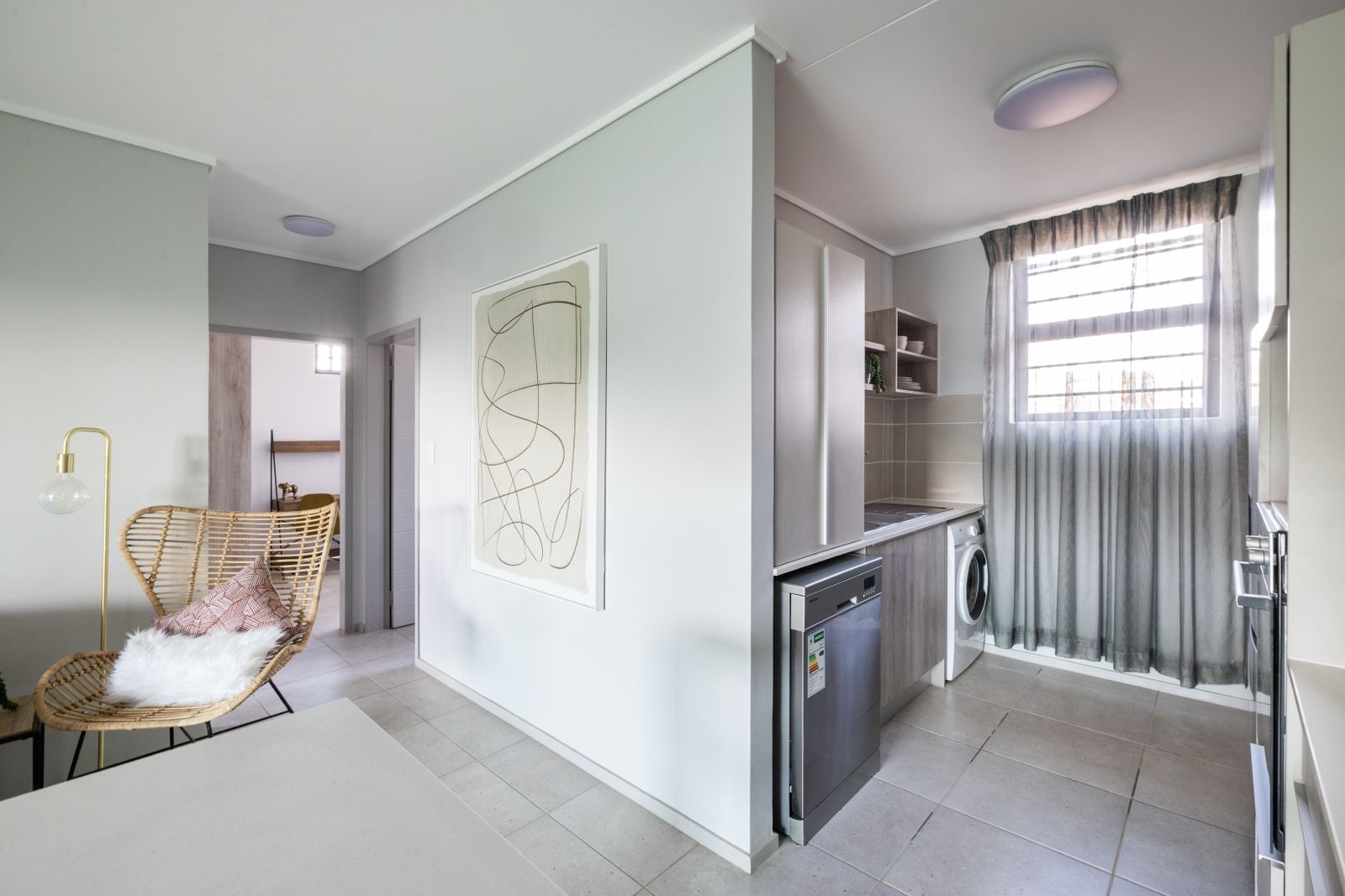 The open-plan lounge is spacious and inviting, providing a perfect setting for relaxation and entertaining guests. The open-plan kitchen is designed for convenience, complete with a breakfast nook, an eye-level oven, a glass hob, and ample cupboard space. It also includes dedicated spaces for a washing machine and a dishwasher, making daily chores effortless.