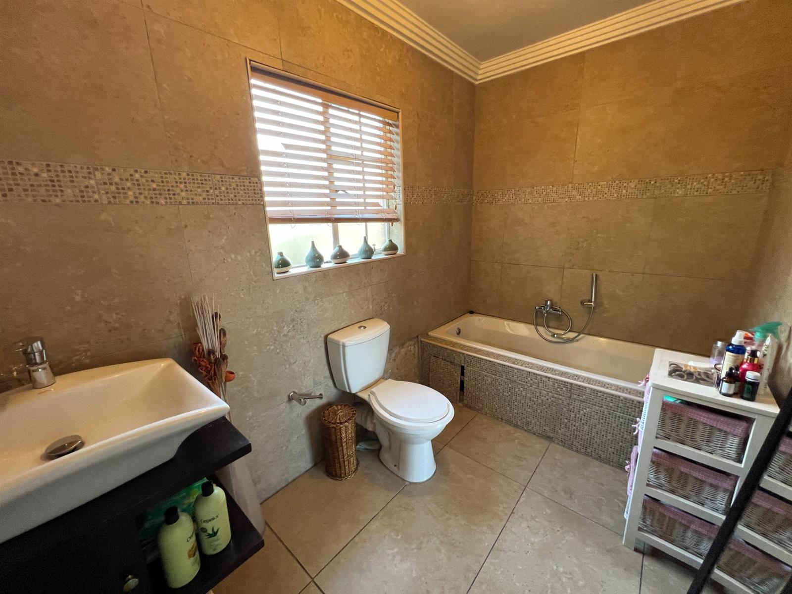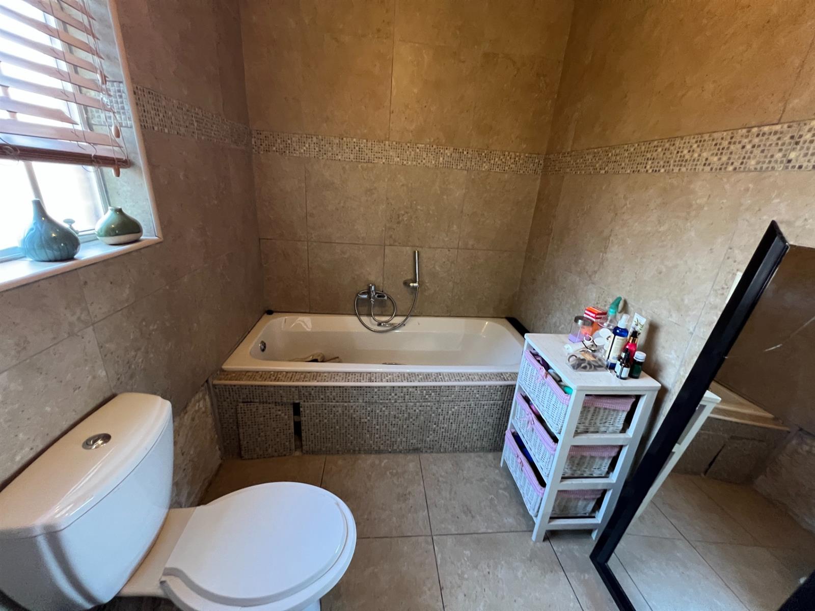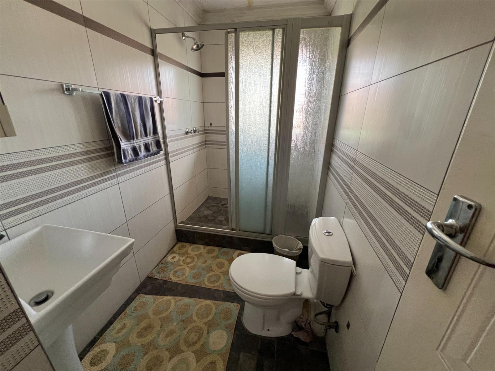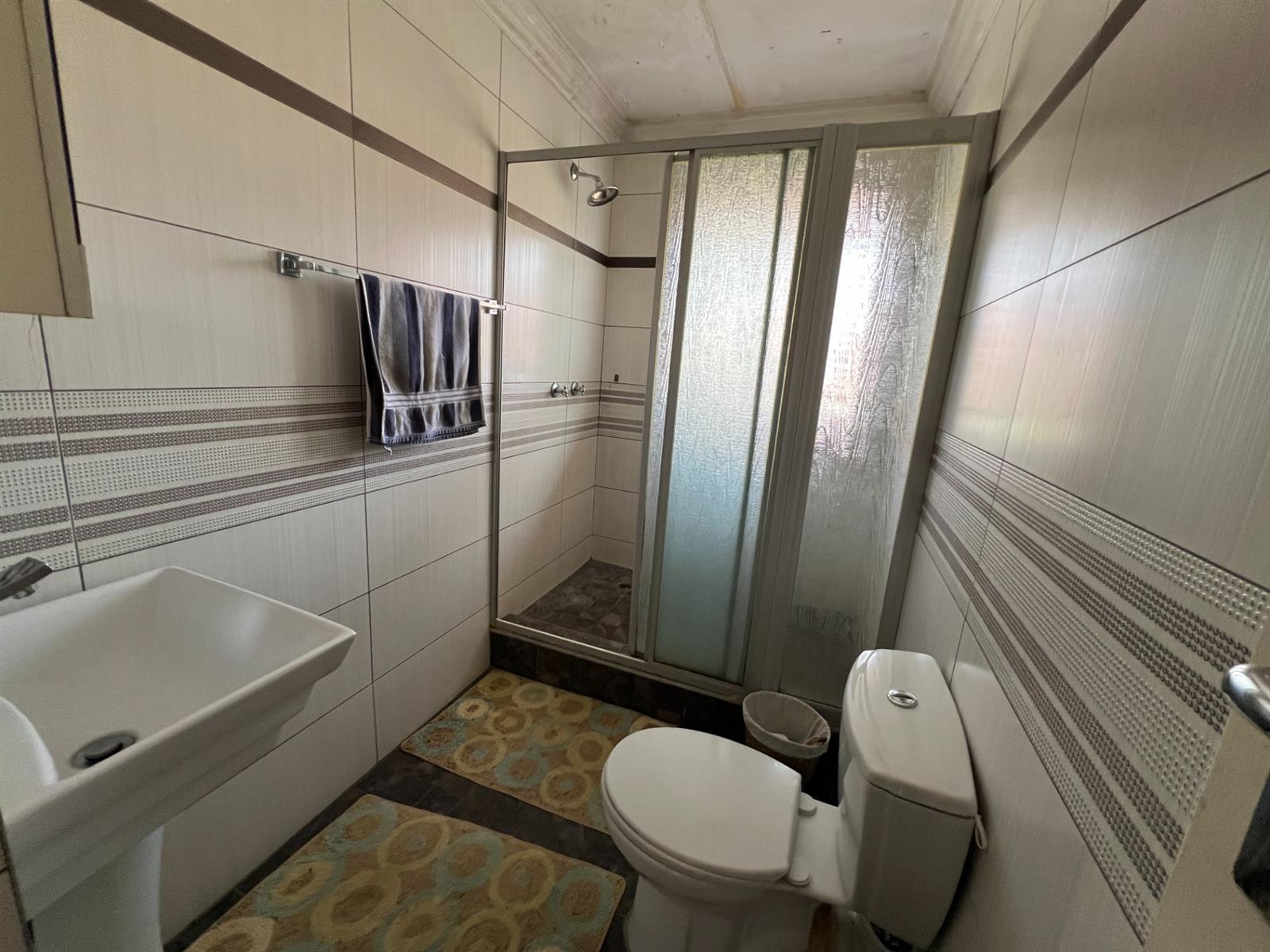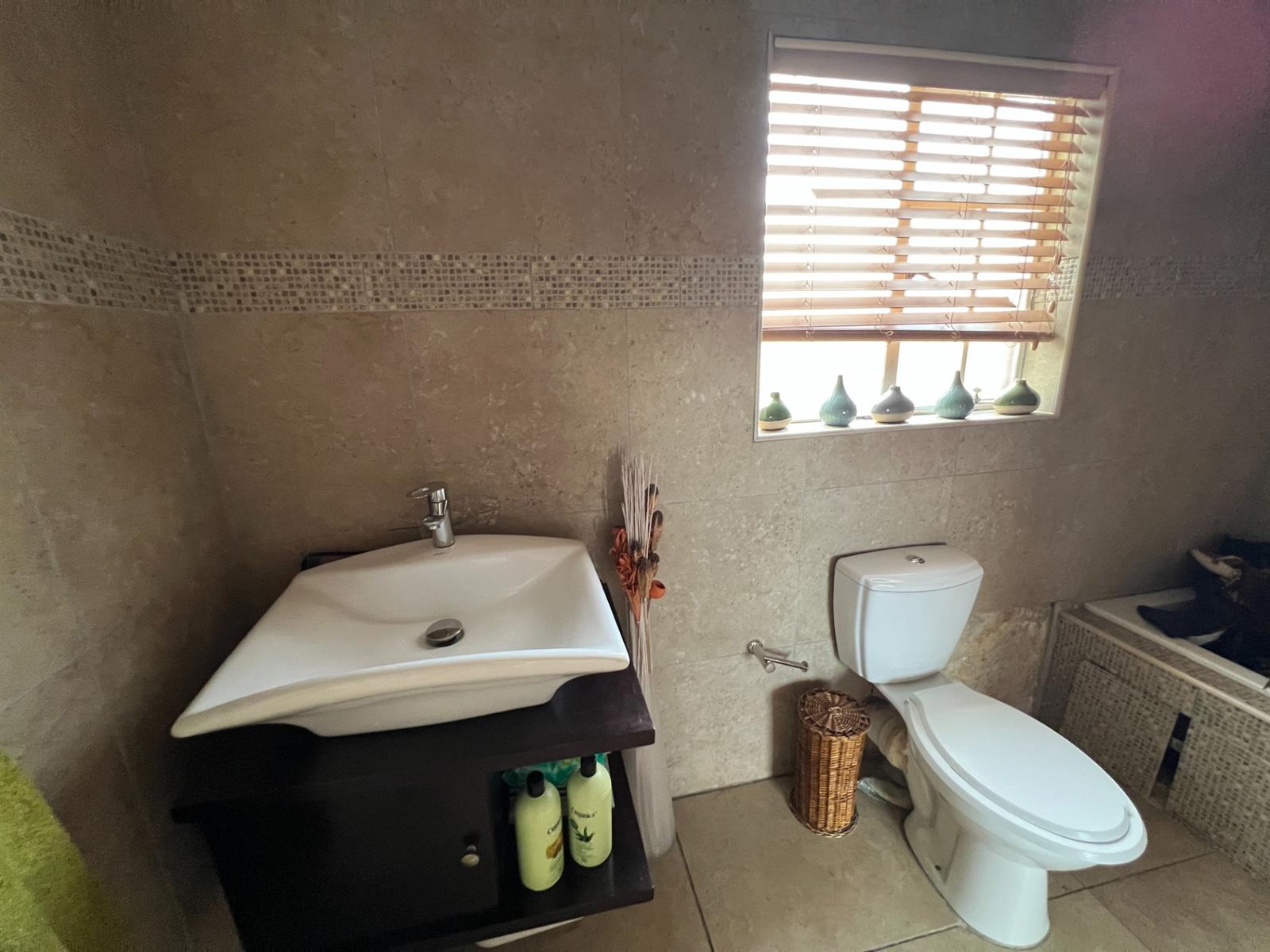 Shared Bathroom: Fully tiled with shower, basin, toilet, and blinds.