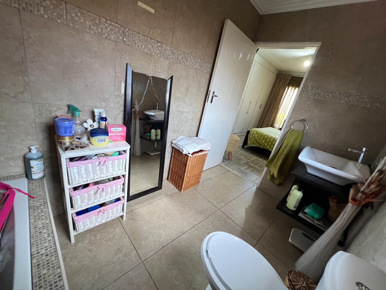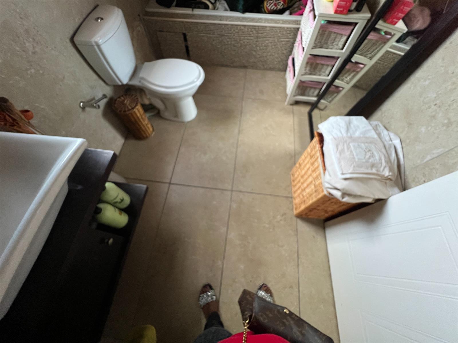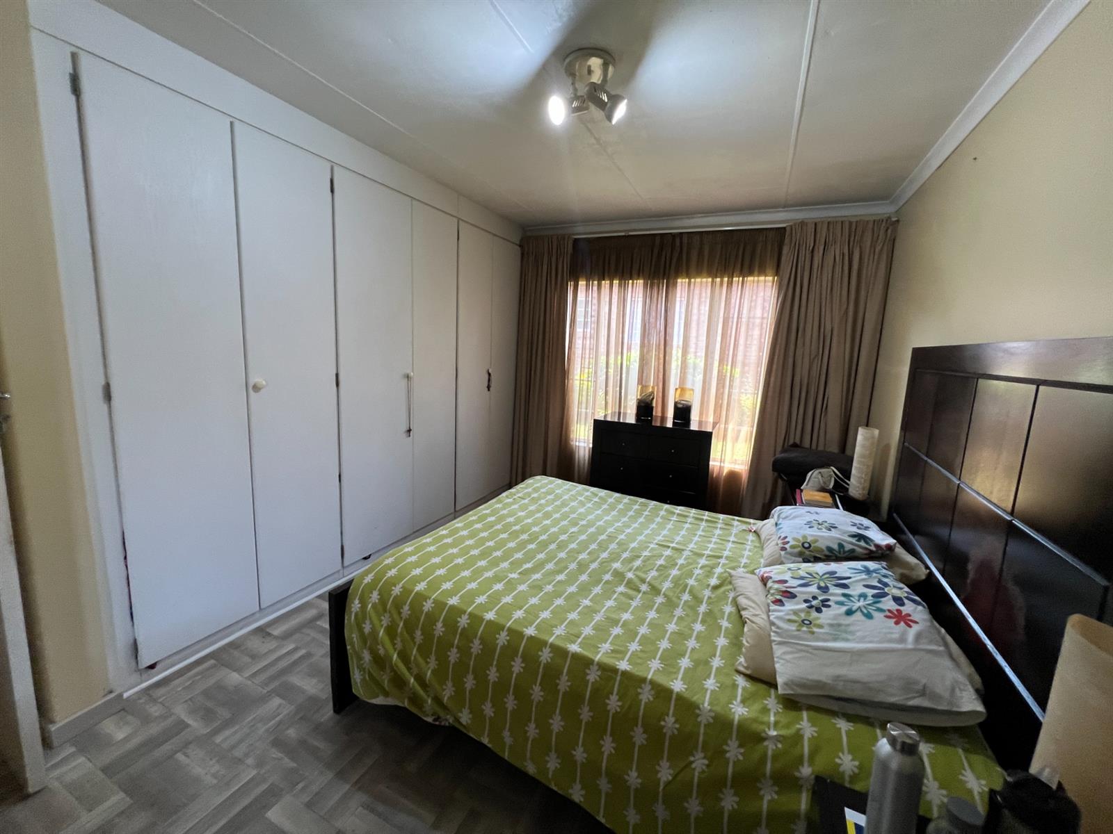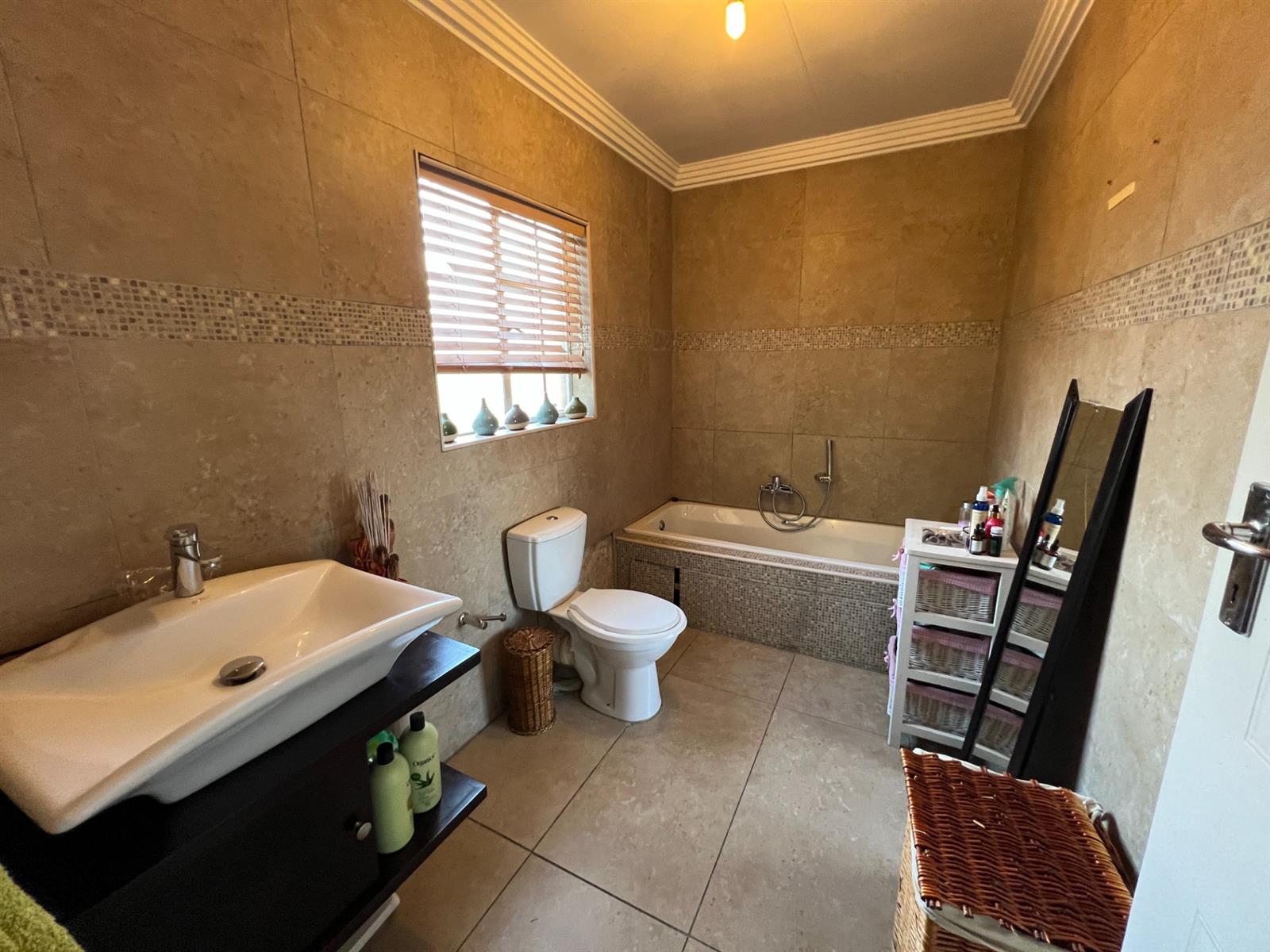Main Bedroom: Built-in cupboards, laminate flooring, Rhino ceiling, and en-suite bathroom with bathtub, toilet, and basin.
