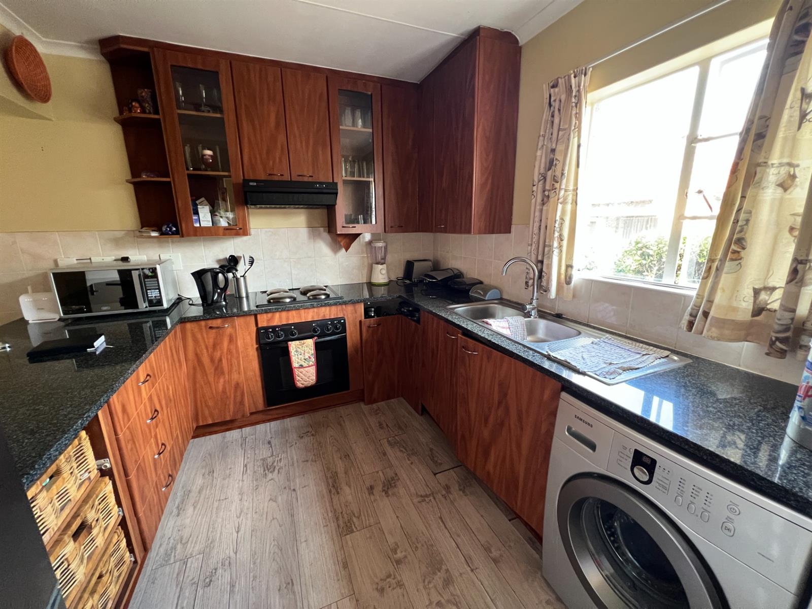Modern Kitchen: Fitted with built-in cupboards, granite countertops, extractor fan, hob, oven, and double sink.