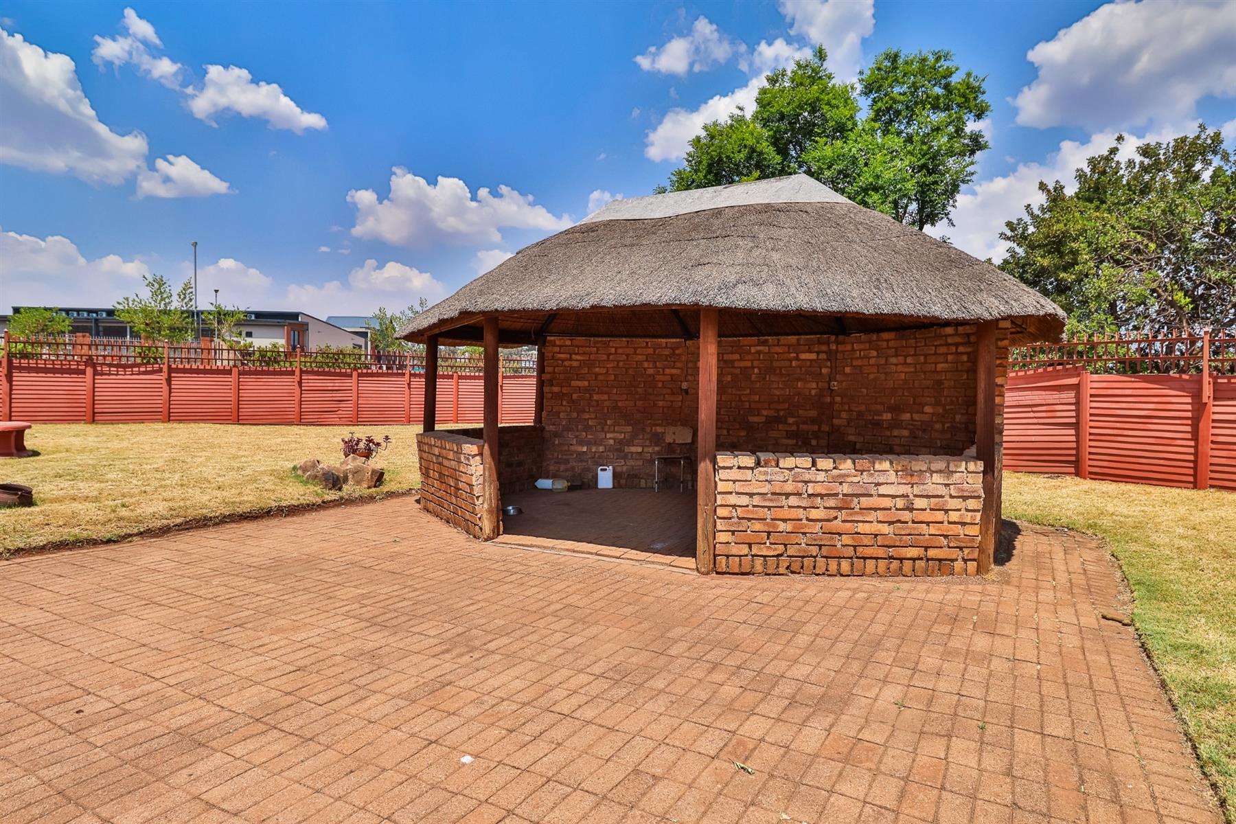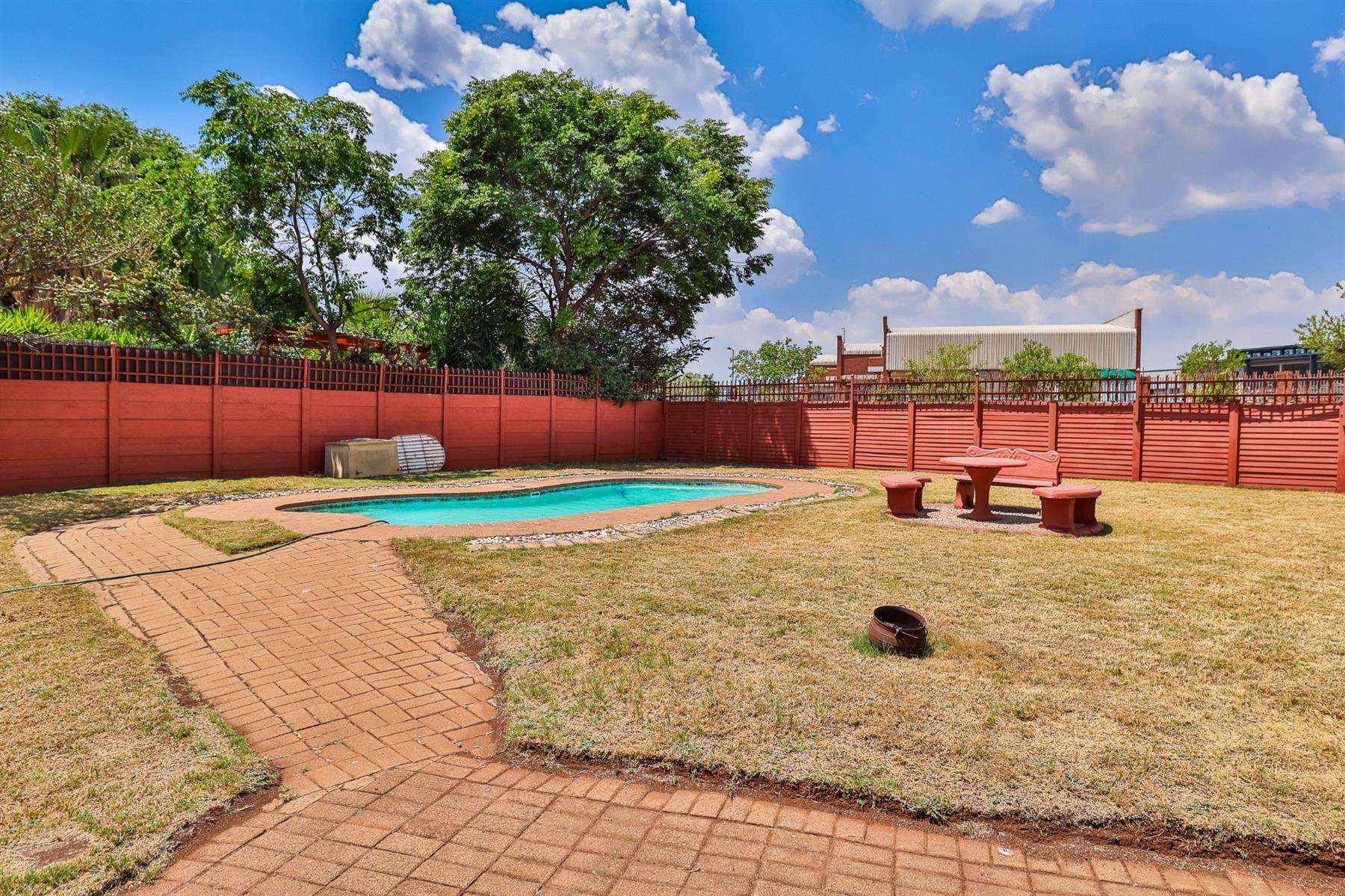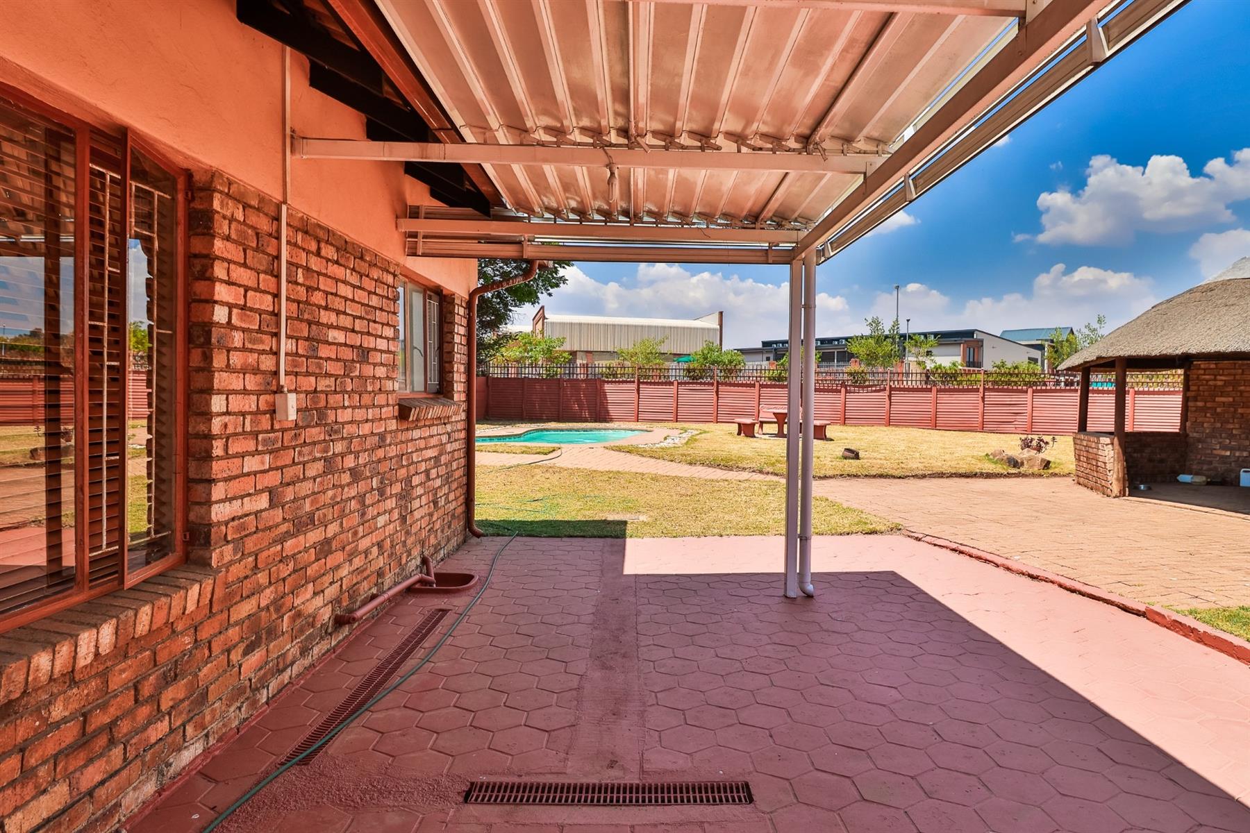 At the rear of the home, you’ll find a swimming pool, thatched lapa, and a spacious garden—perfect for outdoor entertaining and family enjoyment.