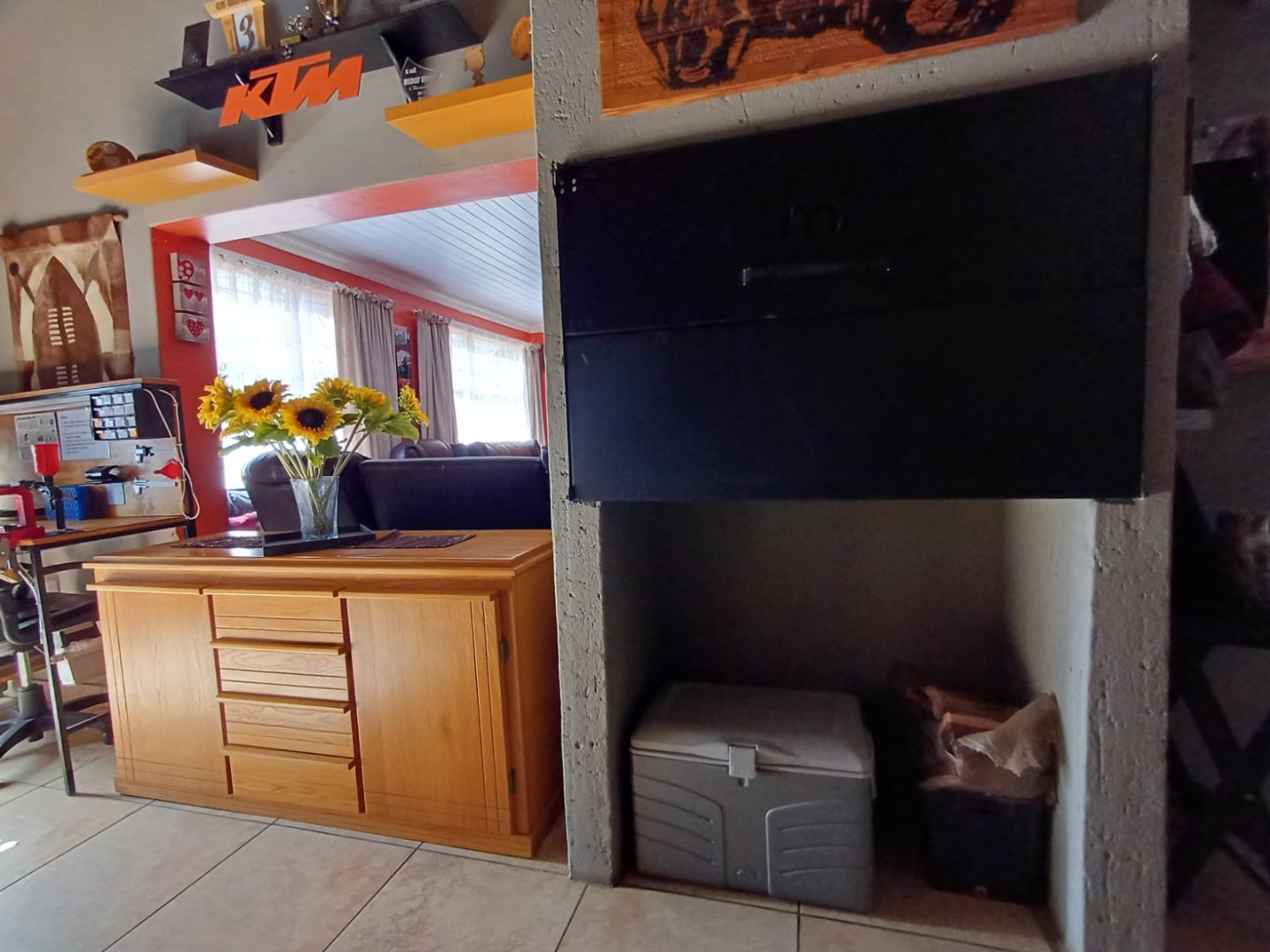 The home features three spacious bedrooms, all with built-in cupboards, and a sleek, modern bathroom. The open-plan lounge flows effortlessly into the dining area, where a built-in braai creates the ideal setting for year-round entertaining. Please note the bar is not included in the sale.