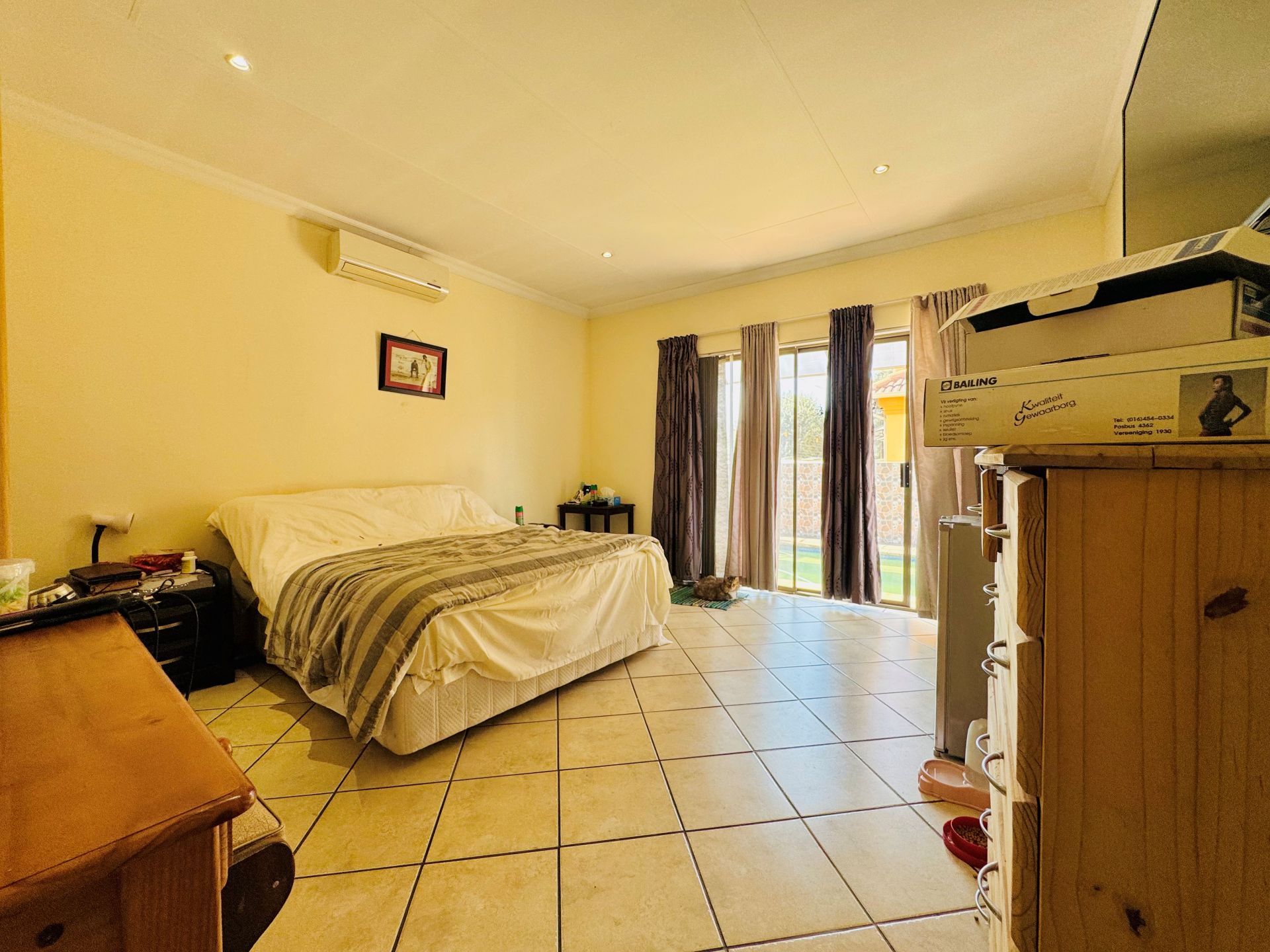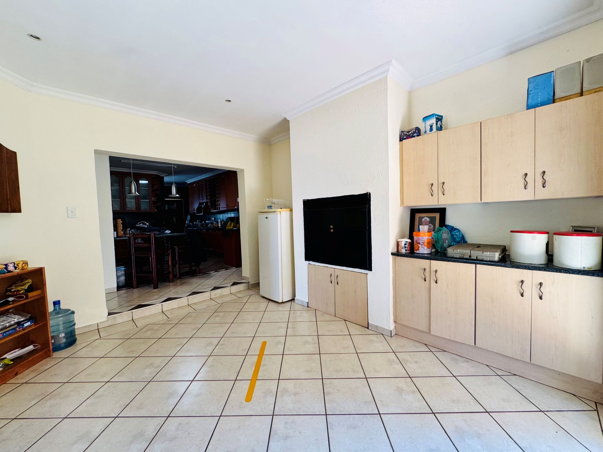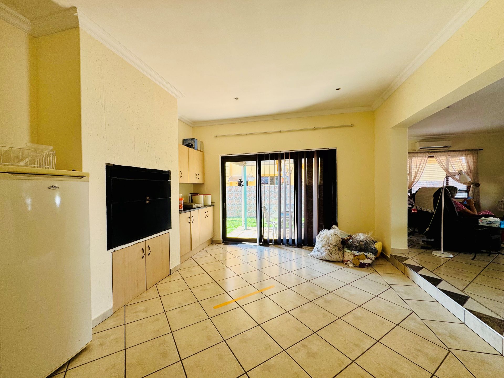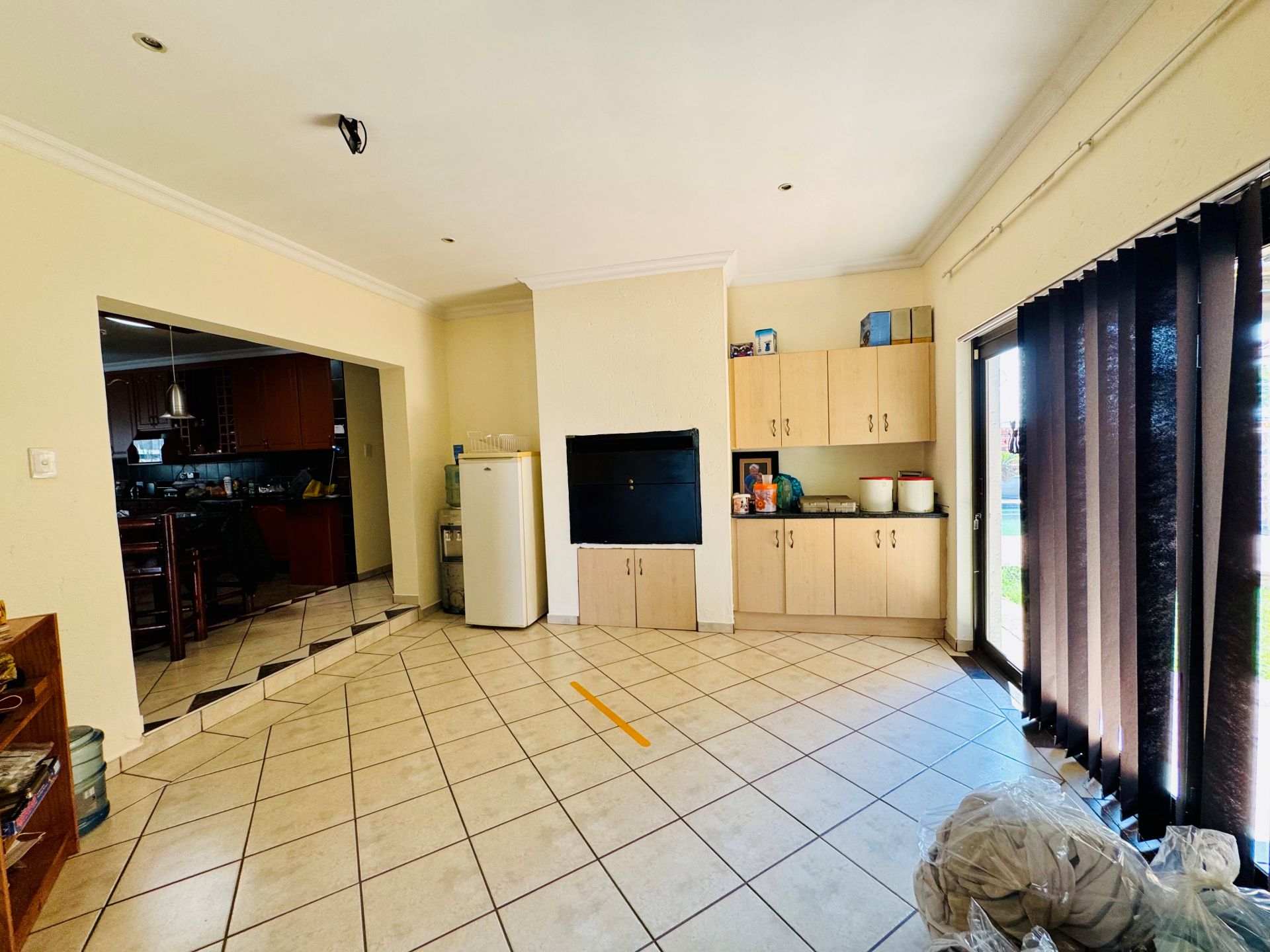 An entertainment room with a built-in braai sits adjacent to the living areas, while the open-plan living area flows effortlessly onto the covered patio — ideal for indoor-outdoor living. The generous garden and sparkling swimming pool complete the picture of relaxed estate living.