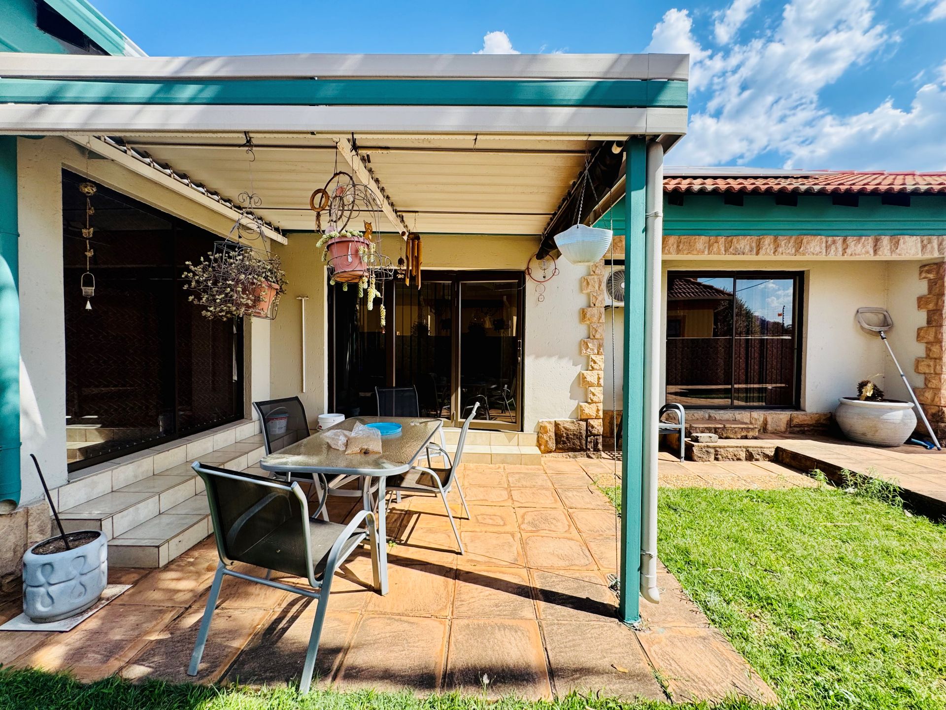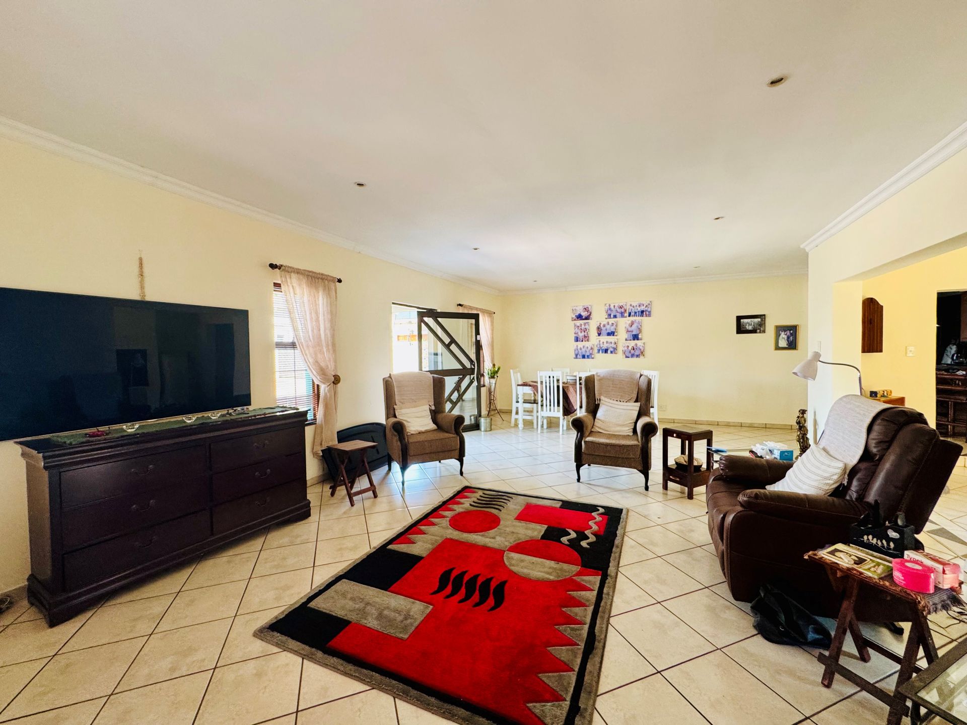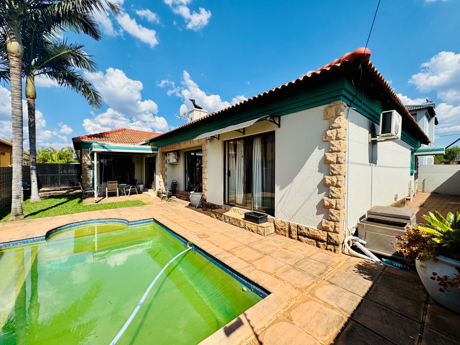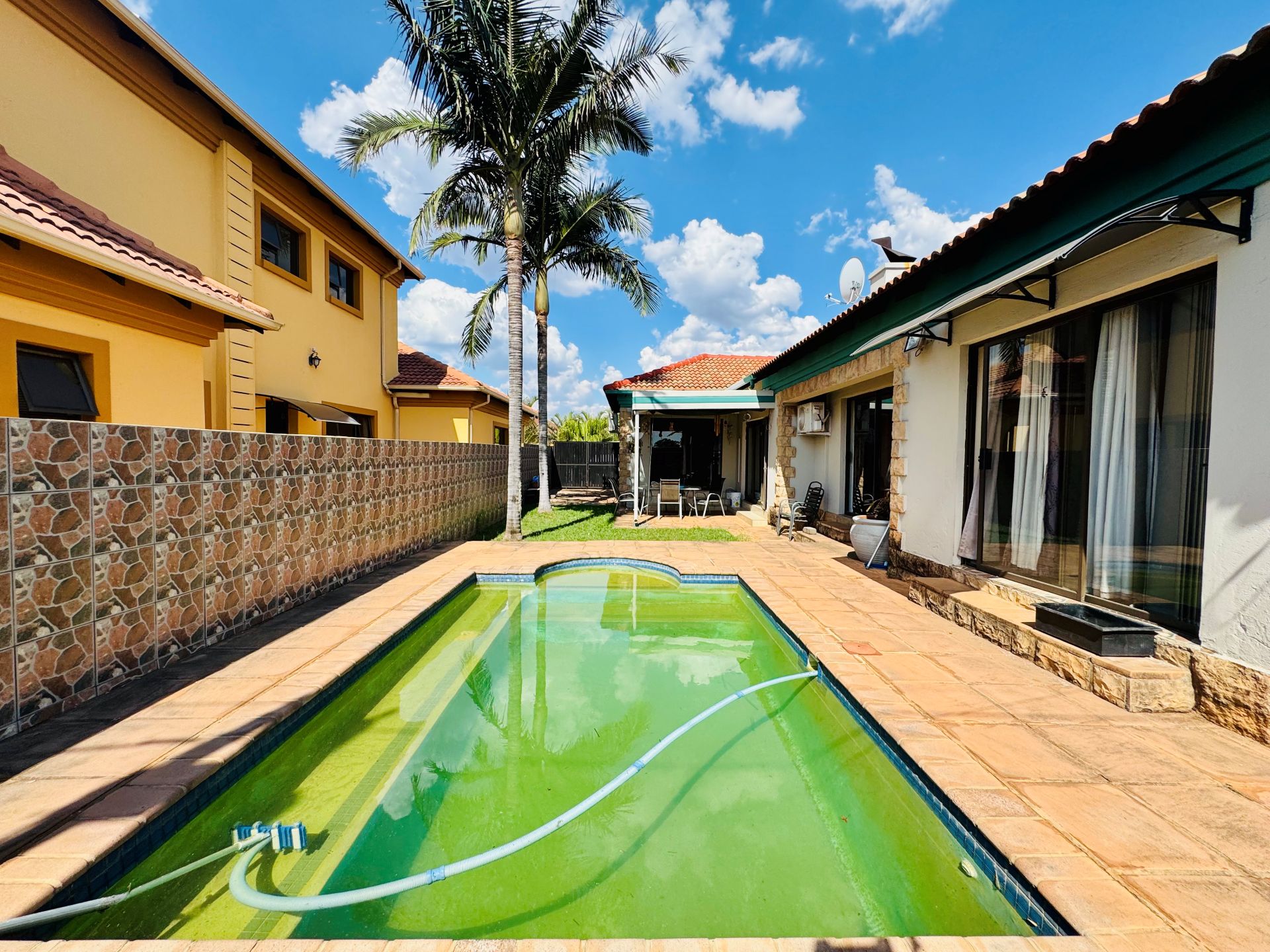 An entertainment room with a built-in braai sits adjacent to the living areas, while the open-plan living area flows effortlessly onto the covered patio — ideal for indoor-outdoor living. The generous garden and sparkling swimming pool complete the picture of relaxed estate living.
