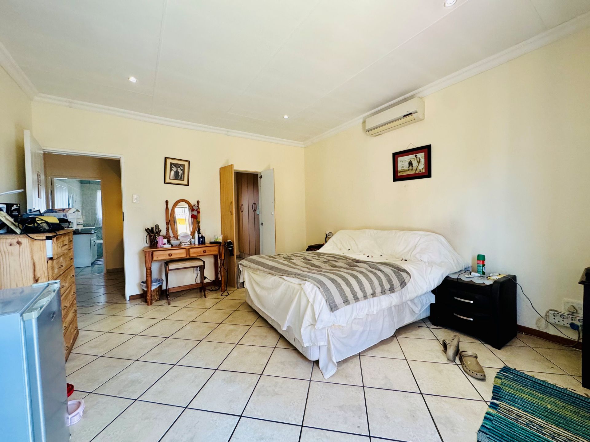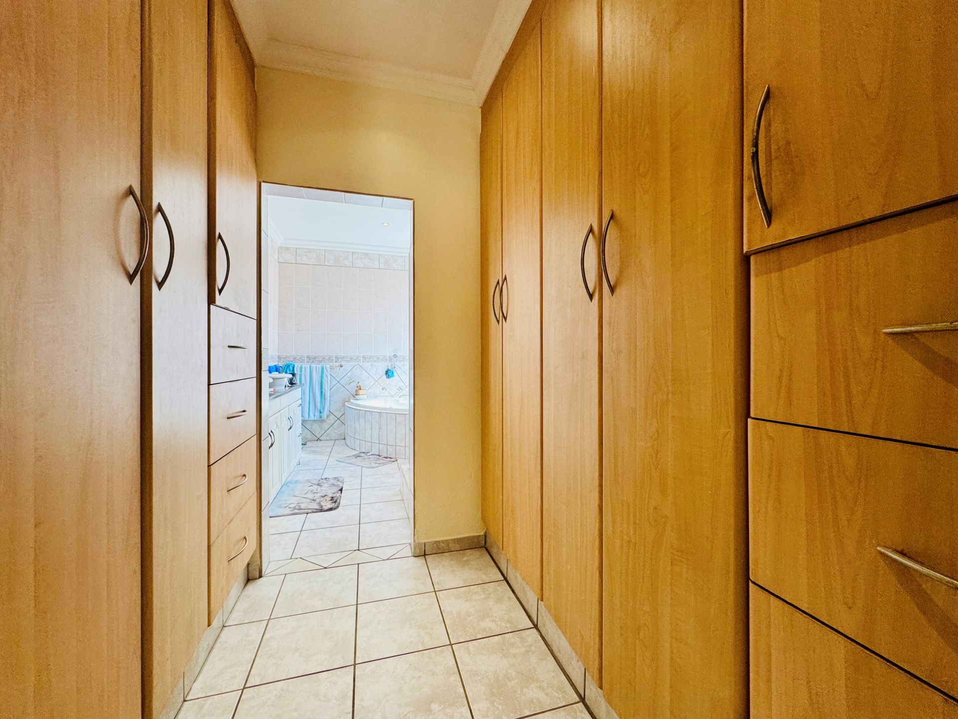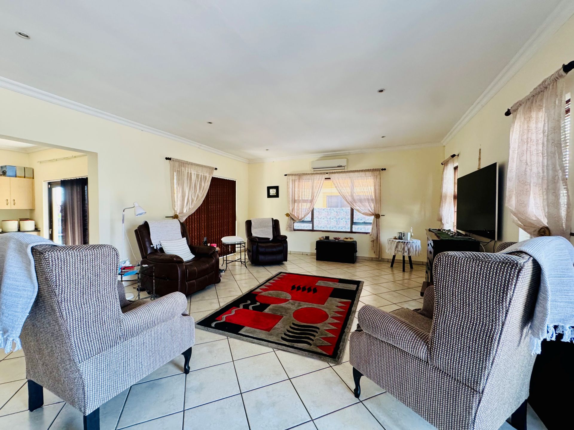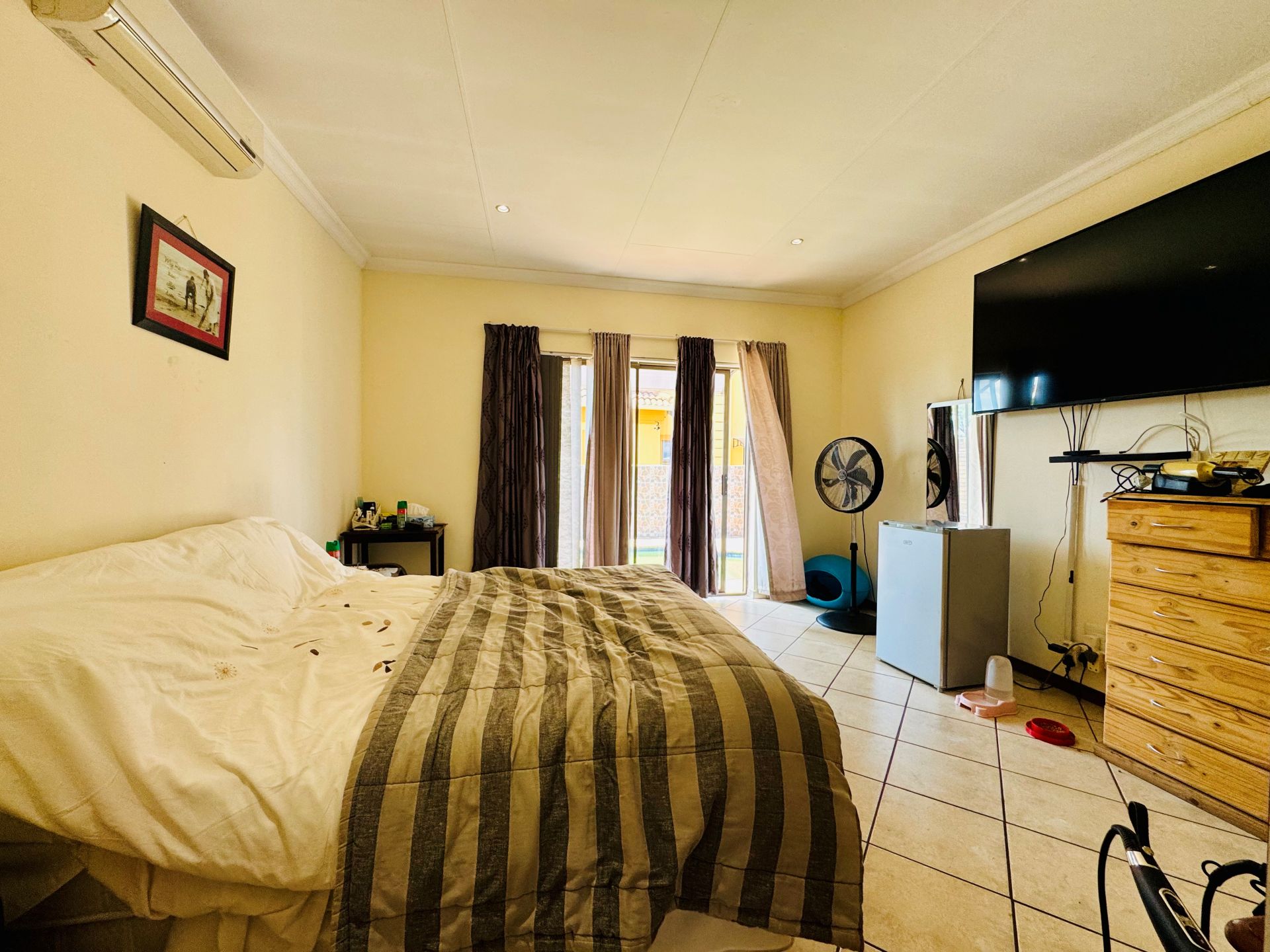 An entertainment room with a built-in braai sits adjacent to the living areas, while the open-plan living area flows effortlessly onto the covered patio — ideal for indoor-outdoor living. The generous garden and sparkling swimming pool complete the picture of relaxed estate living.