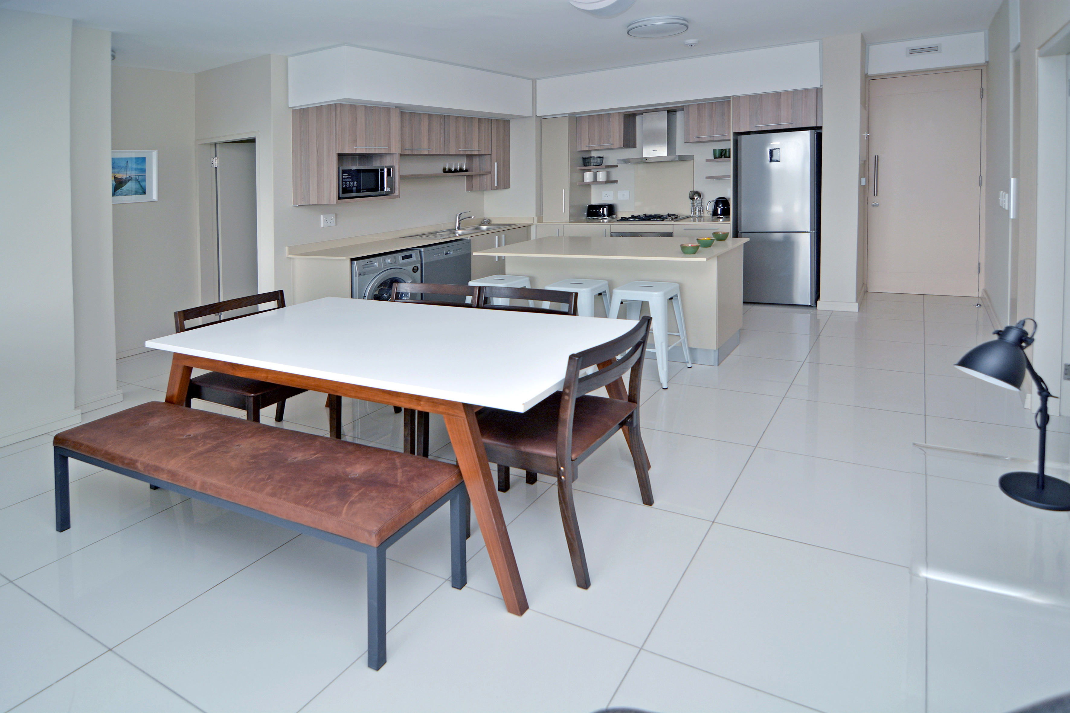 -Open plan living with space for two appliances in the kitchen, granite tops, and gas hobs.