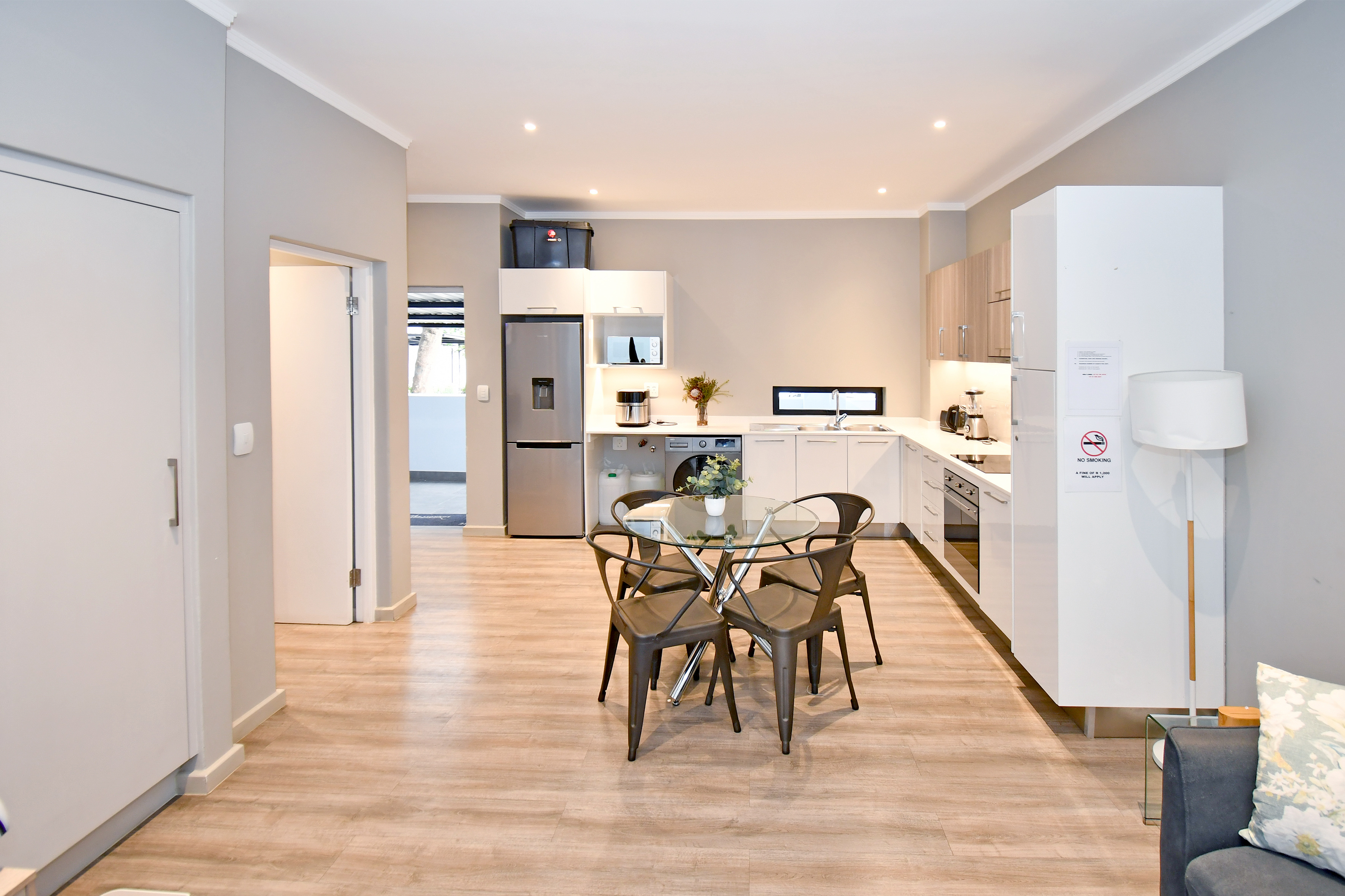The open-plan kitchen is equipped with sleek granite countertops and offers two plumbing points for water-based appliances – ideal for a washing machine and dishwasher.