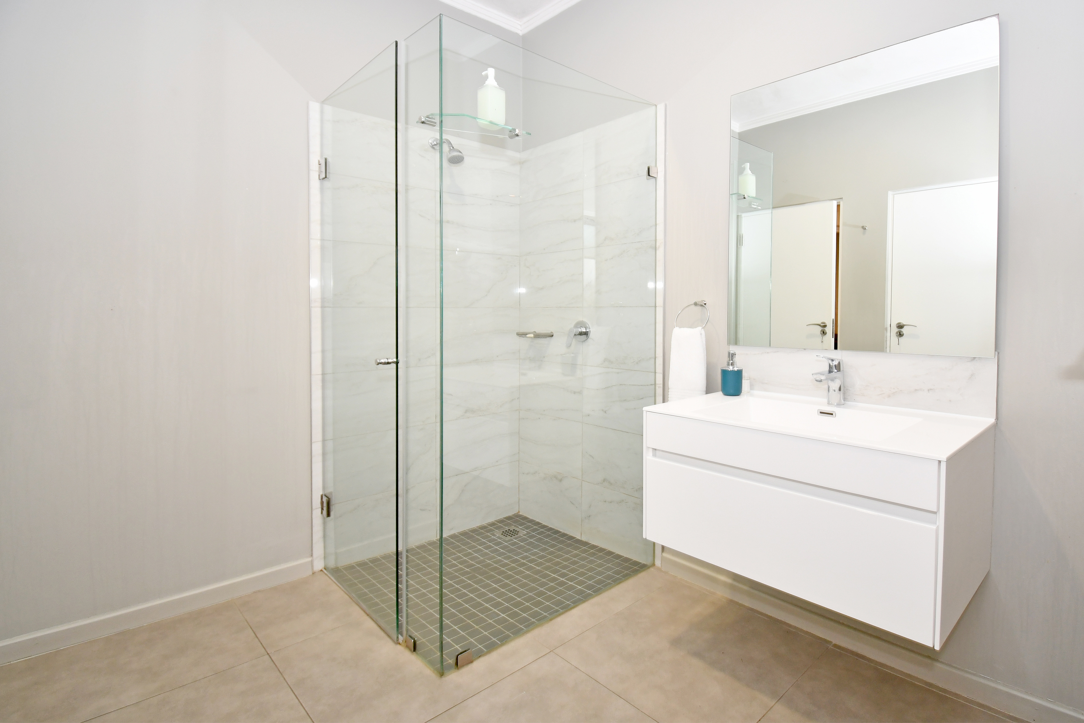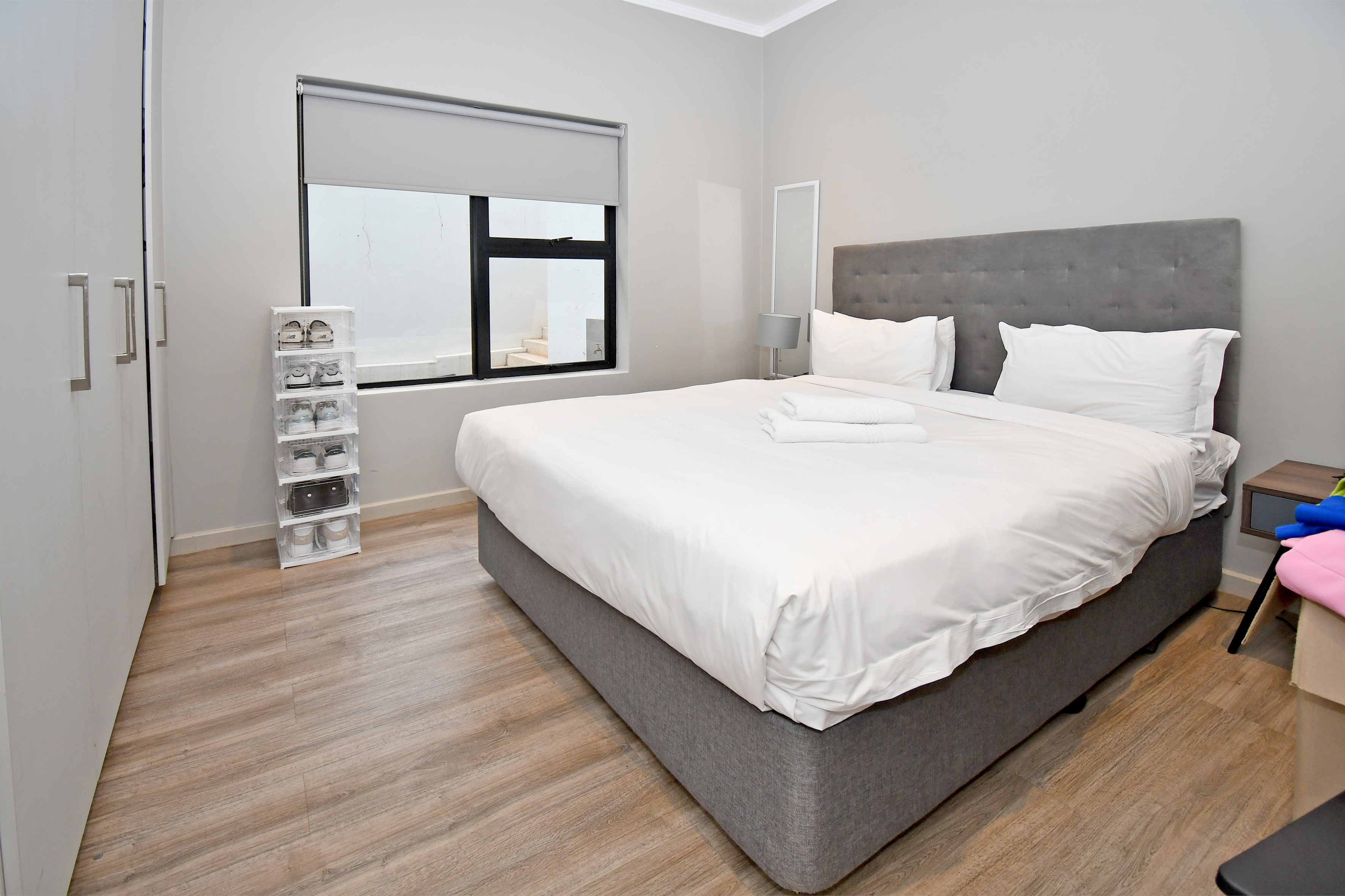The spacious bedroom features an en-suite bathroom, complete with a modern tiled finish and a walk-in shower. The apartment boasts laminated flooring throughout, giving it a warm and contemporary feel.