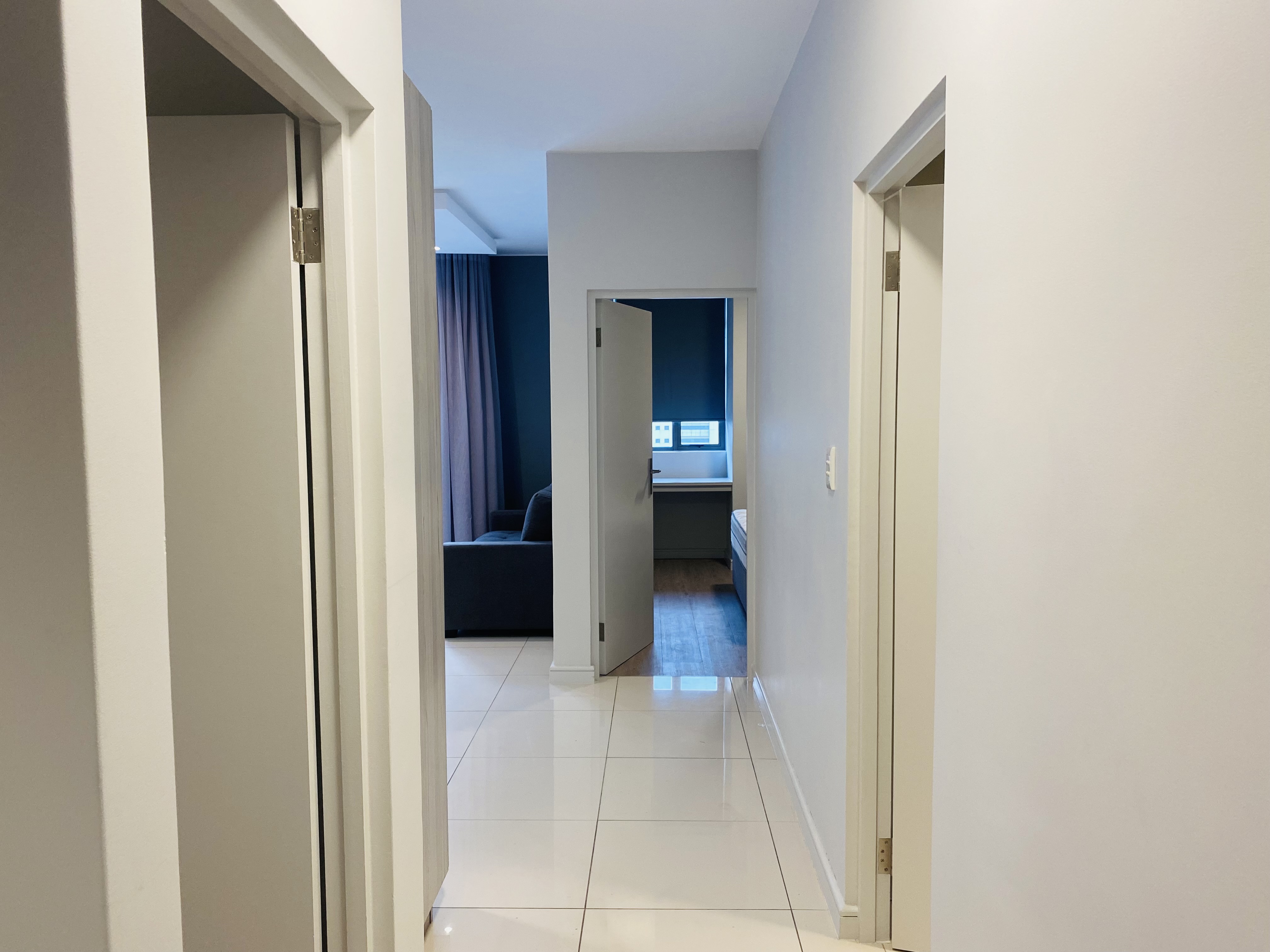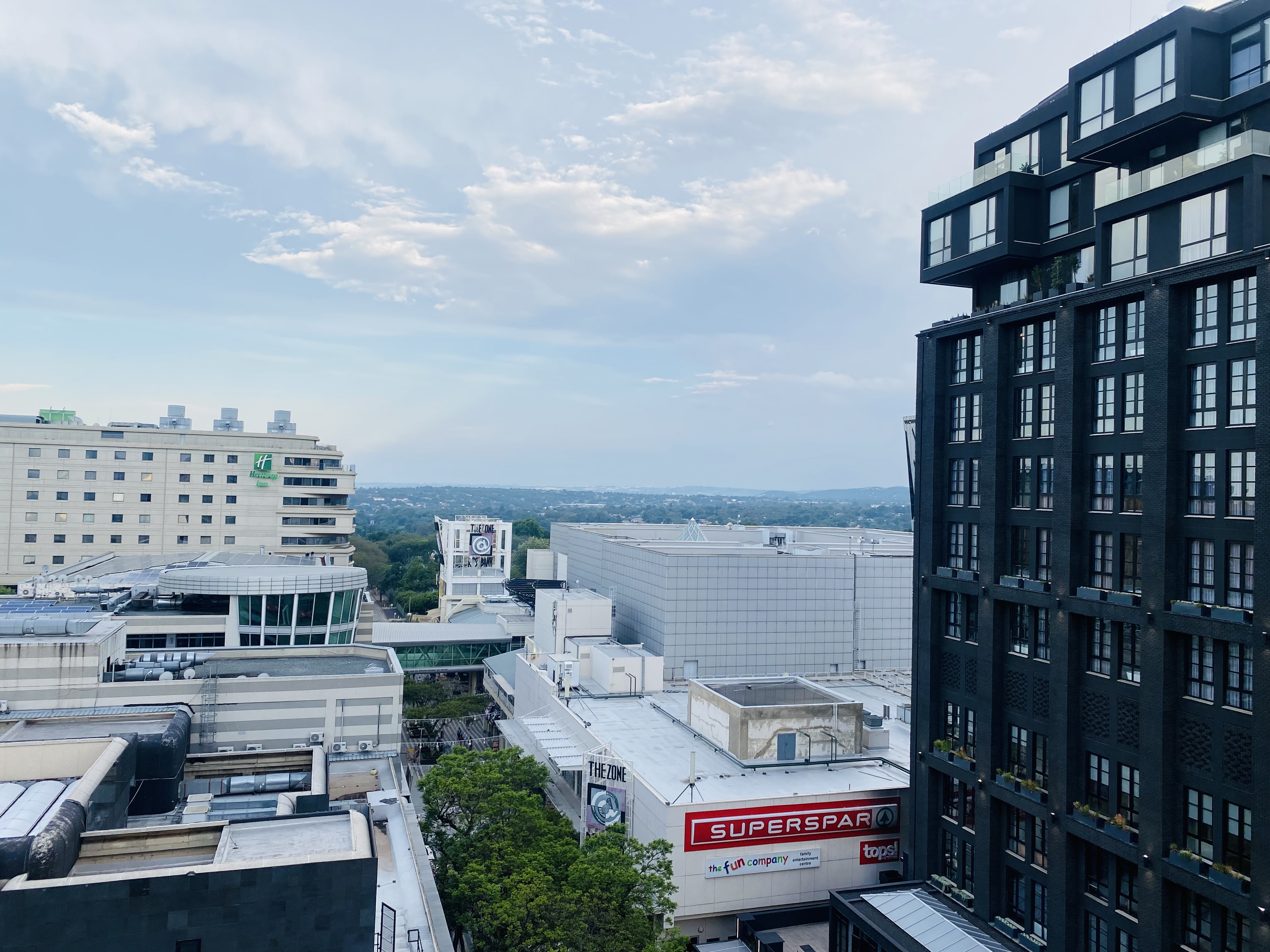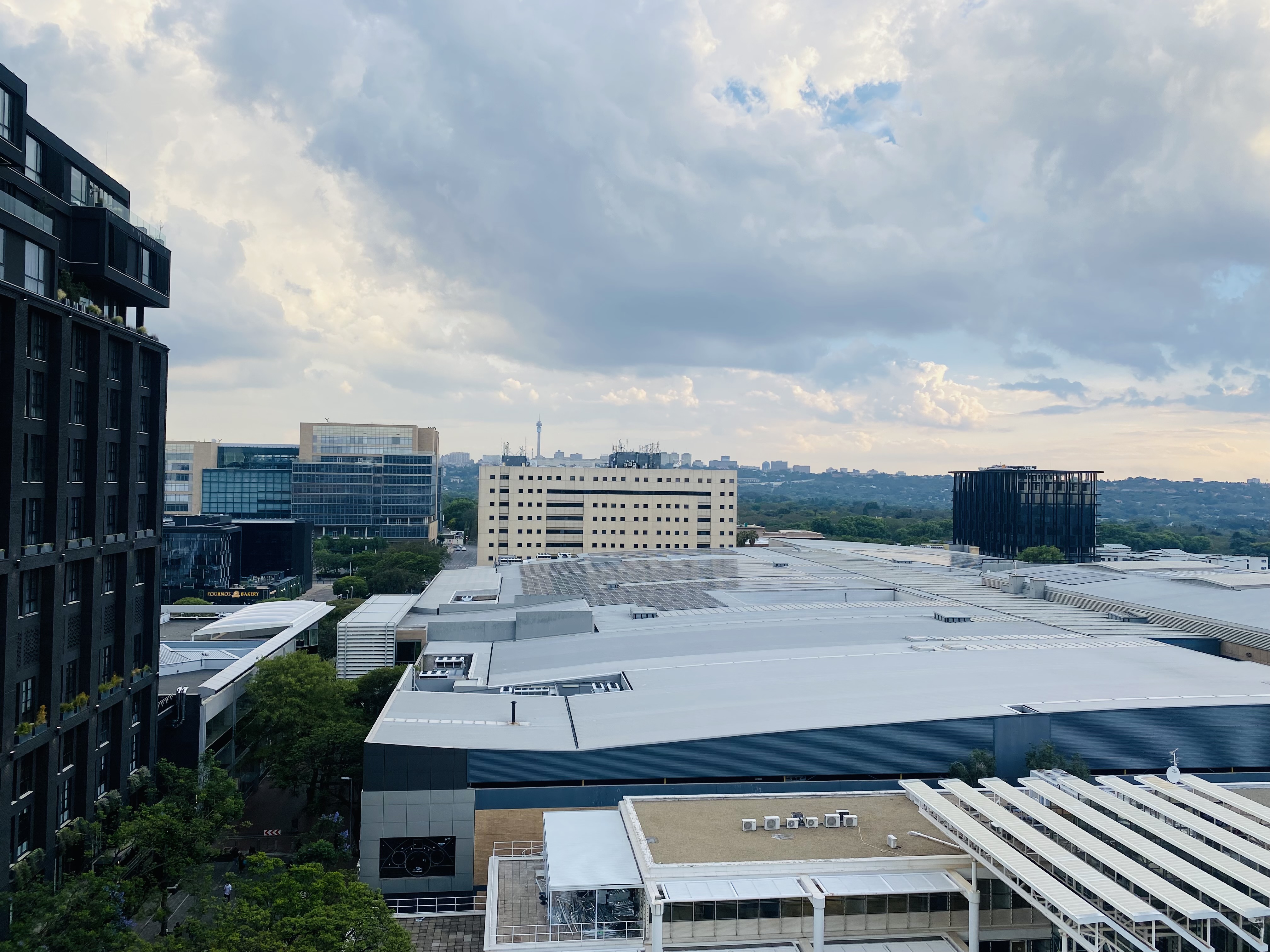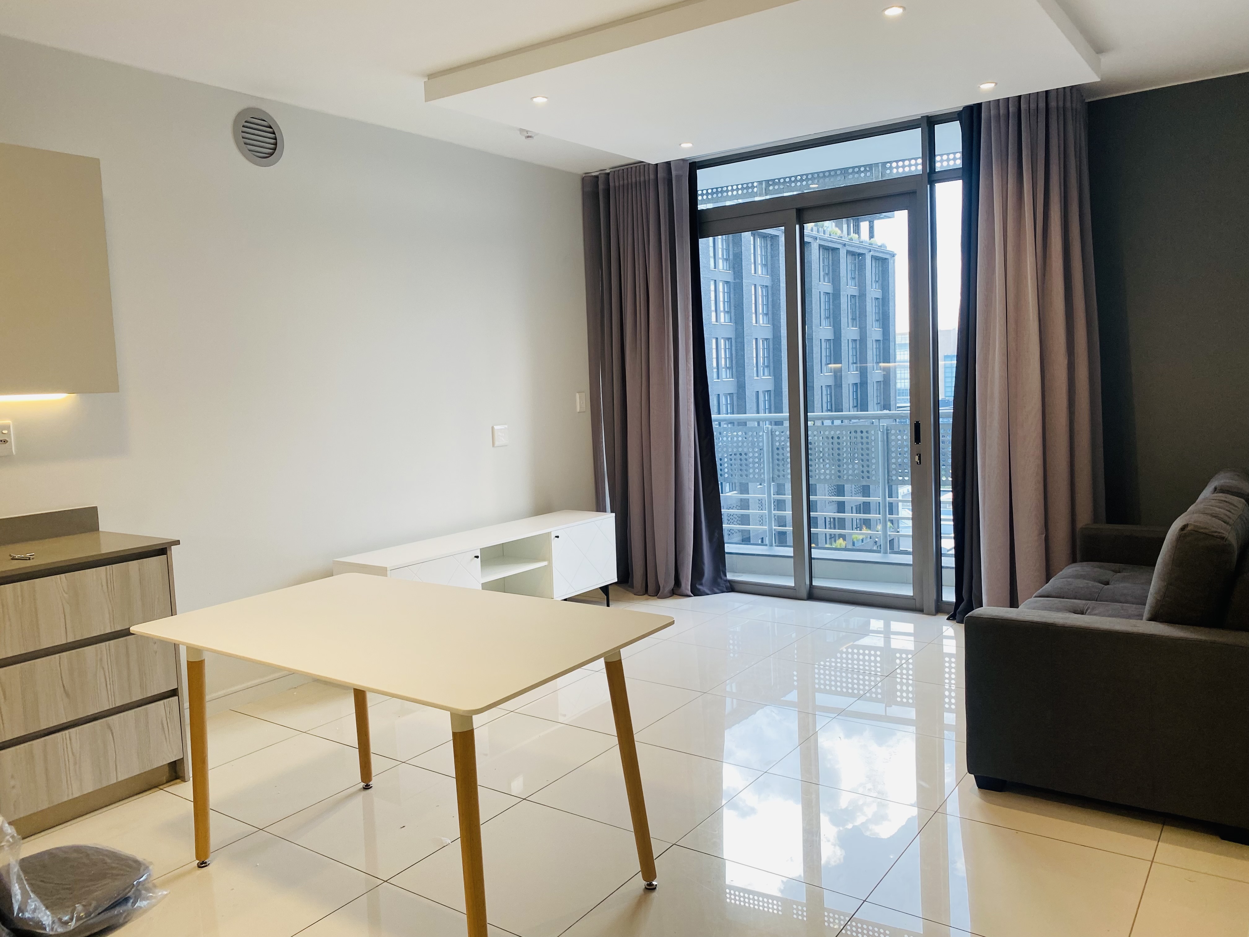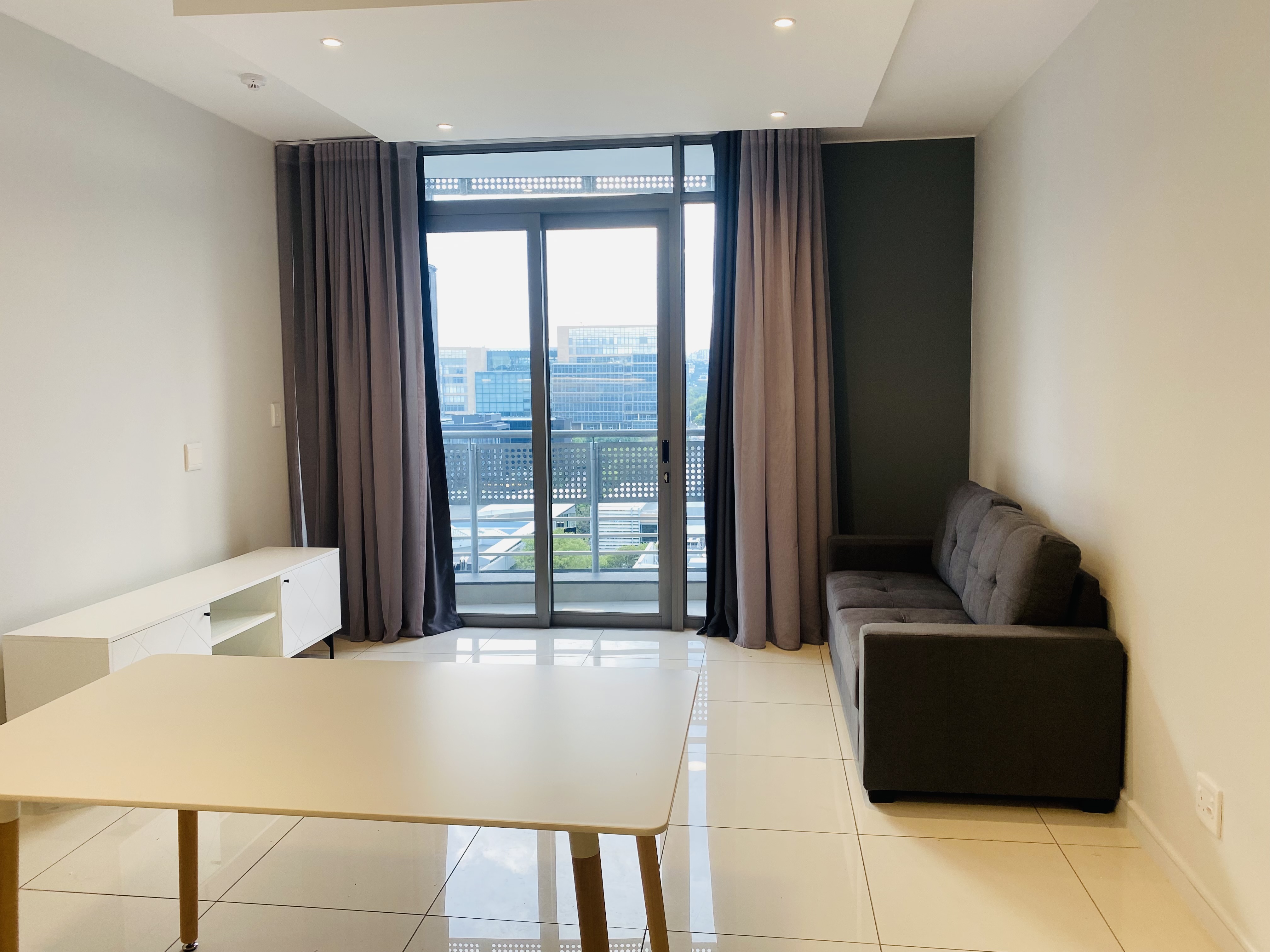 The sunny and spacious living area leads to the balcony with an amazing view of Rosebank.