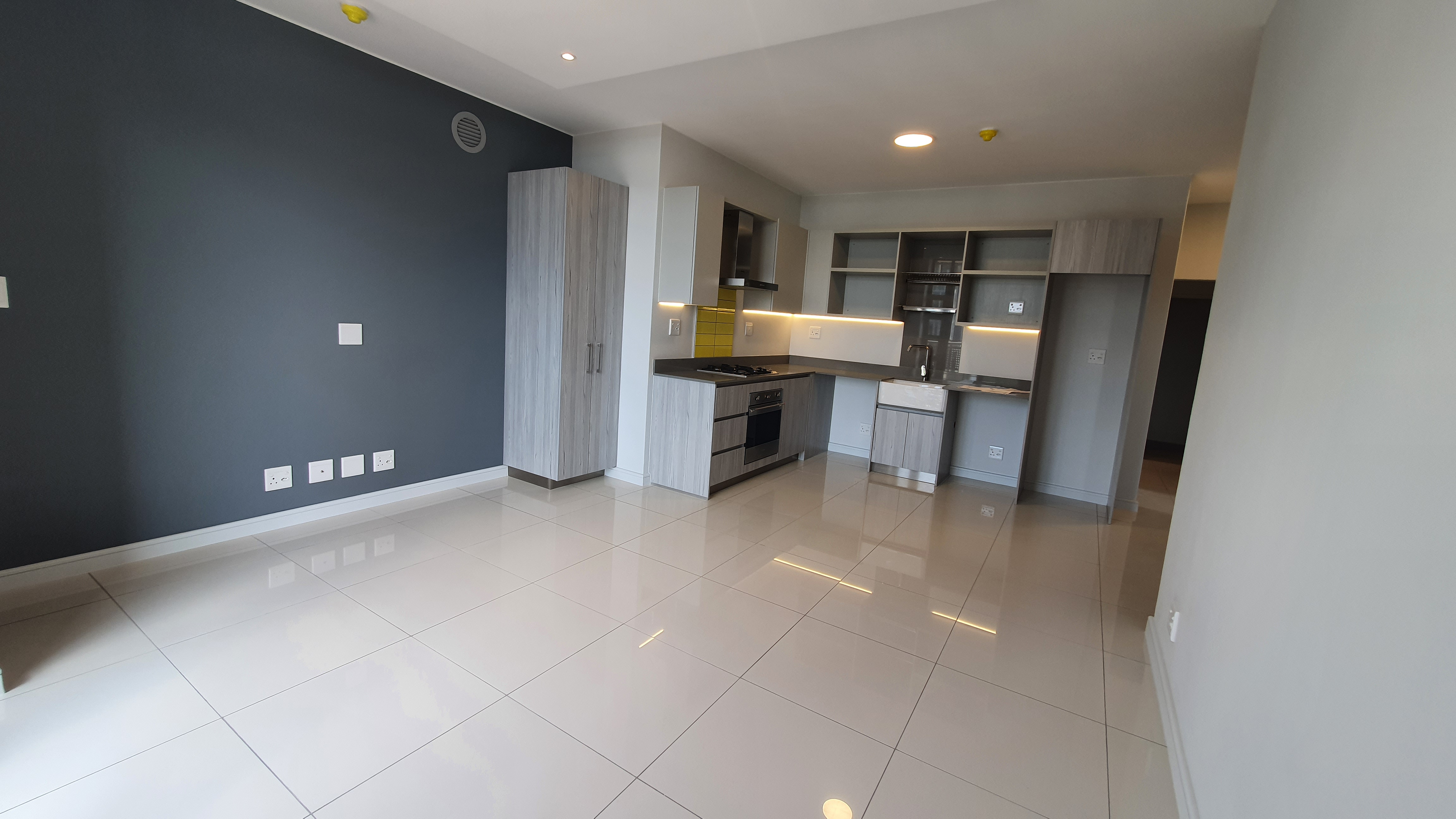 Open plan lounge, dining room, kitchen and a small balcony. The kitchen offers stone counter tops, 2 spaces for under counter wet appliances, gas hob, electric oven and extractor fan.