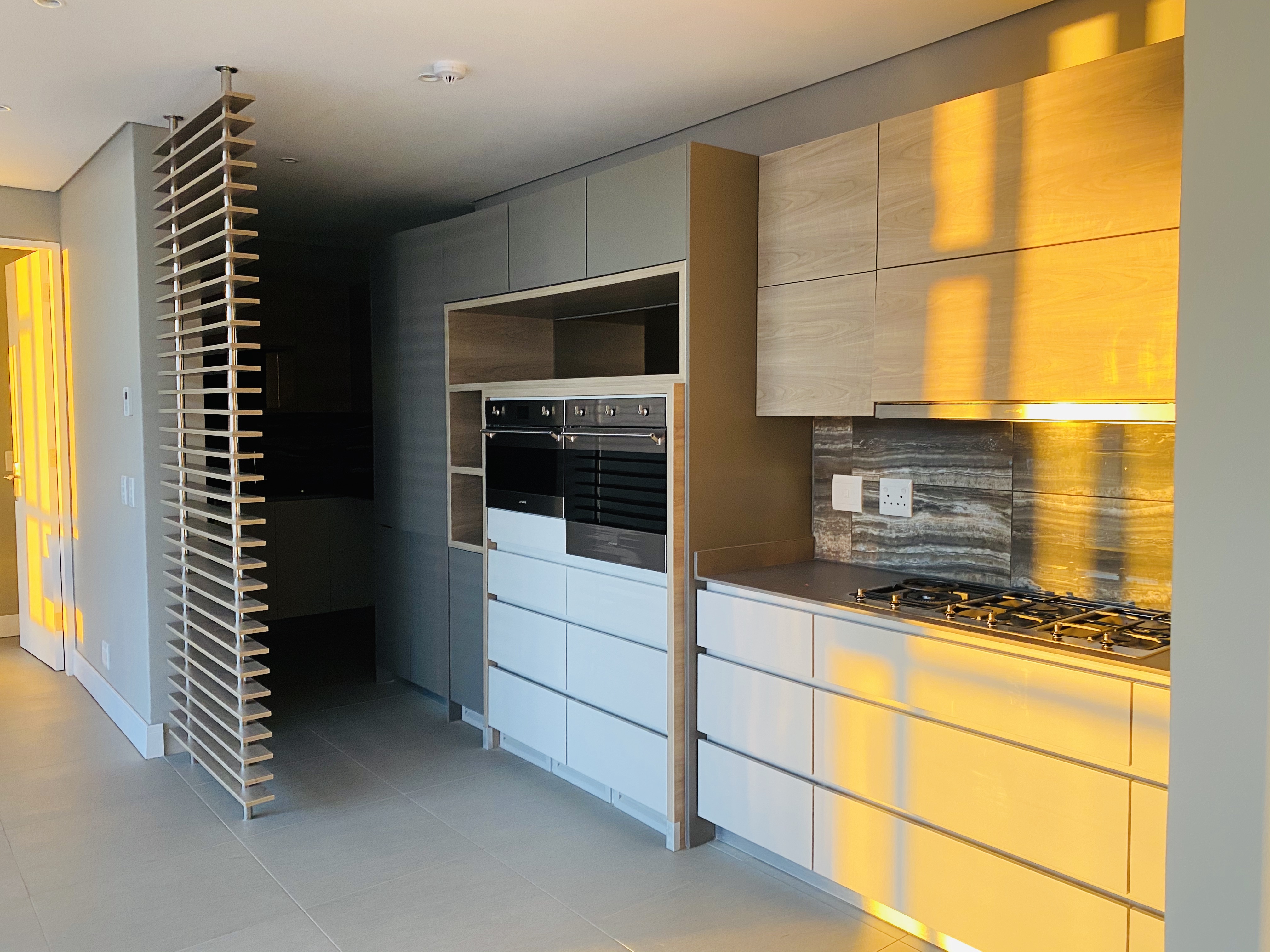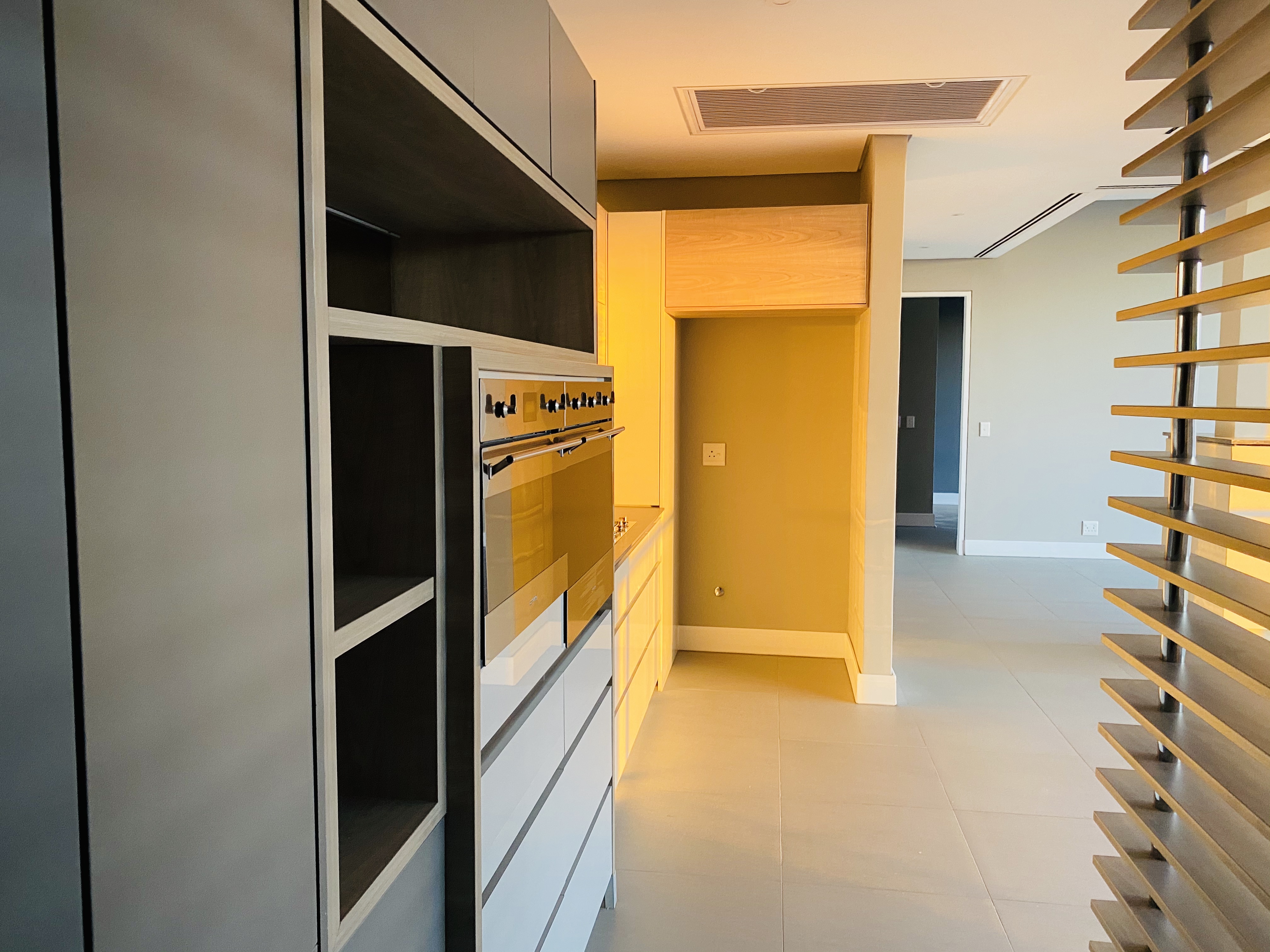 The kitchen boasts up-market finishes and is equipped with SMEG appliances, gas cooking facilities, volumes of kitchen cupboard space and space for 3 under-counter appliances with a separate scullery. Both bedrooms are sunny with floor-to-wall built-in cupboards and elegant en-suite bathrooms.