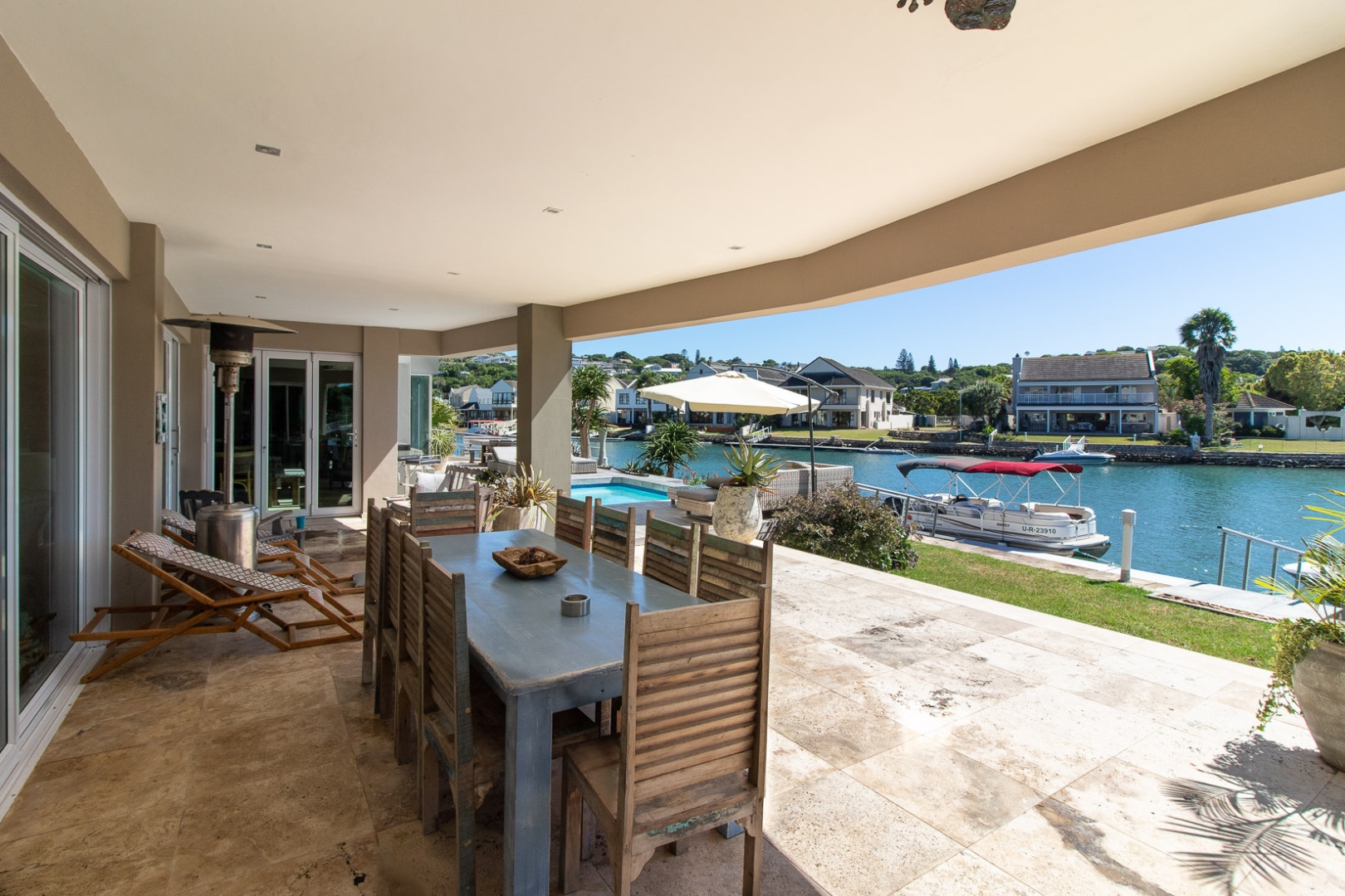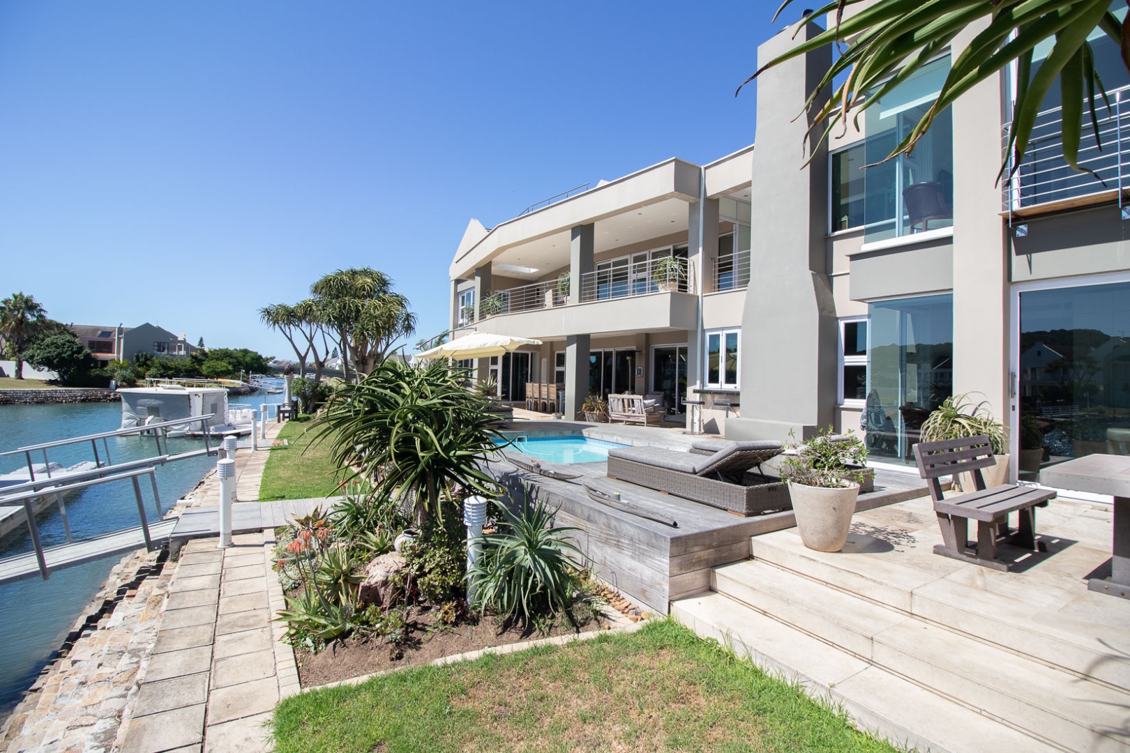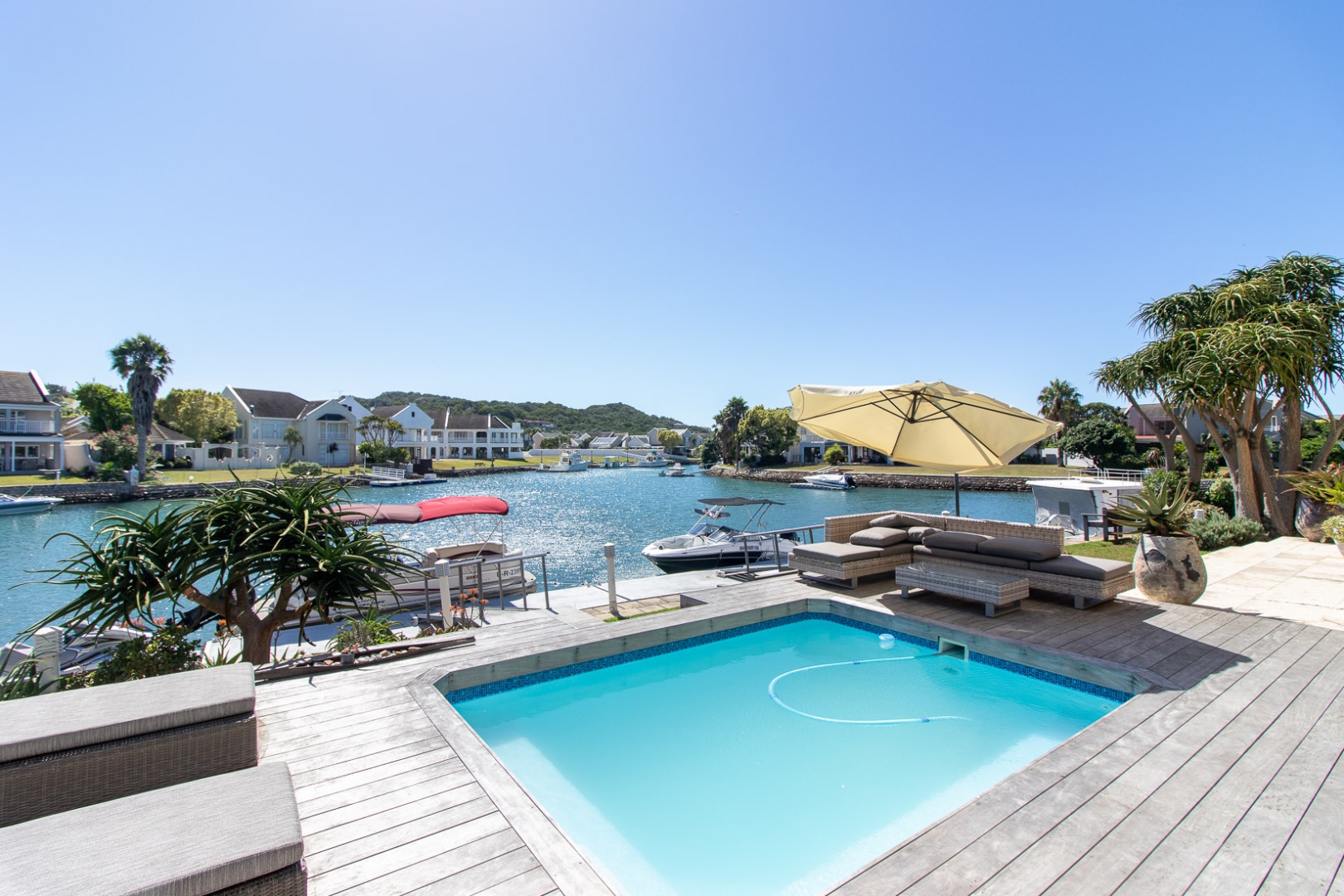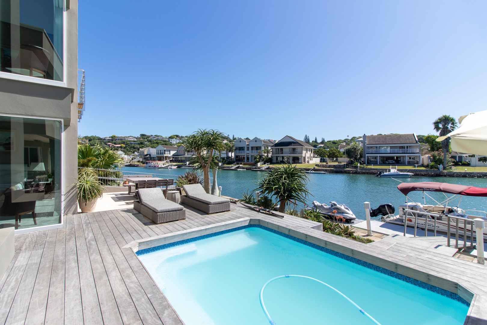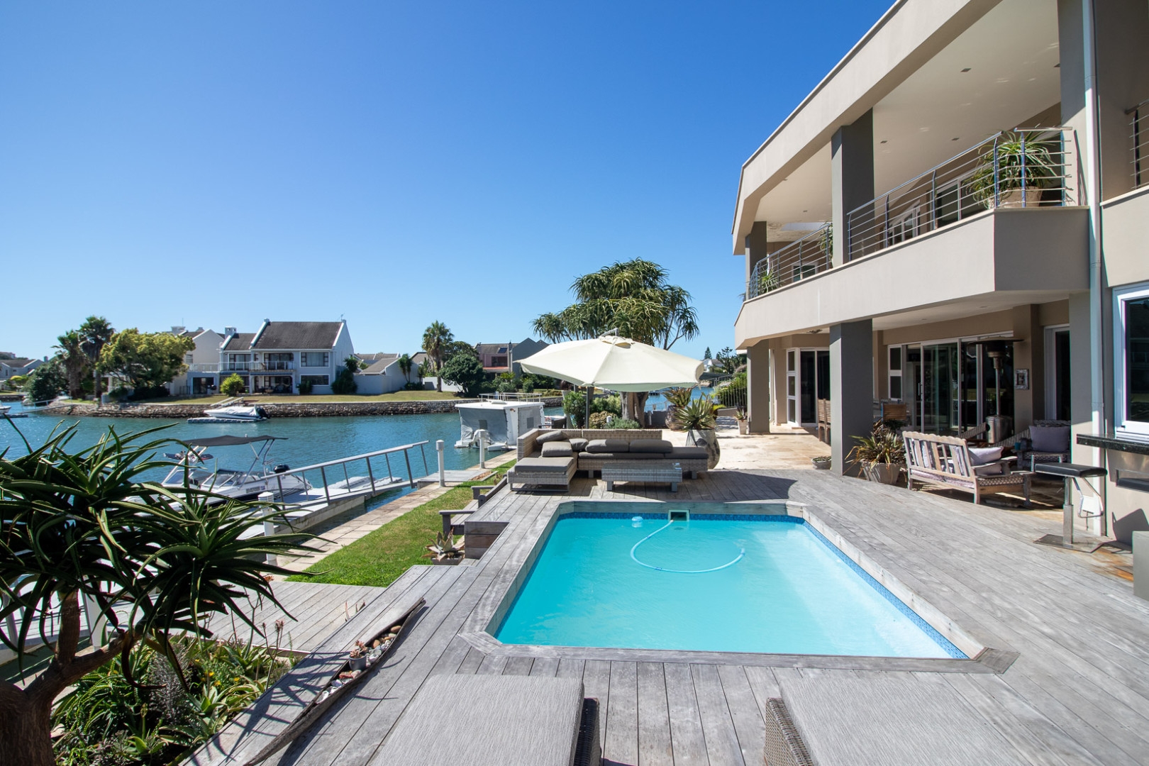 The open plan designer kitchen and scullery is well appointed with German brand Gaggenau appliances, instant boiling water taps, walk-in cool room and pantry, eye level oven, a teppanyaki solid cooking plate, gas hob, microwave and finished with granite counter tops imported from Norway. The outside undercover entertainment area is spacious and makes for easy entertaining, the splash pool is surrounded by a wooden deck and there is a private 12 meter double jetty to moor boats, barges and jet ski's. The modern bar and built in-braai is set off the entertainment area.