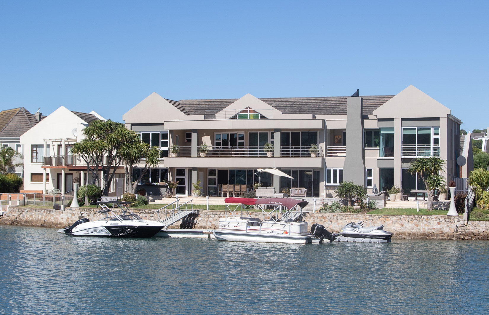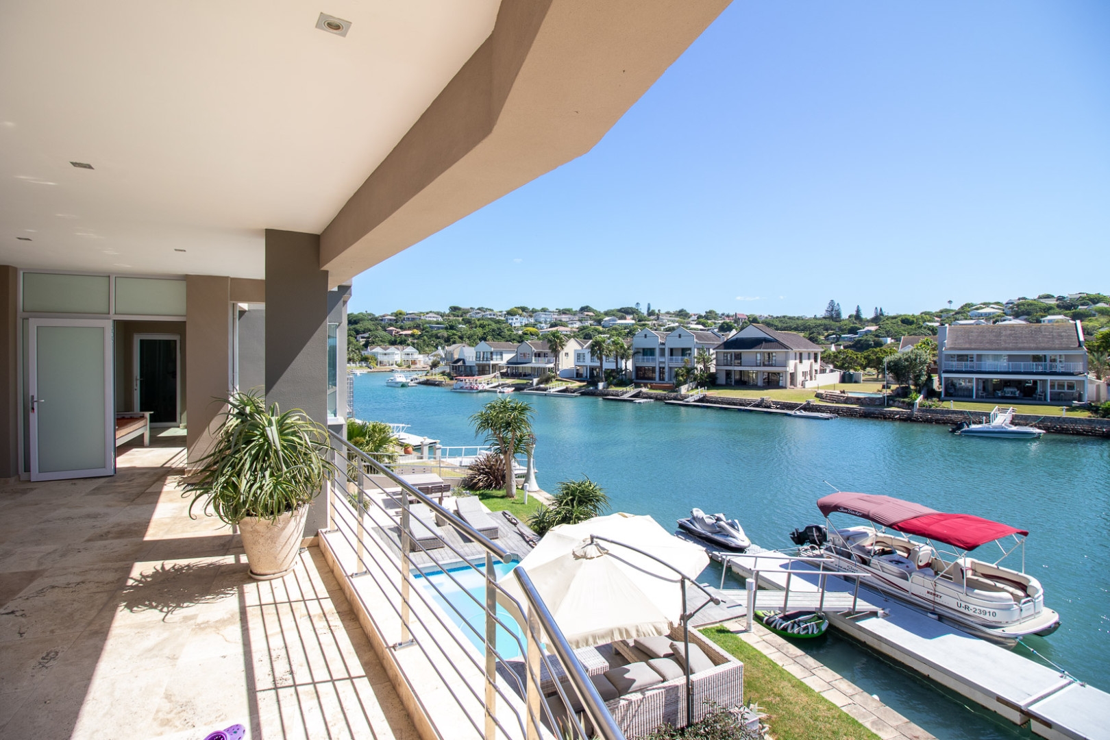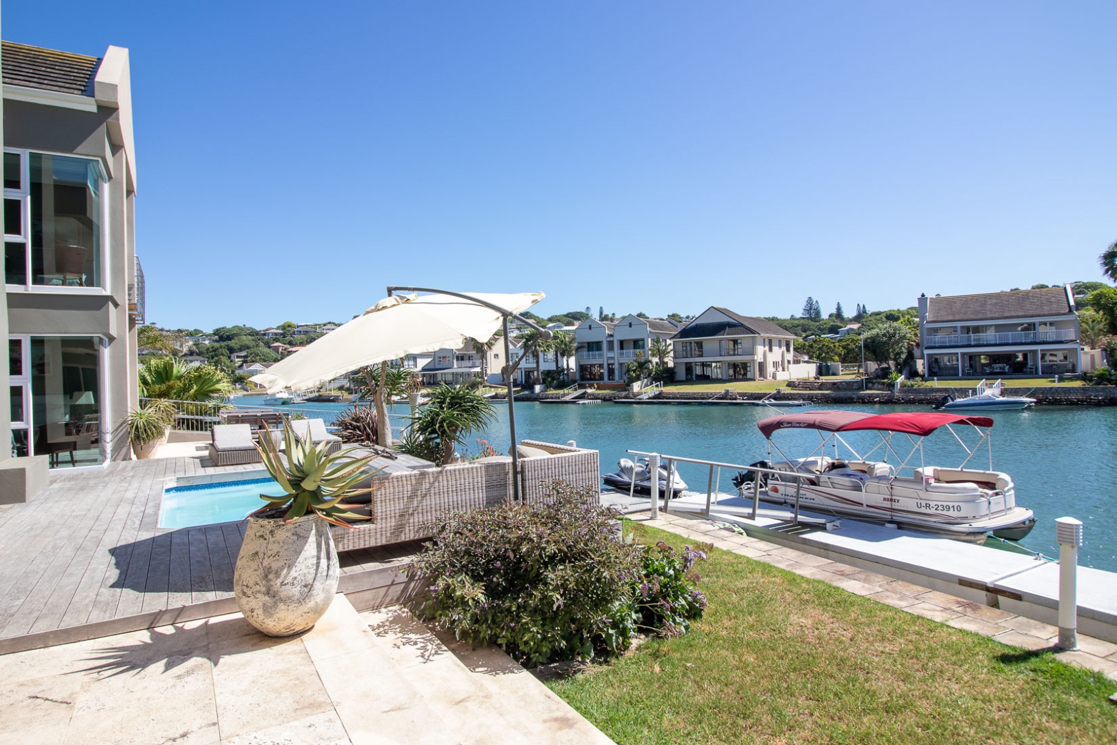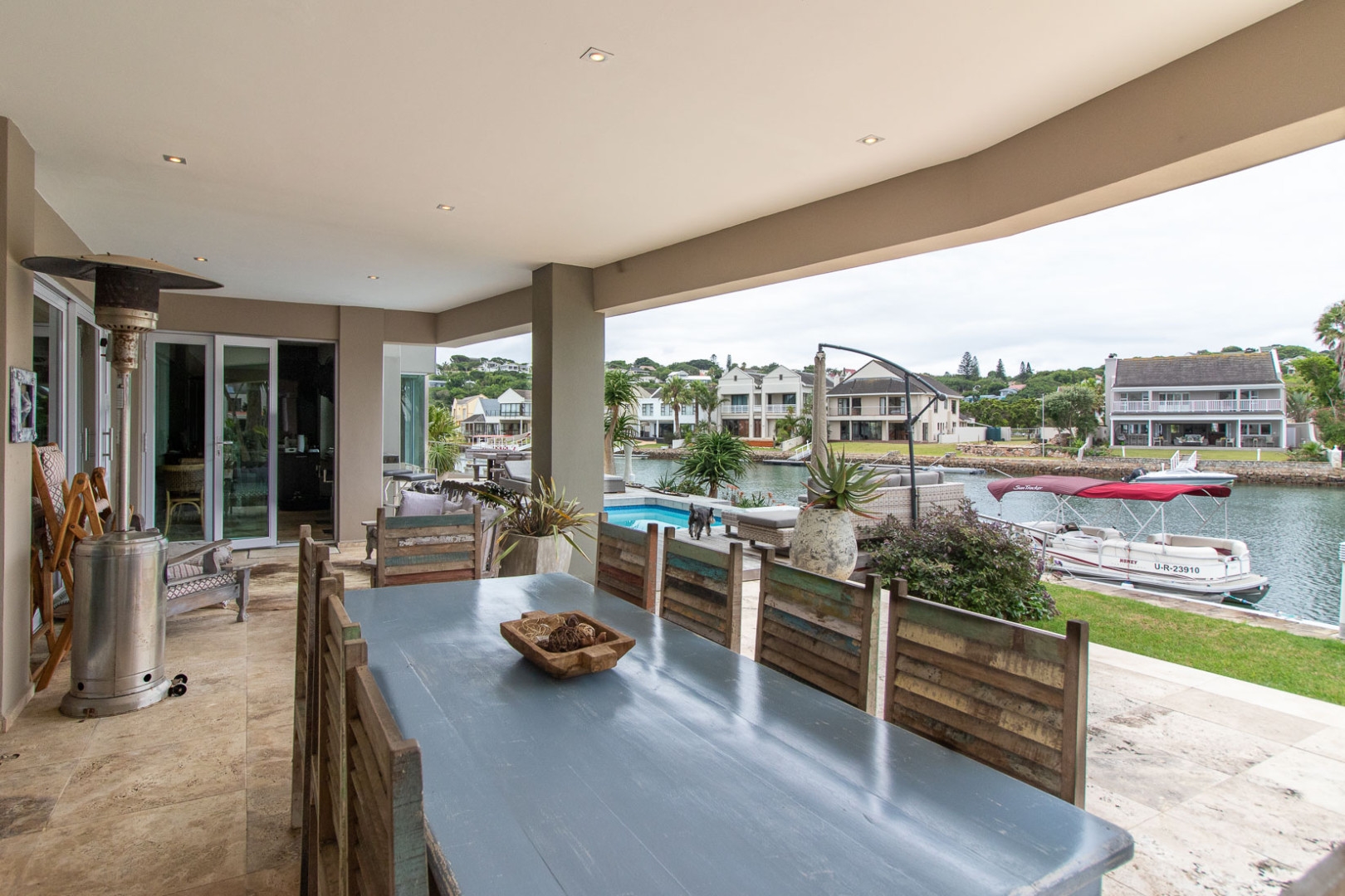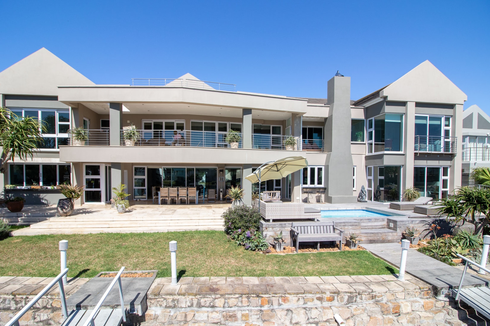 The open plan designer kitchen and scullery is well appointed with German brand Gaggenau appliances, instant boiling water taps, walk-in cool room and pantry, eye level oven, a teppanyaki solid cooking plate, gas hob, microwave and finished with granite counter tops imported from Norway. The outside undercover entertainment area is spacious and makes for easy entertaining, the splash pool is surrounded by a wooden deck and there is a private 12 meter double jetty to moor boats, barges and jet ski's. The modern bar and built in-braai is set off the entertainment area.