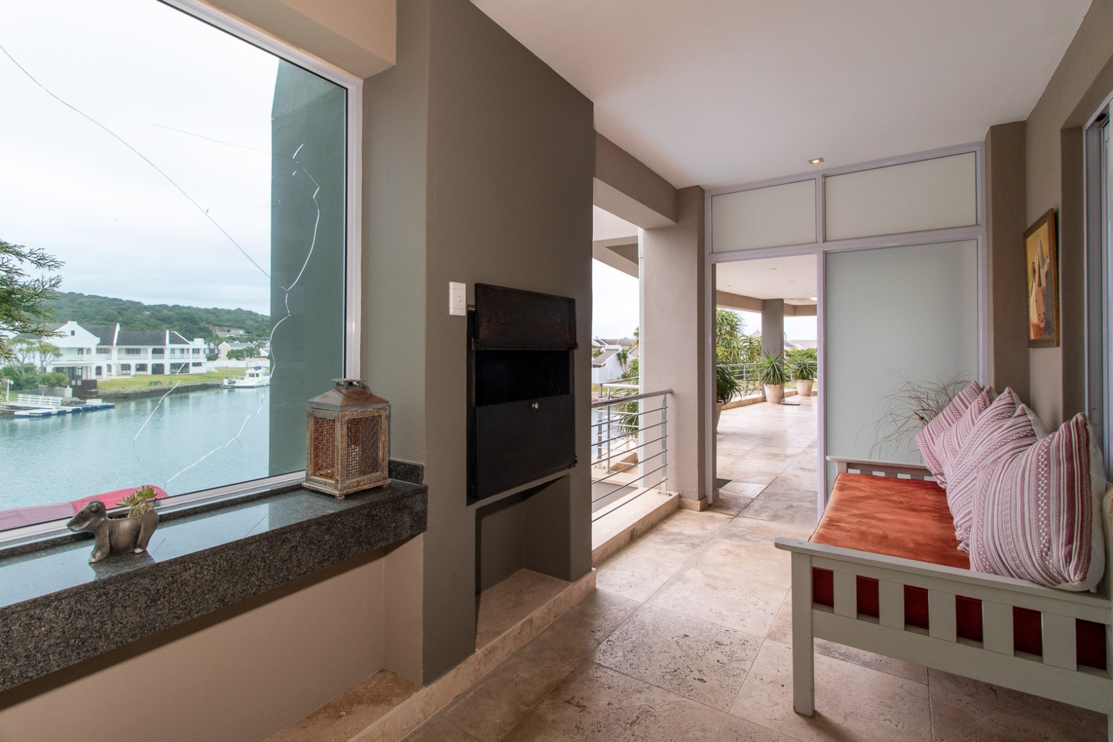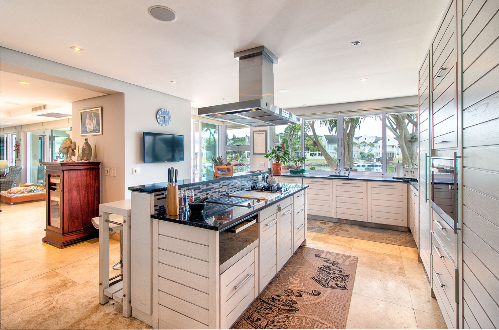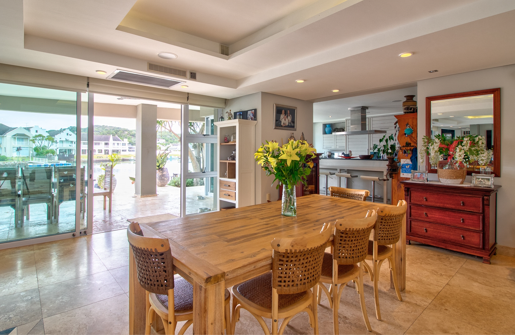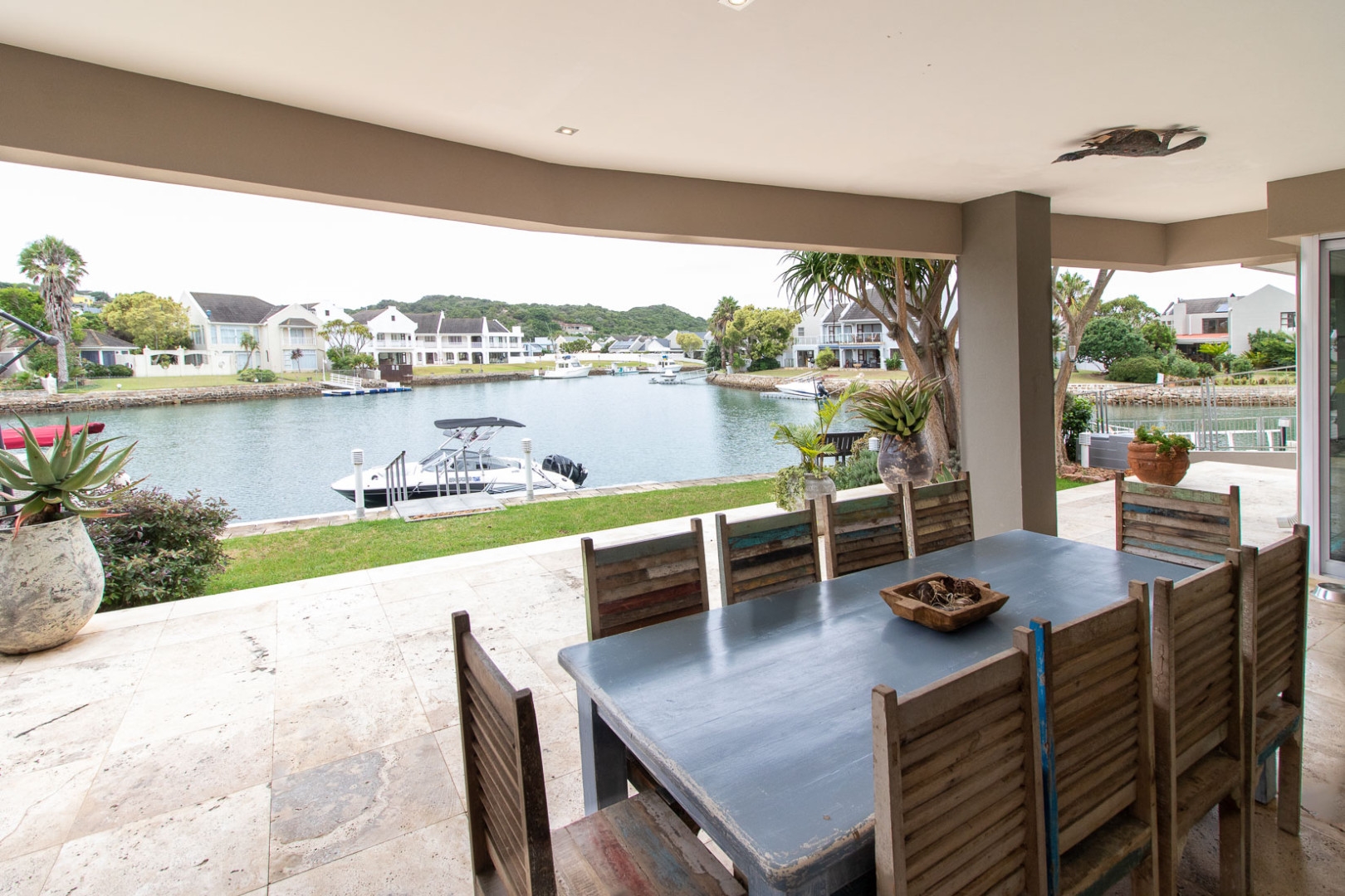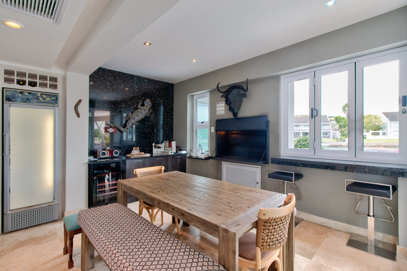 The open plan designer kitchen and scullery is well appointed with German brand Gaggenau appliances, instant boiling water taps, walk-in cool room and pantry, eye level oven, a teppanyaki solid cooking plate, gas hob, microwave and finished with granite counter tops imported from Norway. The outside undercover entertainment area is spacious and makes for easy entertaining, the splash pool is surrounded by a wooden deck and there is a private 12 meter double jetty to moor boats, barges and jet ski's. The modern bar and built in-braai is set off the entertainment area.