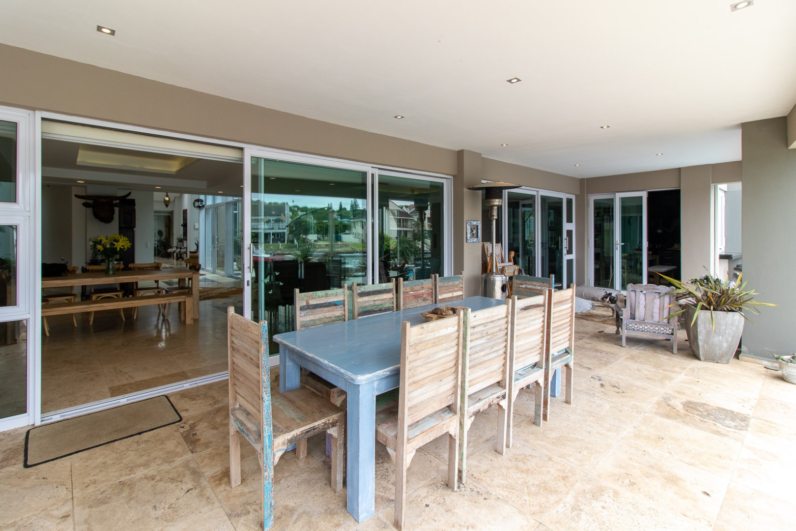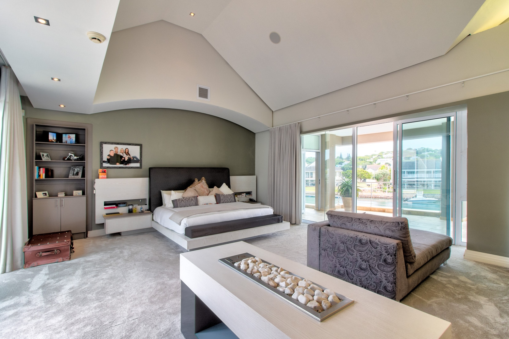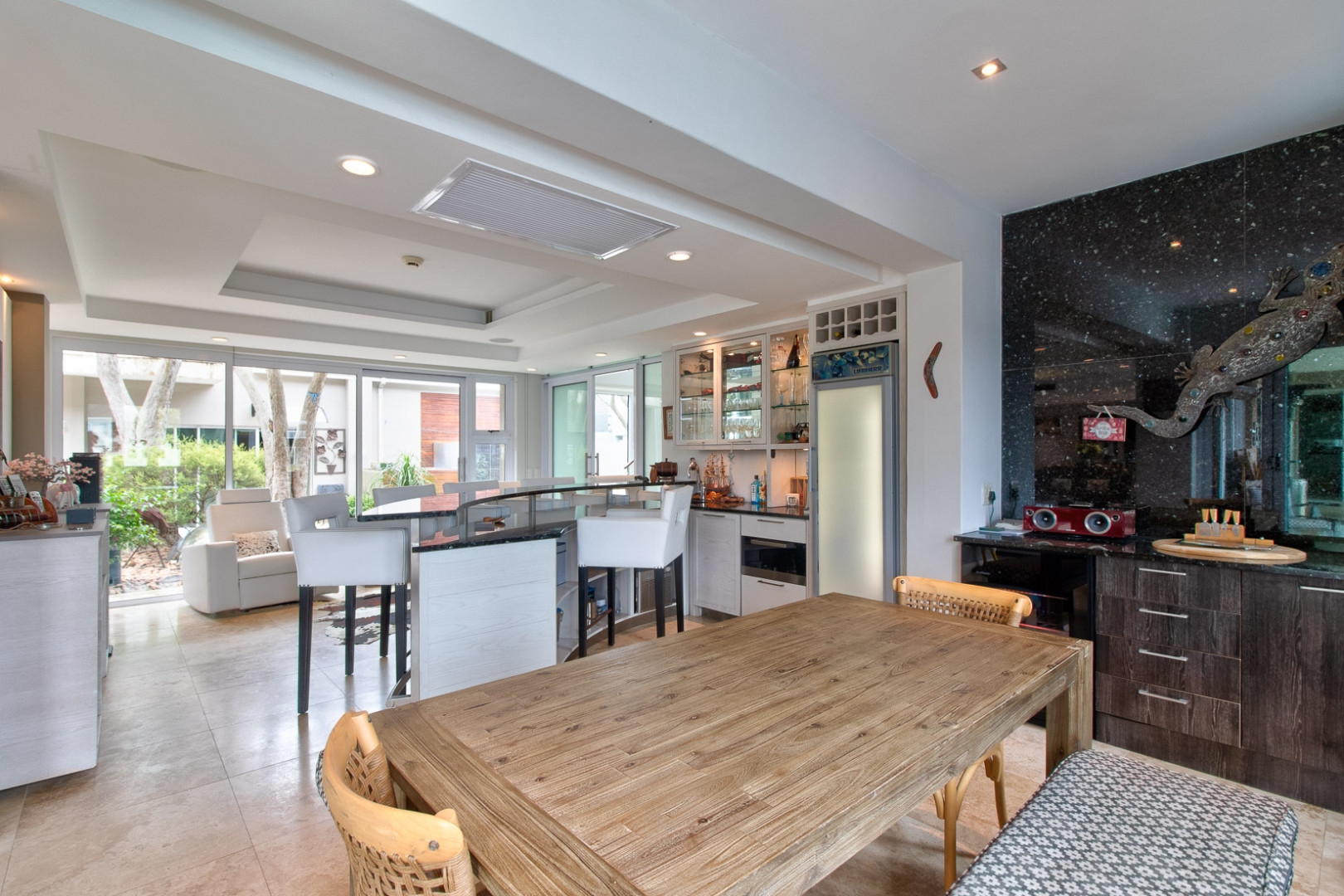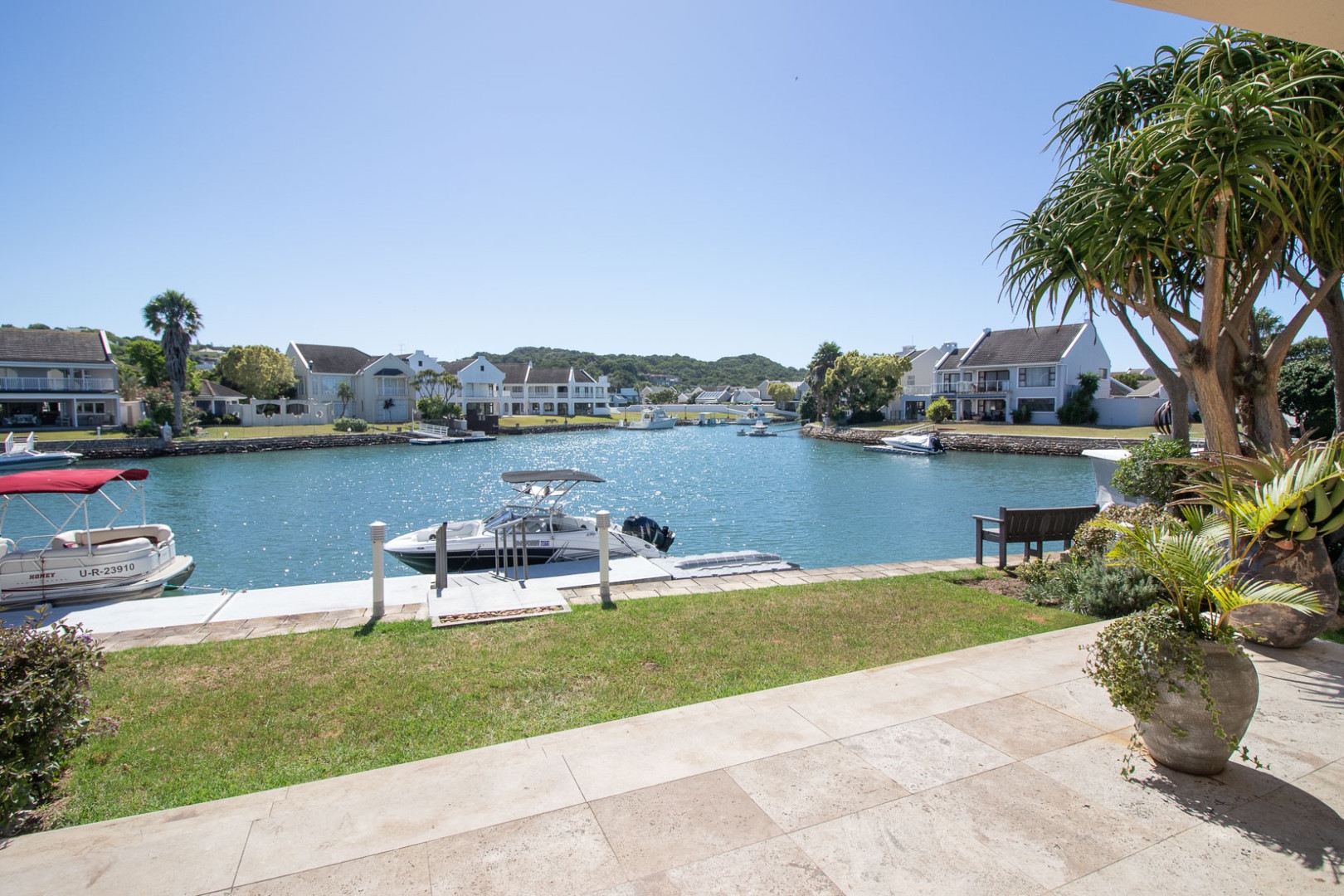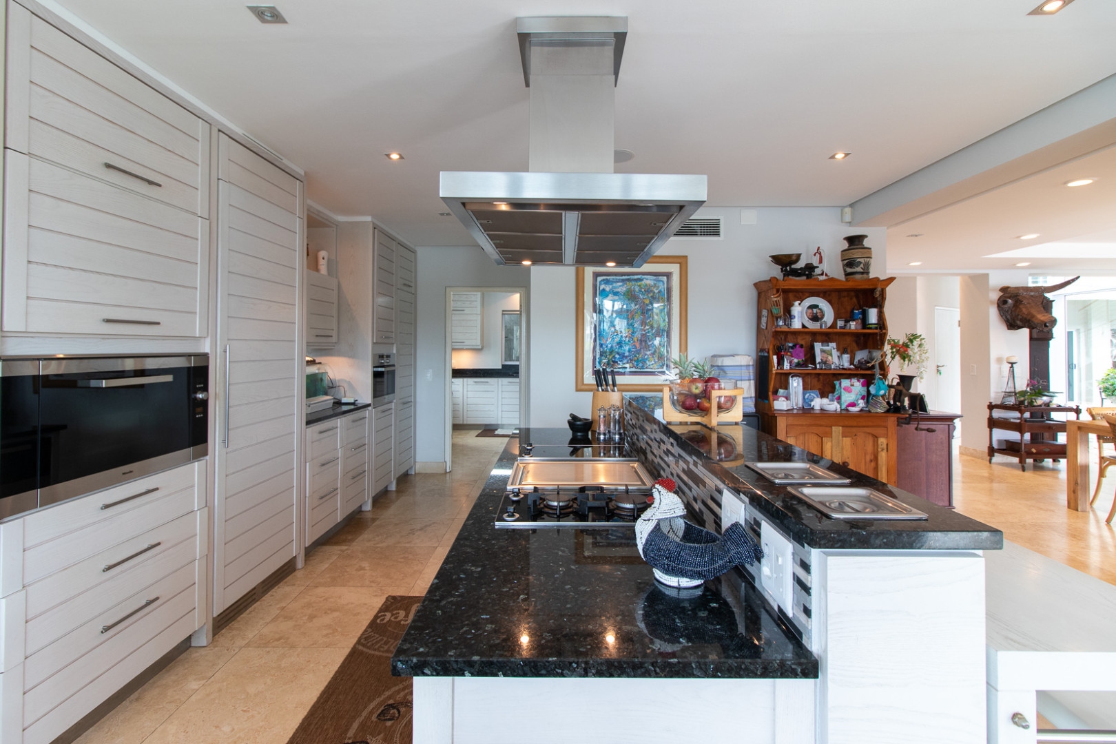 The open plan designer kitchen and scullery is well appointed with German brand Gaggenau appliances, instant boiling water taps, walk-in cool room and pantry, eye level oven, a teppanyaki solid cooking plate, gas hob, microwave and finished with granite counter tops imported from Norway. The outside undercover entertainment area is spacious and makes for easy entertaining, the splash pool is surrounded by a wooden deck and there is a private 12 meter double jetty to moor boats, barges and jet ski's. The modern bar and built in-braai is set off the entertainment area.