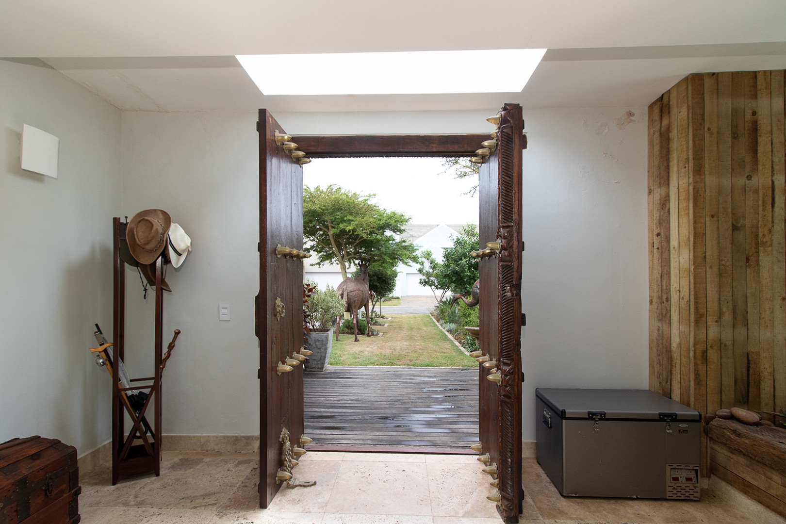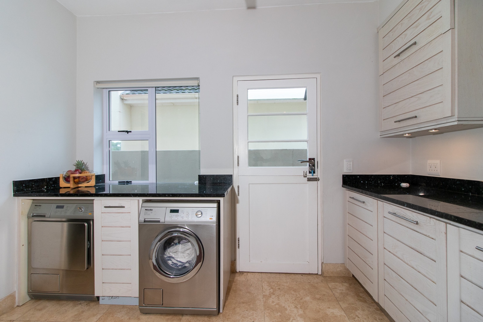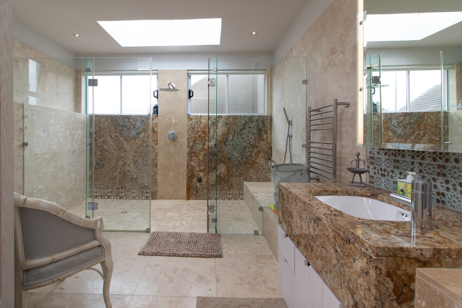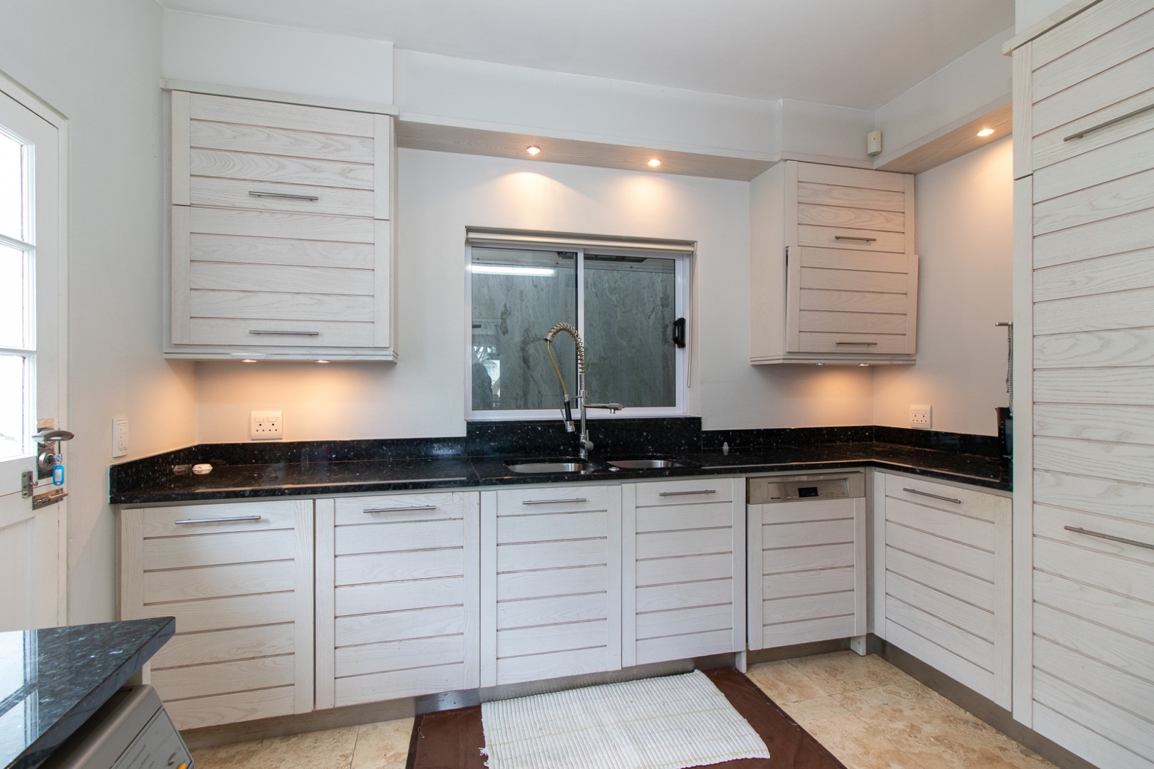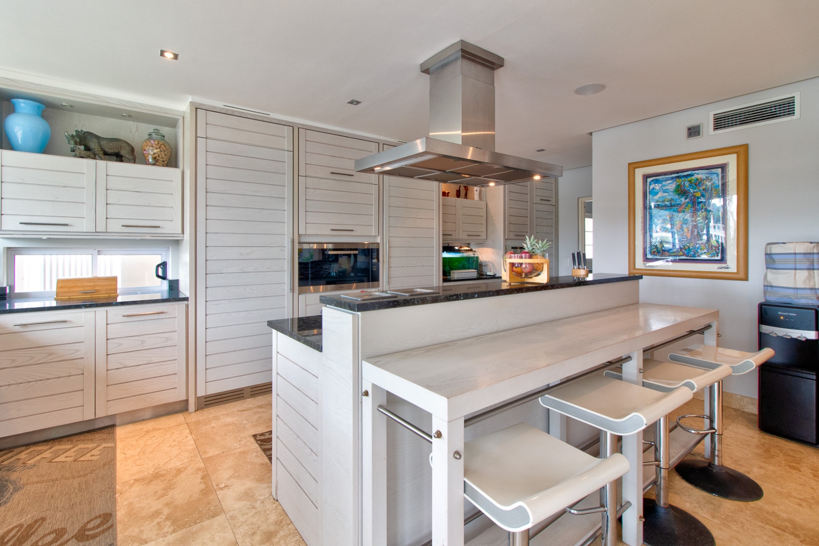 The open plan designer kitchen and scullery is well appointed with German brand Gaggenau appliances, instant boiling water taps, walk-in cool room and pantry, eye level oven, a teppanyaki solid cooking plate, gas hob, microwave and finished with granite counter tops imported from Norway. The outside undercover entertainment area is spacious and makes for easy entertaining, the splash pool is surrounded by a wooden deck and there is a private 12 meter double jetty to moor boats, barges and jet ski's. The modern bar and built in-braai is set off the entertainment area.
